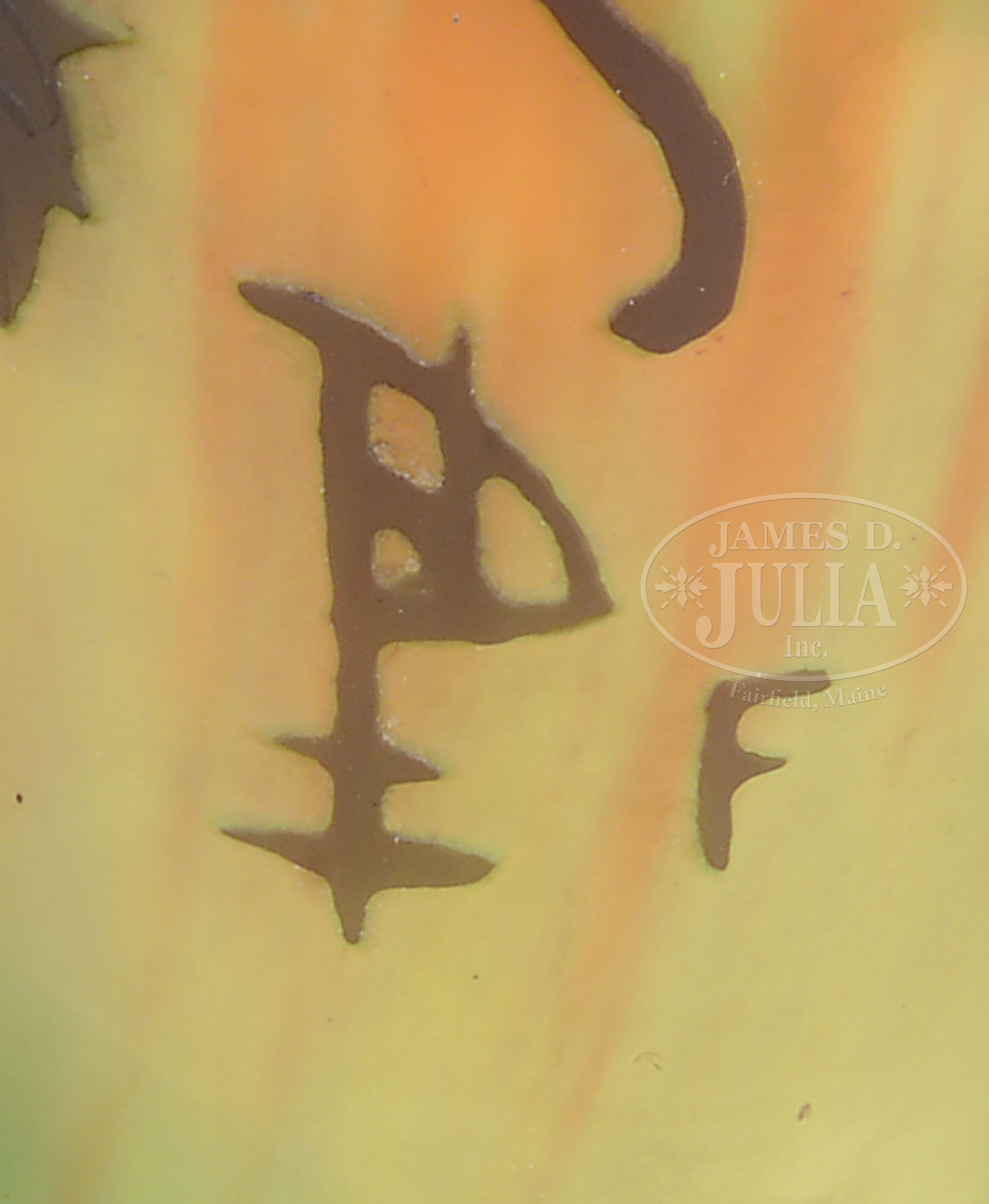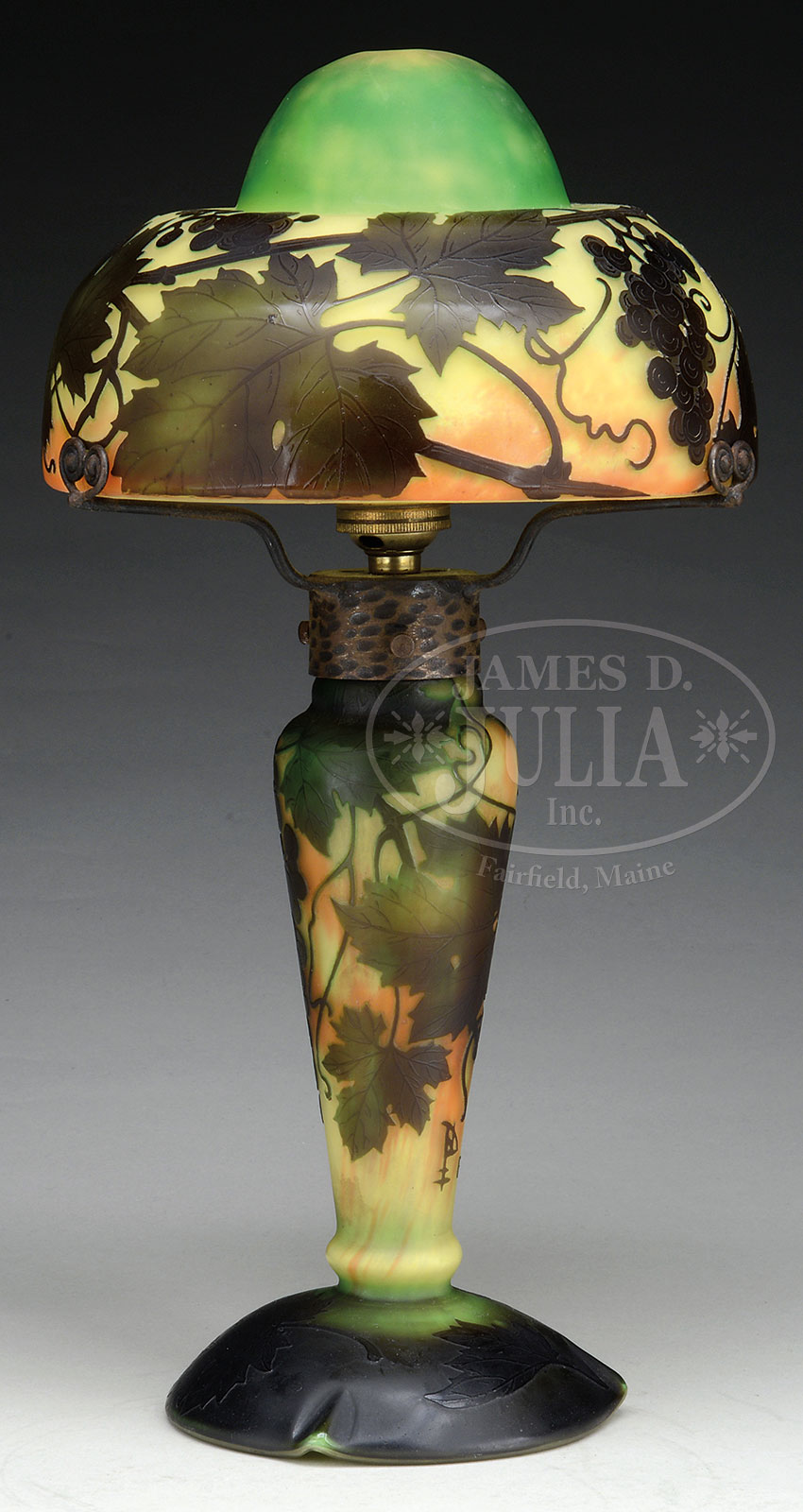 DAUM CAMEO GRAPEVINE TABLE LAMP.Daum table lamp has olive green cameo decoration of grapevines, leaves and grape clusters surrounding the shade and base all against a mottled yellow, orange and green shaded background. The lamp is finished with a hammered iron collar and three armed spider with curlicue ends. The shade is signed on the side in cameo “Daum Nancy” with the Cross of Lorraine, “France”. The base is signed on the side of the stem with entwined letters “D N” along with the Cross of Lorraine and the letter “F”. SIZE: 14-1/2″ t. PROVENANCE: From an Unreserved Connecticut collection. CONDITION: Very good to excellent. Rewired with contemporary plastic cord. Cord has a European plug. 52774-21 (4,000-6,000) – Lot 1040