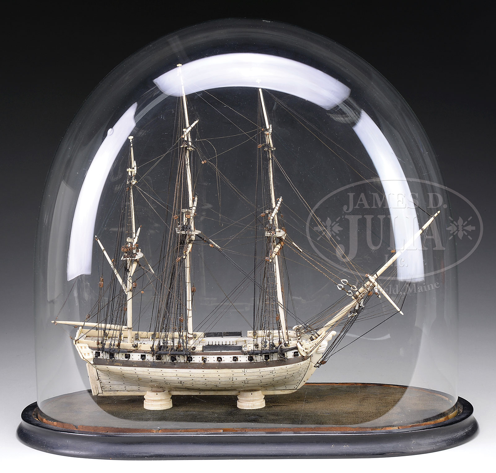 NAPOLEONIC PRISONER OF WAR BONE MODEL OF A 48 GUN FRIGATE.1st quarter 19th century, England. This small model most likely made by French prisoners during the Napoleonic Wars while captive in Great Britain. Mounted in a domed glass case. The 3-masted frigate with planked bone decking and hull of pinned construction mounted with 48 guns on two decks. Model made with twisted silk or baleen strung rigging with well detailed fantail and female figurehead. Note: The war between Napoleon’s French Navy and the naval forces of England lasted so long that the captured French prisoners had to find ways to pass the time. Although the British did not treat them as convicts, they were confined to prison hulks, old castles or purpose built prison camps such as Dartmoor. Their captors encouraged the prisoners to form their own groups or guilds to produce small objects of art to sell in the camp’s civilian markets. Among the most popular were ship models that they created representing British naval ships of the period. French prisoners of war obtained beef and mutton bones from the food rations issued to them. After gathering bones for use in model building, prisoners boiled the bones and bleached them in the sun, to make the bones easier to shape and carve. In addition to cattle and mutton bones, prisoners made use of their own hair to fashion sail rigging, and tissue paper to create sails. SIZE: Model: 14″ h x 15-1/2″ l. Dome: 16-1/2″ h x 17-3/4″ l x 8″ approx. w. PROVENANCE: Contents of a lifetime collection “Brook Crossing,” South Pomfret, VT. CONDITION: Glass dome and velvet covered base original and in good condition. The model is sound. Rigging generally complete. One area of rigging in disrepair on main mast beneath top gallant spar. Generally very good overall. Special Note: This item(s) contains plant or animal properties that may be covered by the Endangered Species Act (ESA). Please read the Conditions of Sale, section 15, for more information regarding the Endangered Species Act, and your responsibilities as a buyer. 52806-213 (5,000-10,000) ESA – Lot 2205