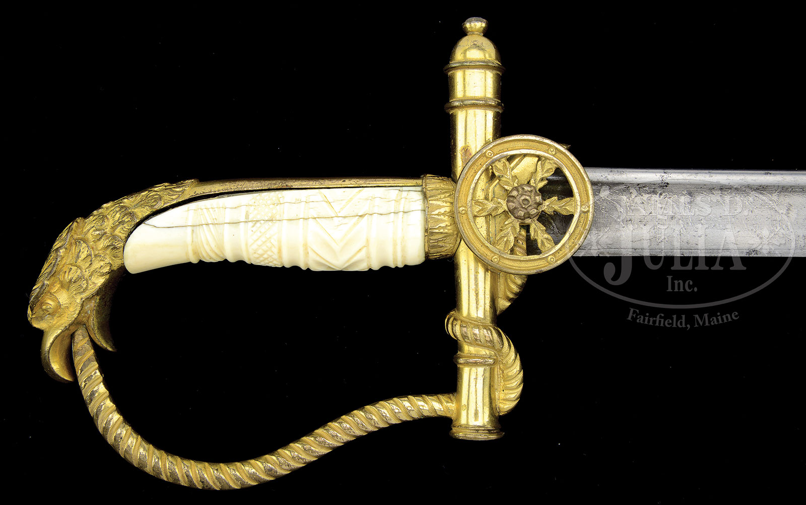 Please Note: The last 5″ of b lade replaced with welded repair. RARE AND UNIQUE AMERICAN EAGLE POMMEL ARTILLERY OFFICER’S SWORD WITH ARTICULATED CANNON CROSS GUARD.This unique Spies, NY marked sword has Damascene quill back 28-3/4″ blade. Carved ivory grip, eagle head pommel, fine engraved gilded scabbard with Liberty cap and American Indian. The unique and most unusual feature of this sword is the cannon barrel cross guard on partial carriage with articulating wheels. This is the only example that we are aware and most likely custom made. CONDITION: Very good to fine overall. Blade is overall grey with staining and pinprick pitting showing clear Damascene patterns, etched “SPIES”. Scabbard throat has unusual arc which precisely fits the underside of the carriage cross guard with the still turnable gilded carriage wheels. Scabbard and hilt retain about 80% of their orig gold plate with sharp engraved panels. Carved ivory grip has several hairlines with hand worn patina. Special Note: This item(s) contains plant or animal properties that may be covered by the Endangered Species Act (ESA). Please read the Conditions of Sale, section 15, for more information regarding the Endangered Species Act, and your responsibilities as a buyer. 52865-21 JS (4,000-6,000) ESA – Lot 3073