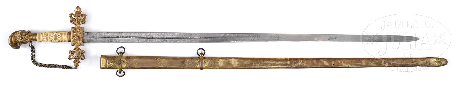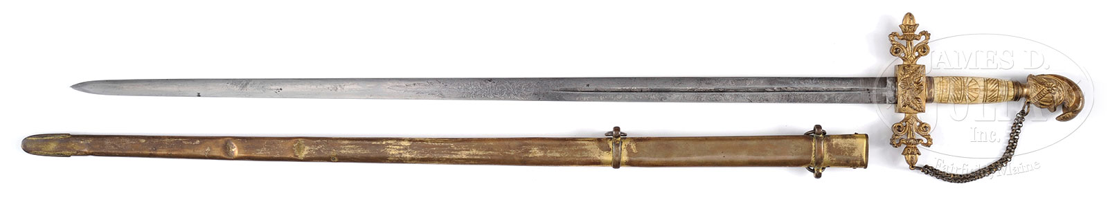 ANTEBELLUM CRUCIFORM MILITIA SWORD, ORNATE CROSS GUARD WITH CENTRAL RAISED RELIEF EAGLE MOTIF.Unusual pattern of Mexican War era militia sword with 31″ double-edged blade, with etched American motifs and most unusual heavy relief cast 6″ cross guard with large rectangular central block with raised relief American eagle and shield. Sword exhibits carved bone grip, knights head pommel, double chain knuckle bow, solid brass engraved scabbard with sword rings and frog button. CONDITION: Very good overall. Blade is overall grey with some orig luster. Hilt and scabbard retain about 30% orig gold plate. Scabbard has several scattered dents. Carved bone grip has hand worn patina. 52865-46 JS (800-1,200) – Lot 3098
