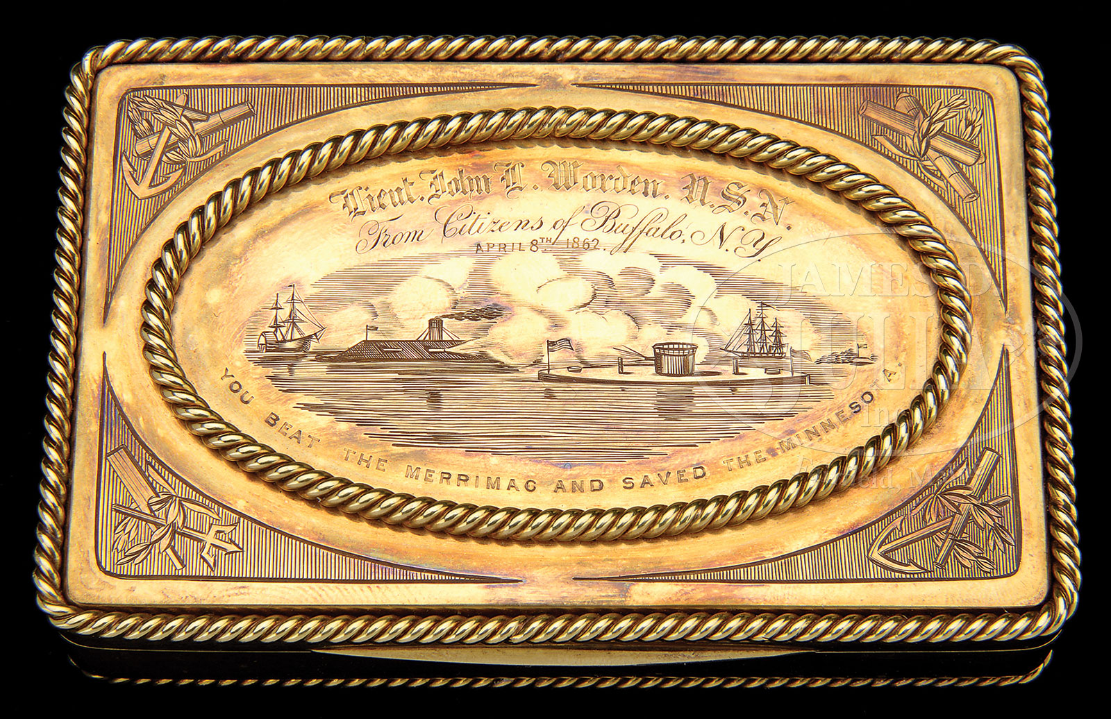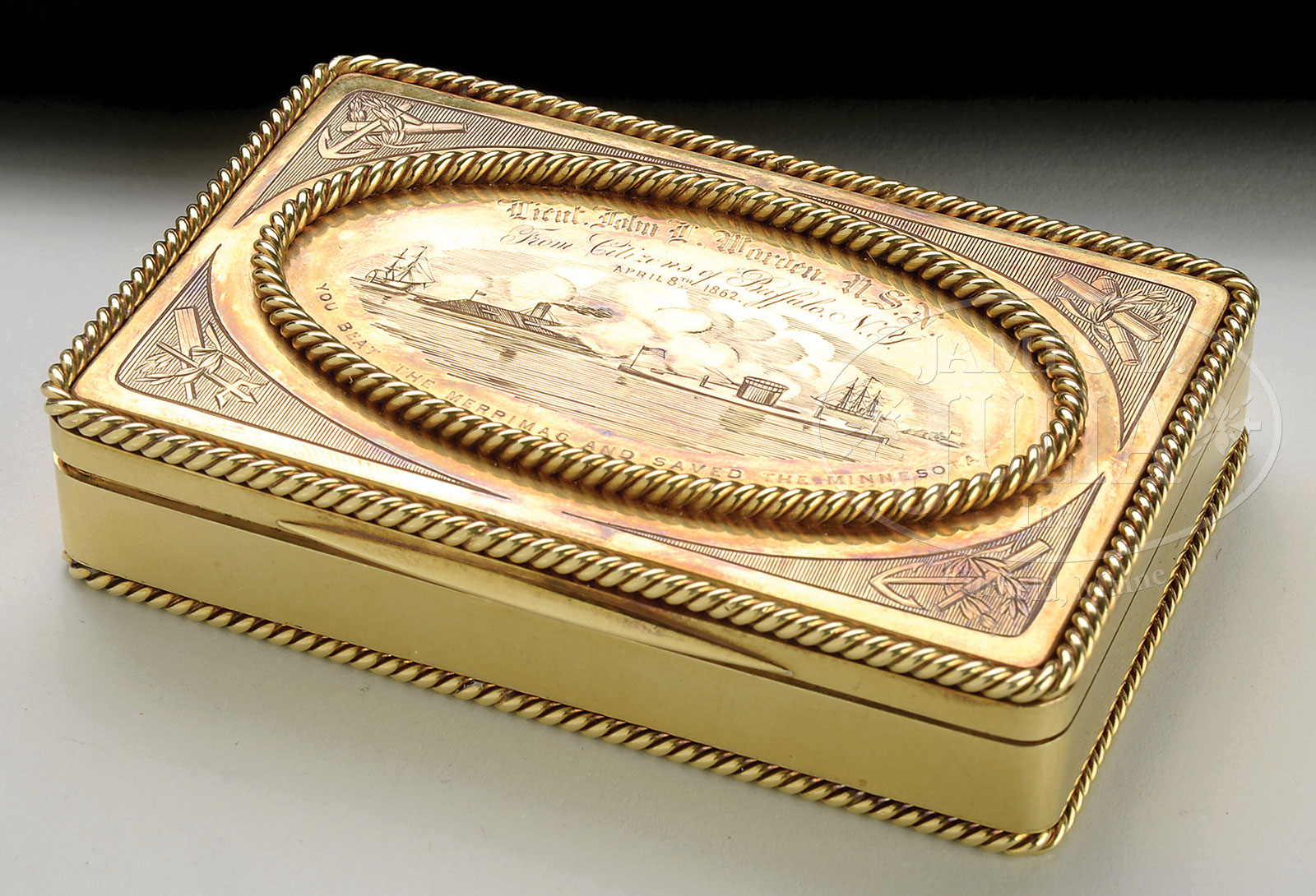 SOLID GOLD TIFFANY PRESENTATION SNUFF BOX PRESENTED BY THE CITIZENS OF BUFFALO TO LT. JOHN WORDEN, HERO OF THE VICTORY OF THE MONITOR OVER THE MERRIMACOne of the most important and historic American Civil War U.S. Navy artifacts to be presented for public sale. The unmarked SOLID GOLD (approximately 18 Karat) snuff box measures 3-5/8″ x 2-3/8″ x 6/8″ weighing 252grams being a hinged rectangular snuff box with a thumb lip on the front. The perimeter of the box is presented with a two-strand twisted gold wire border simulating rope at the top and bottom. On the lid is an oval panel 3″ x 1-5/8″ framed with the identical twisted gold wire. Within the oval panel is engraved the battle scene between the U.S. Navy Ironclad “Monitor” and the Confederate Navy Ironclad “C.S.S. Virginia” (Merrimac). This engraving is done with the finest hand. The corners of the box (outside the oval panel) are shaded with engraved lines and decorated with nautical devices such as fouled anchors, laurels and tridents. In an arc across the top of the oval panel is engraved in old English script: “Lieut. John L. Worden, U.S.N.” immediately below in script “From the Citizens of Buffalo, N.Y./ April 8, 1862.” Arched at the bottom in very small Roman capital letters “YOU BEAT THE MERRIMAC AND SAVED THE MINNESOTA.” The presentation of this box is detailed in the “Buffalo Morning Express” April 9, 1862 on page two. This account tells us that the box originally cost $300.00 and that the amount was raised through subscription of 60 individuals all contributing $5.00 each. A contemporary description of the presentation box and the circumstances; “The citizens of Buffalo upon hearing of the Monitor‘s victory over the Merrimac were so delighted at the act that they raised three hundred dollars, and sent it to Tiffany & Co. of this city. In return for the …, Tiffany worked up eight ounces of eighteen carat gold into a box nearly four inches long, some two inches and a quarter broad, and about one inch deep. The edges of the box are ornamented with a solid twist border, representing the ship’s rope-cable. On the lid, a border of the same kind encloses a broad oval, within which is engraved a very spirited engraving of the most extraordinary sea-fight of this, or any other age. Over the engraving is the inscription “To Lieut. John L. Worden, U.S.N.” and under it “You beat the Merrimac and saved the Minnesota.” In the corners of the box are pretty little designs in etchings of a naval character. The snuff box is a very fine one though too heavy for use, its preposterous thickness of material happily exemplifying the ironclad Monitor. Buffalo, NY had reason to be so proud of Worden and the Monitor‘s victory as one of the original designers of ironclad ships was Captain Ebenezer Dorr of Buffalo. The Niagara Steam Forge Works among other Buffalo manufacturers made parts for the Monitor which was assembled in Brooklyn, NY. This is an iconic and truly spectacular presentation gold box emulating “freedom boxes” given by other American cities to military heroes of earlier wars. PROVENANCE: Cape Elizabeth, ME Estate, 2003; Brad Witherell, Sacramento, CA, private collection. CONDITION: Very fine overall. Minor cosmetic scratching with fine toned luster. 52875-4 (30,000-50,000) – Lot 2050