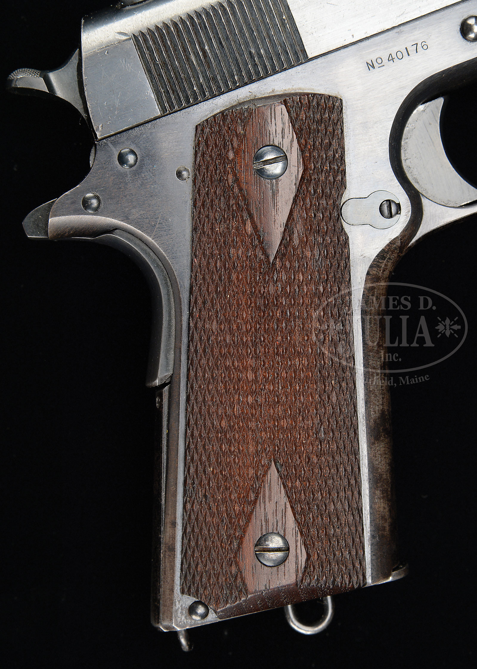 *COLT MODEL 1911 CAL. .45 ACP NAVY MARKED PISTOL IN EXCELLENT ALL ORIGINAL CONDITION WITH FACTORY LETTER.SN 40176. Cal. 45 ACP. 5″ bbl. Right slide marked “MODEL OF 1911.U.S.NAVY”. Left slide marked with Colt’s typical 1911 last patent date followed by Colt’s standard Hartford address. Rear of slide has un-circled Rampant Colt. Left receiver has “UNITED STATES PROPERTY” with Roman font. Walter G. Penfield inspection mark over magazine catch. Front sight is thin, tapered, rounded. Rear sight is rounded with rounded notch. Rear sight registration mark lines up perfectly. Hammer is wide spur, stubby, checkered. Grip safety has short tang. Main spring housing has typical Colt bevel. Magazine is a two-tone lanyard loop type. Stocks are Colt double diamond. Bbl has proper “P H” “horizontal” orientation. Magazine catch lock is properly slotted. Slide stop is typical Colt checkering pattern. Most Navy pistols show heavy wear. This pistol shows only moderate wear to the front grip strap and has an overall very attractive finish. PROVENANCE: Bruce Burtner collection. CONDITION: Slide right shows several dings on bottom of ejection port. Slide top and left also show minor dings. Orig stocks are near new. Stock screws are pristine with only slight edge wear. Receiver right shows only faint scratches at rear. Receiver left shows minor erosion around acceptance stamp. Small parts, trigger, hammer, slide stop, thumb safety, grip safety all excellent condition. Main spring housing shows only minor wear at the bottom corner. Front grip strap shows considerable patina. Finish is all orig and mostly present except as noted. Bore is excellent, bright and shiny. Mechanics are crisp. Overall very fine with around 93% orig finish. Extraordinary 1913 Navy would fit in the finest collections. 52914-5 KXK (6,000-10,000) C&R – Lot 3411