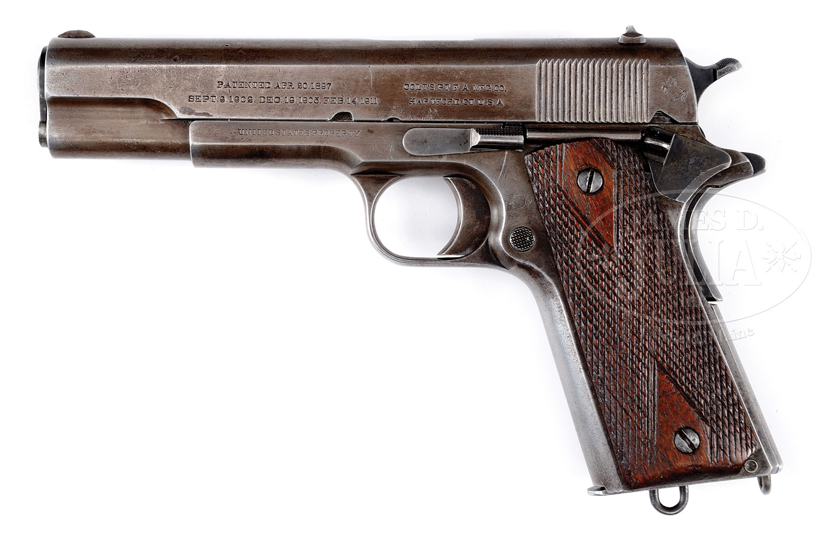 *COLT 1911 NAVY MARKED PISTOL SHIPPED AUGUST 16, 1913 WITH FACTORY LETTER.SN 42341. Cal. 45 ACP 5″ bbl. Slide right shows “MODEL OF 1911.U.S.NAVY”. Left slide shows standard 1911 last patent date marking followed by Colt’s standard address. Rear of slide shows Rampant Colt. Front sight is thin tapered. Rear sight is rounded with round match. Marked “H” over firing pin stock plate. Receiver has crisp “UNITED STATES PROPERTY” on dust cover. Left receiver shows Walter G. Penfield mark over mag catch. Right receiver shows SN above trigger. Top of receiver marked “H R”. Stocks appear to be orig Colt double diamond type. Short, stubby hammer, short tang grip safety, flat main spring housing. Long, smooth trigger and lanyard loop magazine. Bbl is Springfield Armory manufacture marked “S P” on left lug. Factory letter shows shipment to US Navy Yard Brooklyn, NY on August 16, 1913. PROVENANCE: Bruce Burtner collection. CONDITION: Overall fair with only scattered patches of finish remaining in protected areas. Most of finish is in white. Front and rear sight have only minor dings and dents. Only scattered patches of orig finish in protected areas remain. Receiver shows patches of orig finish remaining in protected areas. Receiver left side shows minor dings around slide stop pin. Receiver right shows scratch at rear by hammer pin. Right stock shows heavy wear especially at bottom. Left stock shows moderate wear, mostly at bottom. Hold open tab on magazine follower needs attention. Bore is dirty but appears to be crisp. Mechanics are crisp. 52914-6 KXK (3,500-5,500) C&R – Lot 3412