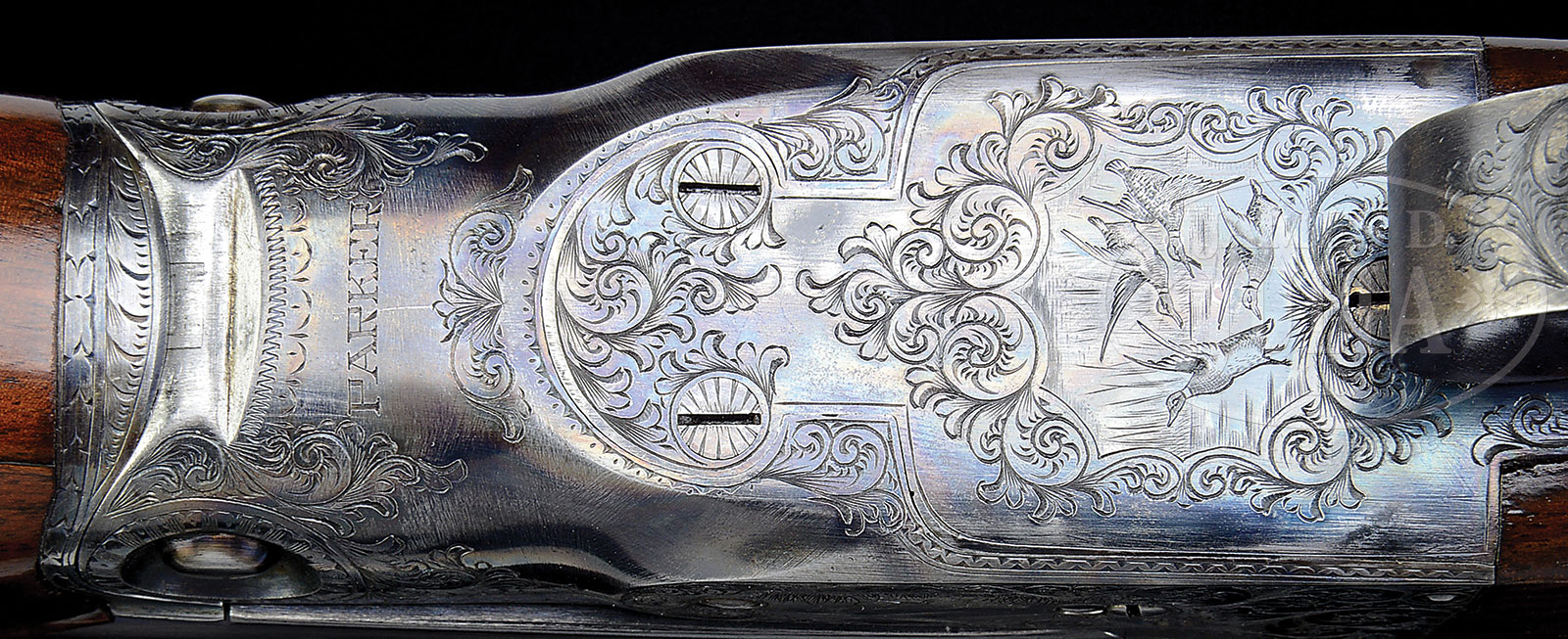 *EXCEPTIONAL PARKER DHE 20 GAUGE WITH FACTORY LETTER.SN 238858. Cal. 20 ga. 28″ Titanic steel bbls with ivory mid and white plastic front bead. No. 0 frame. 2-5/8″ chambers. Bbl flats stamped with overload proof marking and marked with “R K” (Remington repair code Nov. 1941). Unstruck bbl weight of 3 lbs. 2 oz. Parker single selective trigger, automatic ejectors, automatic safety. Flame grained American walnut buttstock is checkered in 3 point pattern with tear drops behind action and has 14-1/4″ LOP over engraved skeleton steel buttplate. Buttstock with what appears to be factory orig sling swivel eye hole mounted near toe and nickel oval. Elongated beavertail forearm is checkered in standard DHE pattern with engraved Deeley release and has proper reinforcing screw. Bottom rib with proper reinforced forend lug and what appear to be factory orig sling eye mount. Action is beautifully engraved in typical late DHE pattern with setter in rolling hills scene on right, pointer in field scene on left surrounded by late Parker open scroll engraving. Trigger plate with 4 ducks that are extremely well detailed in scroll bordered panel. Bottom of action engraved “PARKER” surrounded by scroll bursts. All visible SN’s match. Accompanied by a Parker Gun Collectors Assoc. factory letter. Describing this gun as found with the exception of the buttstock which is listed as capped pistol grip. 6 lbs. 13 oz. Bore diameter: left – .616, right –.616. Bore restrictions: left –.025 right –.005 . Wall thickness: left –.030, right –.026 . Drop at heel: 2-15/16″, drop at rear of Monte Carlo: 2-1/4″ drop at comb: 1-1/2″. CONDITION: Very fine. Bbls retain approximately 98% orig blued finish with a couple of minor light handling marks. Orig strike marks present on breech end of bbls as well as some orig blue on ejector stop. Buttstock is superb as near certainly updated by Remington in 1941 from its capped pistol grip configuration to current straight stock, retains nearly all of its orig finish with some finish added for preservation. Skeleton steel buttplate retains approximately 80% of its factory orig blued finish particularly strong near toe, toning at heel. Action retains virtually all of its factory orig case color with light high point edge wear. Engraving is extremely sharp and detailed. Beavertail forearm retains nearly all of a professionally restored finish with an ancient grain separation near forend knuckle. Checkering is quite crisp. Trigger guard retains more than half of its orig blue with blue loss at grip, quite strong on bow and back of tang. Buttstock & forearm checkering does not have a mullered border which is exactly what we would expect to find on a factory original 1941 Remington stock. This gun with the options noted above is an exceedingly rare, high orig condition Parker worthy of consideration by even the most discerning collector. Special Note: This item(s) contains plant or animal properties that may be covered by the Endangered Species Act (ESA). Please read the Conditions of Sale, section 15, for more information regarding the Endangered Species Act, and your responsibilities as a buyer. 52920-4 MGM (25,000-35,000) C&R; ESA – Lot 1302