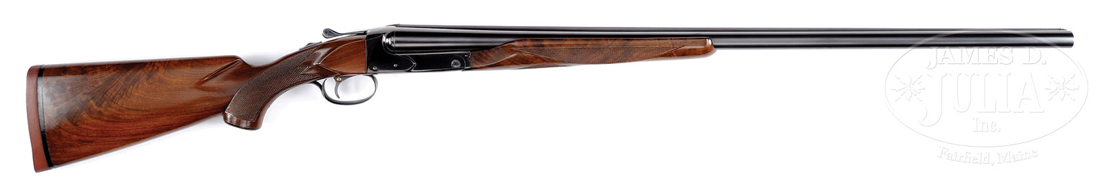 *HIGH CONDITION WINCHESTER 21 TRAP GRADE SHOTGUN.SN 26240. Cal. 12 ga. 30″ Bbls with factory markings on left side, are marked for “full” and “full”. Standard blued action with information on water table, is marked “TRAP” on floorplate. Single selective trigger is blued. Winchester capped pistol grip stock of crotch figured American walnut measures 14-1/4″ over red Winchester pad. Long beavertail ejector forend has brace. Bore diameter: left -.734, right – .734. Bore restrictions: left – .033 (full), right – .033 (full). Drop at heel: 2″, drop at comb: 1-7/16″. Cast: neutral. Weight: 7 lbs. 7 oz. LOP: 14-1/4″. PROVENANCE: Bill Trotter collection. CONDITION: Excellent, very close to new, with some light oxidation marks on left side of bbl, and some minor nicks in wood; possibly some added varnish. Bores are excellent. Mechanically excellent. 52923-14 MGM (3,500-5,500) C&R – Lot 3226