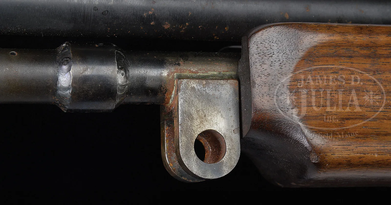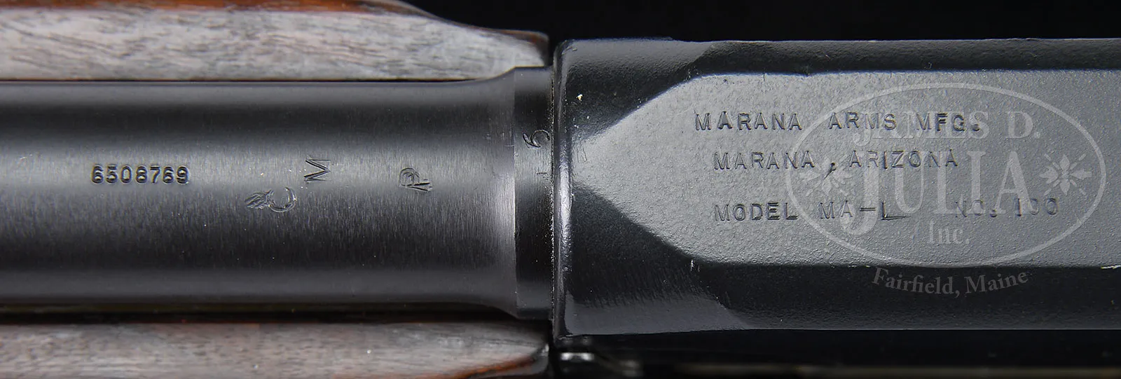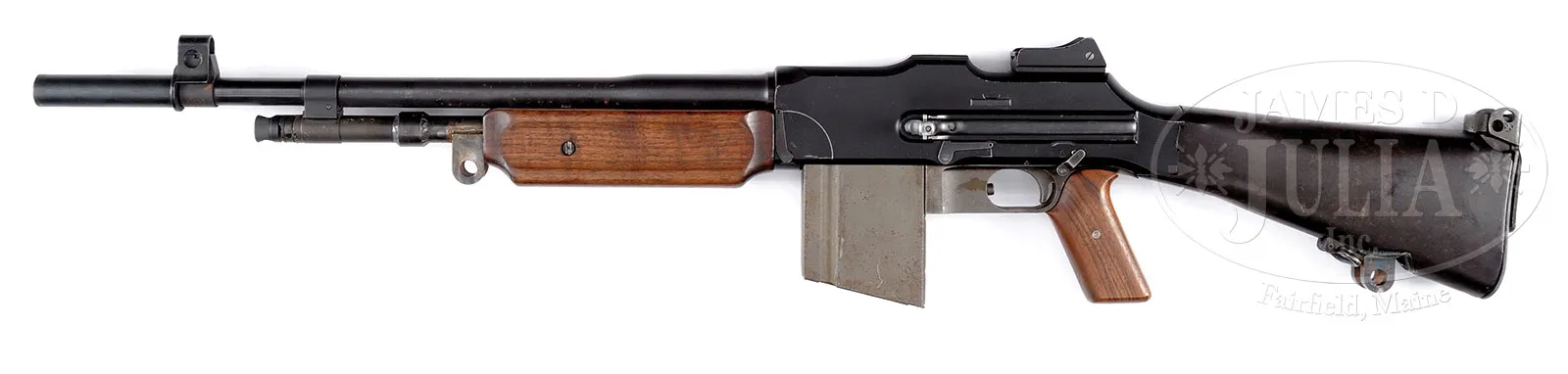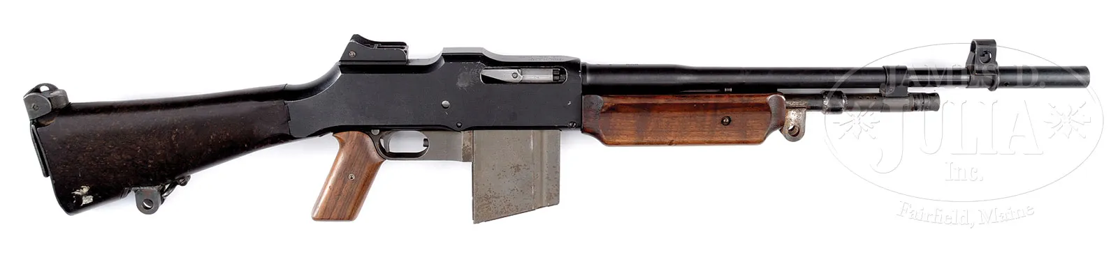 **MARANA ARMS MANUFACTURED MODIFIED COPY OF BROWNING AUTOMATIC RIFLE (FULLY TRANSFERABLE).SN 100. 7 mm. 21″ bbl with muzzle attachment. This automatic rifle is an amalgamation of parts, mostly Browning 1918 A2. Includes one Swedish BAR curved magazine which snaps positively into place. Receiver is marked Marana Arms Mfg Marana Az model MA-L NO.100. Includes one orig B. A. R. 20 round magazine. Complete with rear sight and selector for F,A&S. Buttstock is hard brown composite with flip up shoulder rest but with added welded apertinence at bottom to fit on some kind of tripod, possibly for Bren gun. Another identical apertinence is welded just forward of forend to gas cylinder. Gas cylinder shortened and welded just forward of forend for gas regulator, which is late style Browning Automatic Rifle. Hand grip assembly appears to be standard BAR with a welded on grip frame reminiscent of Colt Monitor complete with smooth walnut grips. Forend is an adapted smooth 1918A2 wooden forend. Bbl is a US ordnance flaming bomb marked bbl apparently rechambered and relined to 7mm Mauser with non detachable muzzle break with front sight from 1918A2 BAR. This is a National Firearms Act item and requires BATF approval prior to transfer. This weapon is fully transferable on an ATF form 3 or form 4. PROVENANCE: The class III weapons formerly on loan to Evergreen Aviation & Space Museum. CONDITION: Overall finish and appearance is extremely fine as refinished. Over 90% blue refinish on bbl, gray orig finish on bulk of hand grip assembly rates about 95% thinning. Added grip frame in the white. Receiver is covered in a coat of black enamel paint with noticeable loss in an area about 1″ to rear of ejection port. Welded on attachment forward of buttstock devoid of finish but not unattractive. Wooden forend has some bruises and handling marks and screw on underside is not present. Magazine is gray parkerized finished with some brown spots. Dark brown composite buttstock in fine condition with some handling marks and nicks and noticeable brassing on underside just to rear of receiver. Mechanics are fine. Bore is shiny and bright with some slight pitting. Bolt face is extremely fine with sharp lines and some slight pitting around firing pin hole. Condition of this arm indicates quality assembly and that it was a successful shooter. 52924-2 JWK (15,000-25,000) – Lot 1068