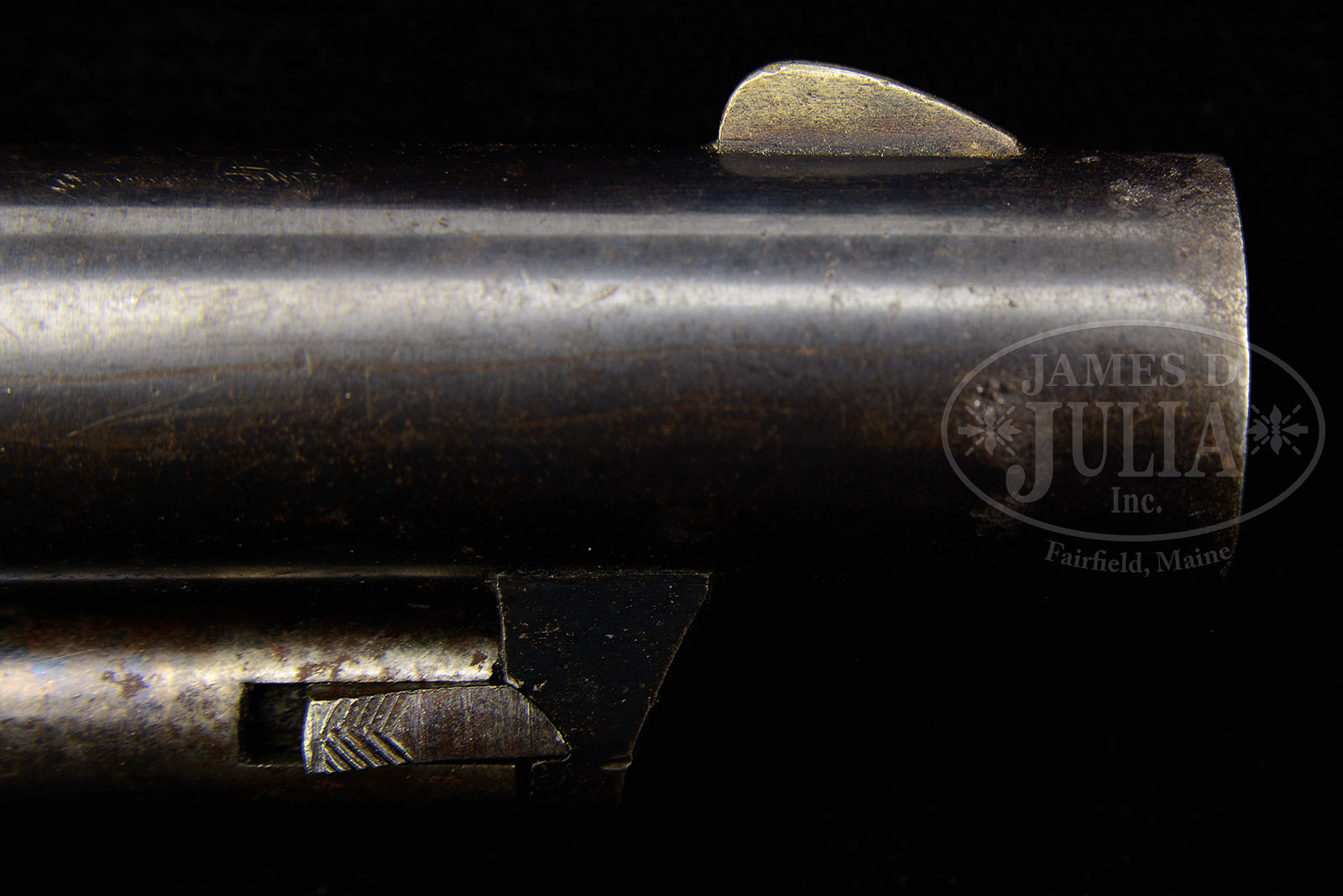 FINE CIVIL WAR MARTIALLY MARKED COLT MODEL 1860 ARMY PERCUSSION REVOLVER.SN 135852. Cal. 44. Blue & color case hardened with 8″ rnd bbl, nickel silver front sight and 1-line New-York U.S. America address. Left side of frame has a small “COLTS PATENT”. Frame is 3-screw type cut for shoulder stock with flat head hammer screw. The unplated brass trigger guard and blued steel back strap contain a martially marked 1-pc walnut grip with excellent fit that is a factory original Colt product, however the last four digits of the serial number recorded on the interior of the grip, in the backstrap channel read “0081”, and do not match the rest of the gun. However, one would never know it from the fit. Left side of grip has a clear, legible inspector’s cartouche and the right side a mostly legible cartouche. Grip does fit very well. Various parts have small inspector initials. Cylinder is rebated with six chambers and has the Ormsby Naval battle scene roll marking. All six safety pins are partial but serviceable. There were over 200,000 of these revolvers produced 1860-1873 of which the government purchased 127,156. They were the most widely distributed handgun in the Civil War and were popular with the troops for their hard-hitting 44 caliber ball/bullet. These revolvers remained in service with the military well into the 1870s until eventually replaced by the Model 1873 Single Action Army cartridge revolver. After the war they saw hard service on the frontier with several cavalry units and some infantry units. After they were replaced they were sold as surplus and remained in service for many years on the American frontier and around the world. They are rarely found today with any orig finish. PROVENANCE: Paul Sorrell Collection. CONDITION: Very fine, all matching except grip, as noted. Bbl retains 85-90% strong orig blue with an area of thinning on right side and with some pitting around the muzzle, very nice original feathering near sight, around ram rod latch and on the right side of the barrel near the ram rod pivot. Rammer pivot retains bright case colors and the handle faded case colors; frame retains about all of its lightly to moderately faded case colors, as does the hammer; cyl is a dull blue/brown patina and shows about 80% Ormsby Naval battle scene roll marking; trigger guard & front strap are a light yellow patina and the back strap retains about 80% thinning orig blue showing original feathering. Grip is sound with a couple of small nicks and retains a fine hand worn patina. Mechanics are fine, bright shiny bore with a few spots of pitting. 52930-1 (5,000-6,000) – Lot 3007