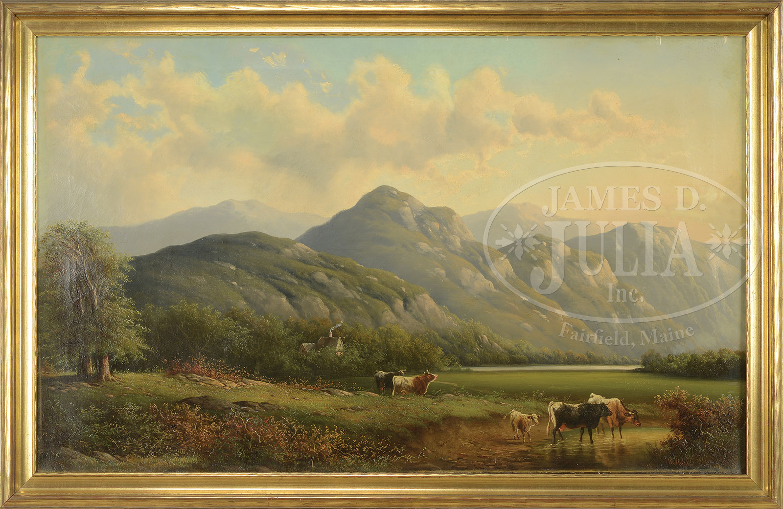 WILLIAM WALTON (American, 1843-1915) COWS AT WATERING HOLE IN A MOUNTAINOUS LANDSCAPEOil on canvas