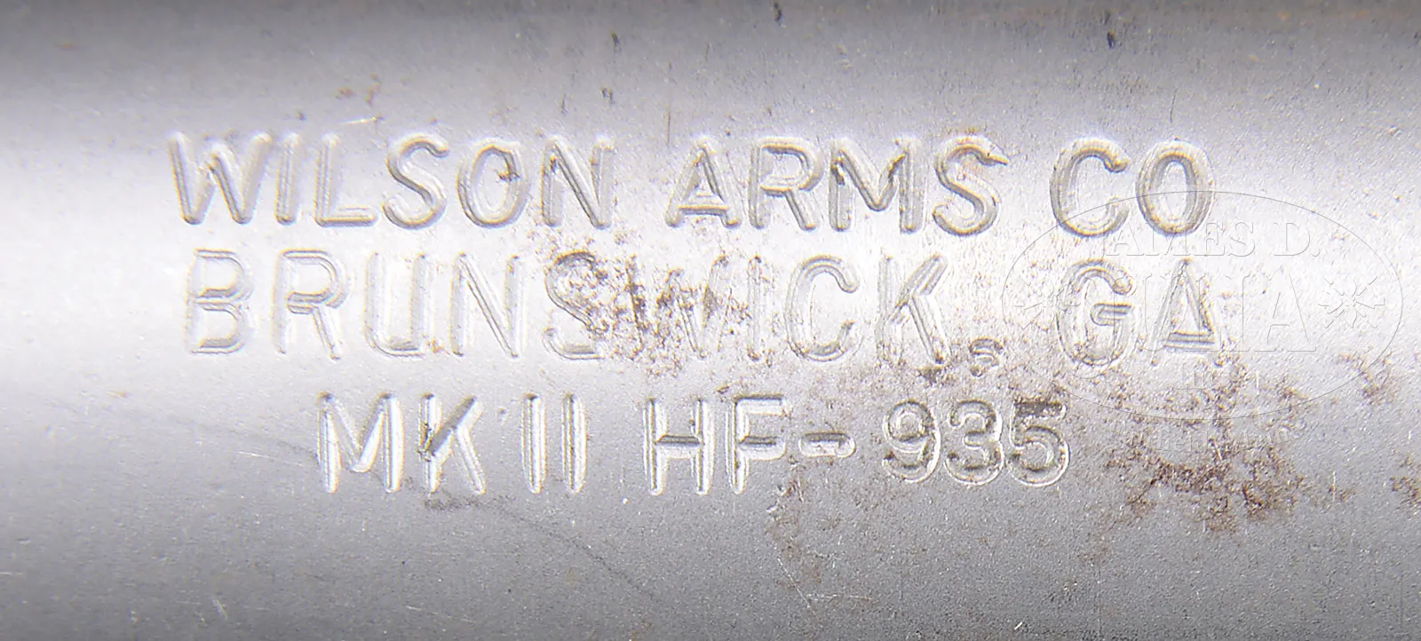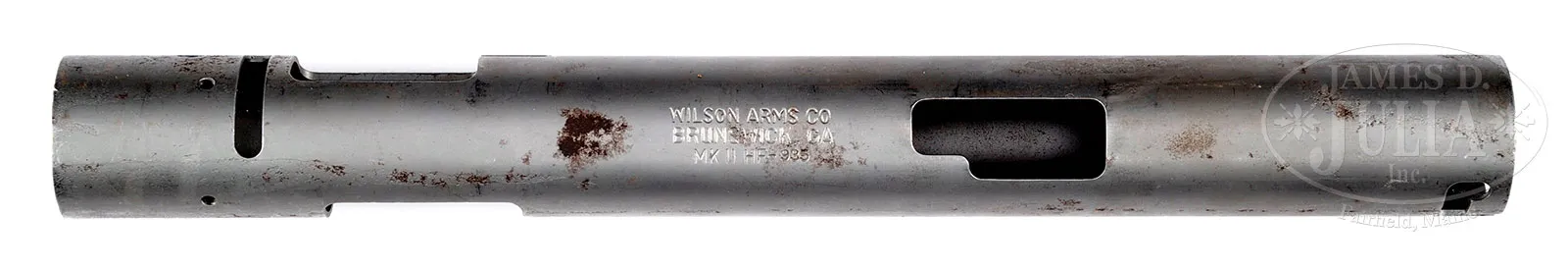 **UNFINISHED YET REGISTERED WILSON ARMS COMPANY STEN MK II RECEIVER TUBE WITH PARTS SET (FULLY TRANSFERABLE).SN HF-935. Cal. 9 mm. 7-3/4″ bbl. Wilson registered tube completely inletted and in the white, without ejector. Included with this tube is one complete Sten parts set having saw cut tube piece with ejector intact and in place. Parts set includes both flat-butt and loop style stock extensions, two bolts total, trunnion, and one mag. Internal parts packaged in separate plastic pack. This tube is a National Firearms Act item and requires BATF approval for transfer. This item is fully transferable on an ATF form 3 or 4. CONDITION: Overall appearance and finish of tube is bare metal with small patches of scattered light pitting. Parts set ranges from very fine lustrous blue on loop style stock attachments to fair finish on receiver sections, one mag a gray patina, the other more of a lustrous blue. Good serviceable bbl with good shine. Mechanics are present and the parts are here for a qualified person to be able to assemble them into a fully transferable Sten machine gun. 52939-33 JWK (4,000-8,000) – Lot 1034