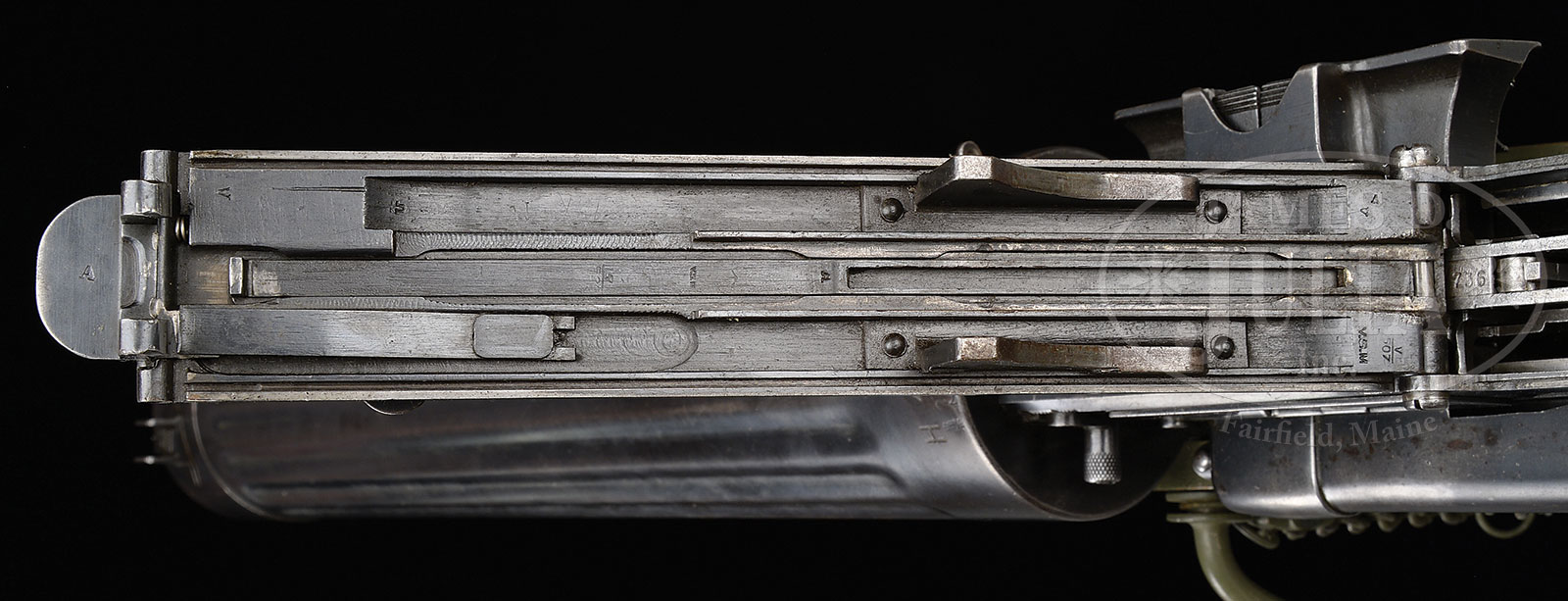 **EXTREMELY ATTRACTIVE FLUTED JACKET VICKERS MACHINE GUN ON VICKERS ARMSTRONG TRIPOD WITH ACCESSORIES (FULLY TRANSFERABLE).SN H4879. Cal. 303. 28-3/8″ bbl. Extremely fine British proofed early fluted jacket Vickers water cooled machine gun as registered by Dick Wray. Current registration form indicates “VSM” with “Cincinnati, OH” address with model “Vickers”. Accessories include three feed blocks, three locks, one bulb type flash hider, one Fuzee spring, three drain corks, three tabless cloth belts, three WWII brass tabbed Dunlop cloth belts, one steam hose, one water can, one metal ammo can, four wooden boxes of belted .303 ammunition on tabless cloth belts, two metal ammo boxes with two wooden boxes of belted ammo marked for the country of Jordan and 10 spare Vickers bbls, all in .303 British. Also an orig Vickers Armstrong tripod with brass identification plate with later model tripod head and metal ammo box frame. This very handsome fluted jacket Vickers gun has an “FBP” marked muzzle attachment with brass chain and brass .303 feed block currently installed. Right side plate marked with SN below feed block opening and this number matches number on top of water jacket. Attractive walnut back plate handles retain oil caps, cross head and numerous parts including back plate, top cover trigger bar, top cover and water jacket, all are “VSM” marked. Bbls range from “VSM” marked to “VAC” marked and “MA” marked, so there is a full range of the different eras of bbl manufacturing. Several of the ammo boxes are sealed, one opened box contains orig British corrosive .303 ammunition on tabless belt. Approximately 2,000 rnds total. Spare feed blocks also brass. Two locks are Australian manufacture, third is marked “VSM”. Orig water jacket patch WWII repair kit in tin box.This is a National Firearms Act item and requires BATF approval prior to transfer. This item is fully transferable on an ATF form 3 or form 4. CONDITION: Overall appearance and finish are very fine with over 90% orig finish on water jacket with the balance an apparent refinish with subsequent wear to the high edges particularly on the back plate with some scattered brown spots on the Fusee cover and some areas turning a gray patina. Water jacket filler and drain plugs in very good condition. Cork in steam outlet fractured but in place. Bbls range in condition to very fine deep lustrous finish on the “MA” marked bbl to scattered brown light pitting with most of the bbls having fine bright bores and anti-moisture storage paper in the bores. All locks appear to be in serviceable condition with the two Australian locks being near mint. Belts likewise all appear to be in fine serviceable condition as is steam hose. Mechanics are functional. Uncleaned bore in gun with other bores ranging from good to very fine. The Vickers machine gun enjoys great popularity because it can be readily converted to multiple calibers such as .30-06, .308, 8mm, and most usually 7.62 Russian. This versatility together with its classic durable design and attractive looks make it an institution at shooting ranges for the foreseeable future. 52939-34 JWK (12,000-18,000) – Lot 1052
