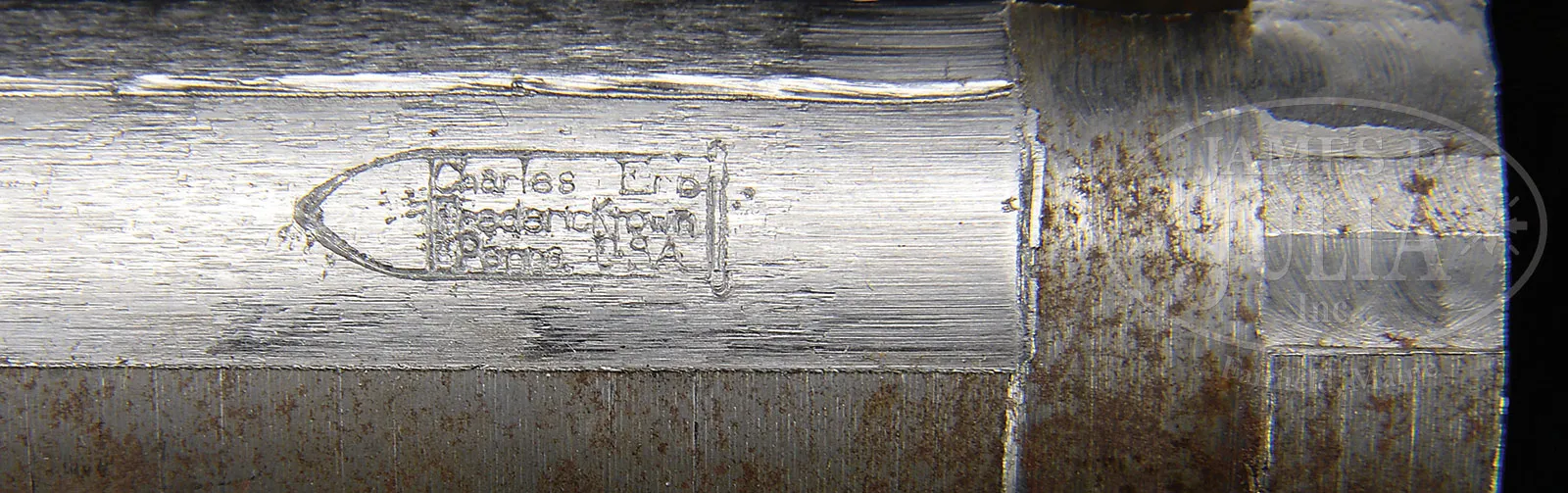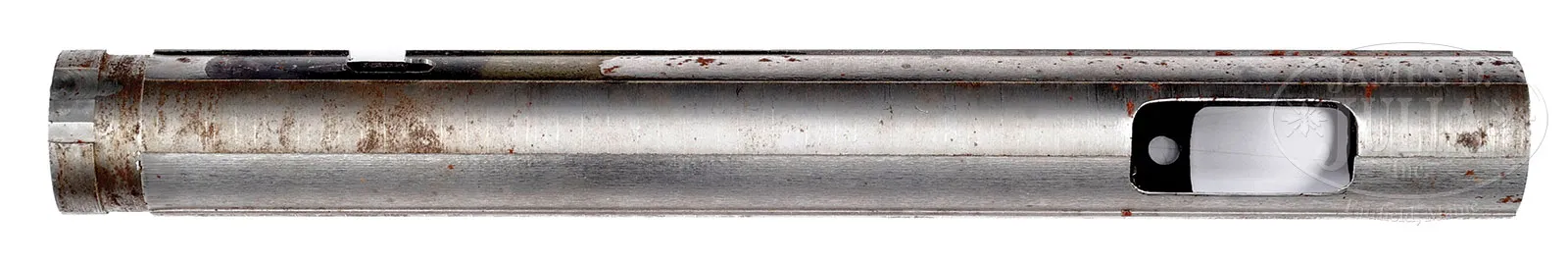 **CHARLES ERB REGISTERED MP-40 RECEIVER TUBE ONLY (FULLY TRANSFERABLE).SN 322e. Cal. 9mm. Registered MP-40 receiver tube as manufactured by Charles Erb. Exhibits Erb bullet logo on the left side below the bolt handle channel with SN visible at left front portion of tube with 2nd SN on underside of tube just forward of sear slot. Charles Erb was one of the people with both the foresight and machinery to have made a number of these receiver tubes and registered them as fully transferable to individuals when it was still possible to do so. Current registration form reflects this tube as being model “MP-40” in caliber 9mm. This is a National Firearms Act item and requires BATF approval prior to transfer. This item is fully transferable on an ATF Form 3 or Form 4. CONDITION: Overall appearance is in the white with slots and holes cut however there is no trunnion. There are areas of light surface rust with some bluish dye noticeable particularly at the bolt handle safety slot. This is the essential registered tube of an MP-40 machine gun. 52939-37 JWK (7,500-12,500) – Lot 1024