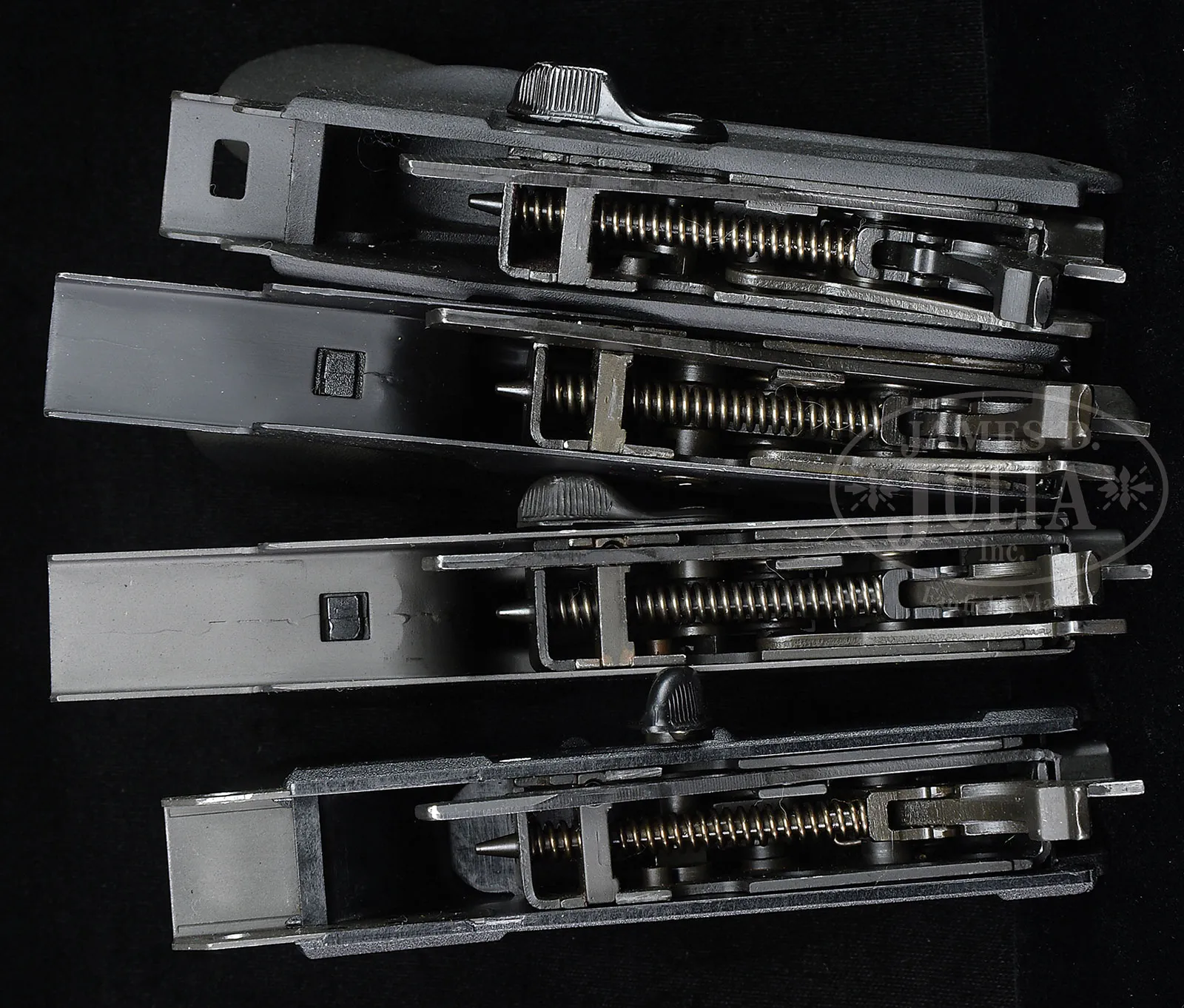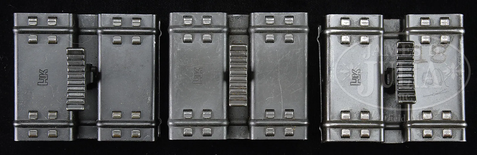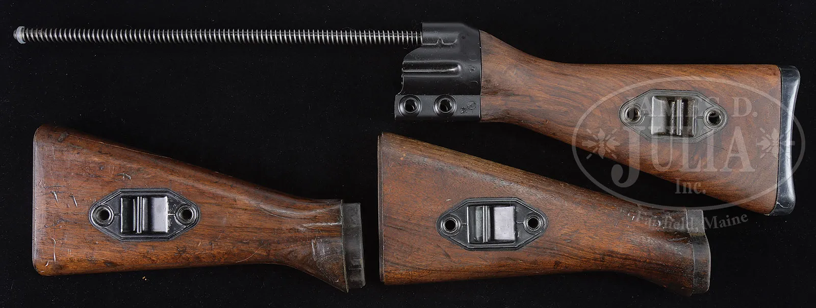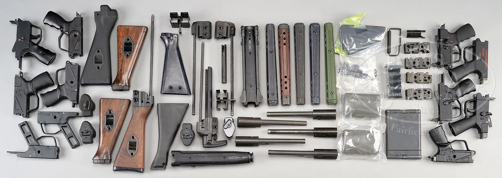 INCREDIBLE AND MASSIVE HECKLER & KOCH MACHINE GUN PARTS LOT.This is an absolutely fabulous assortment of Heckler & Koch machine gun parts, many, if not all of which will fit on semi-automatic versions. Seven stripped trigger housings, 2 are semi-auto only, 4 are 3-position selector, 1 is a 4-position selector. One complete .308 semi-auto only standard housing with semi-auto pack. Sear friendly 5.56mm frame with semi-auto sear spring. One HK 91 milled-steel ejector, no sear trigger housing with 3-position selector. One other “Short tail” 3-position selector, no sear trigger housing. Four stripped sear boxes. One wooden G3 buttstock marked “HK/66” with mainspring housing and mainspring. Two stripped wooden G3 buttstocks, WO butts without plates. One stripped composite G3 buttstock. One complete telescoping buttstock assembly with mainspring. Two mainspring and hardware assemblies for G3 buttstocks mentioned above. One wooden G3 forend. Four hard composite G3 forends. Three HK 91 forends assemblies, one of which has bi-pod attached. One MP-5 horizontal forend. Five HK 91 bolt carriers. Two HK 91 bolts. Three hard composite rear spring housing assemblies with sling swivels. One steel mainspring housing with sling swivel. Four buffers. Four composite handgrip assemblies. Three HK marked dual mag holders. One hooded front sight assembly. One dial peep sight. One Cherokee accessories snap on cheek piece for HK 91, HK-93, MP-5, and CETME. Two green plastic HK cleaning kits. Three carrying handles. CONDITION: Metal and composite parts are very fine with some handling marks. Bolts are in pristine condition. Wood stocks have some light handling marks but are completely serviceable. An incredible grouping of Heckler & Koch parts for the forward thinking firearms enthusiast. Especially the wood G-3 forend! 52939-48 JWK (2,000-4,000) – Lot 1010
