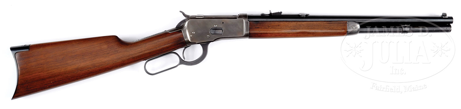 *ATTRACTIVE WINCHESTER TRAPPER LENGTH SHORT RIFLE.SN 848155. Cal. 44 WCF. 16″ rapid taper short rifle bbl with full magazine. Bbl address forward of rear sight offset to left appropriately. Cal. designation “44 WCF” off to left side with strong Winchester proof on top of chamber. 7-1/2″ short rifle forearm with magazine ferrule properly placed central between forearm stock cap and end of magazine tube. Blue finish overall with 2-pc short rifle walnut stocks with crescent butt. Mfg 1917 with sporting solid blade front sight and appropriate sporting rear sight. Tang is marked “Model 1892 Winchester” with trademark information below. CONDITION: Very fine overall as refinished. Retains most all blue finish on 16″ bbl with magazine finish slightly thinning. Receiver retains much of its later applied finish that is starting to turn indicating that the finish work was done many years prior. Walnut crescent buttstock has been lightly sanded and is evident at confluence of wrist and receiver with very slight rounding of wood at top of crescent buttplate. Applied finish is exceptional and could easily be mistaken for factory. Hidden and almost indiscernible is a stamped property mark or cartouche in left side of butt that is not legible enough to be identified and further investigation could prove fruitful. The appropriate 7-1/2″ short rifle/trapper carbine length forearm had been lightly refinished with great attention as to not remove too much material or rnd edges. Slight bruising and distress is evident at forward left side and rear right side of which the application of a more contemporary finish has been applied and covered up. Bore is bright with sharp rifling. Mechanics are fine and functioning. 52965-1 TDW (1,500-2,000) C&R – Lot 2419