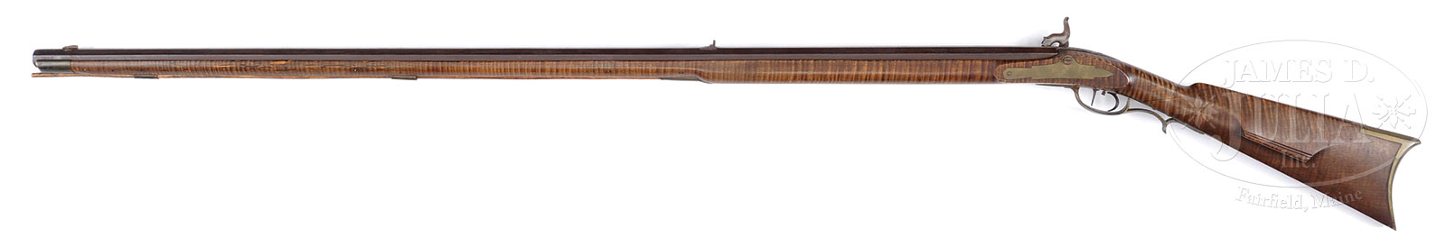 FULL STOCK AMERICAN PERCUSSION CONVERSION RIFLE WITH PATCHBOX.NSN. Cal. 34. 58-1/2″ overall, 48″ oct bbl, originally flint converted to percussion with screw-in bolster with clean-out screw. Interesting thin patchbox with large floral finial. Maple stock with incised carved cheekpiece, brass mounted with wood ramrod. Set triggers. PROVENANCE: An extraordinary private estate collection of a distinguished Virginia gentleman CONDITION: Good to very good overall. Bbl is brown with pitting. Lockplate and hammer have been cleaned to grey with pitting, lock maker’s mark partially discernible. Stock is sound with repaired crack at wrist and wood insets around lock where lock and sideplate have been restored. Mechanics functional, with discernible rifling in pitted bore. 52969-4 JS (500-900) – Lot 1391