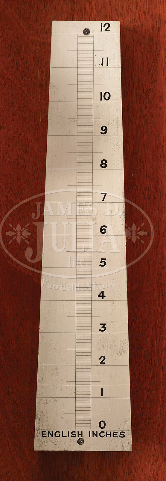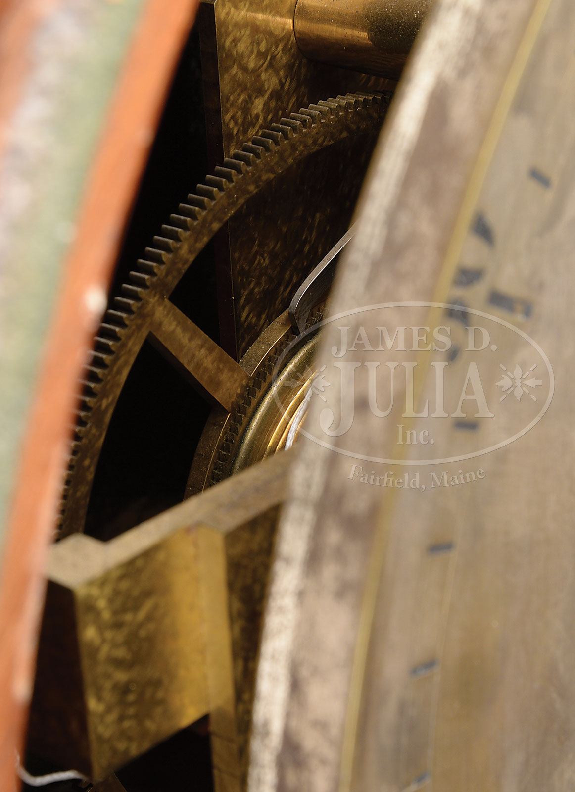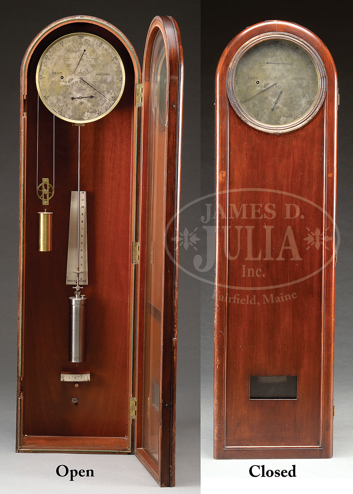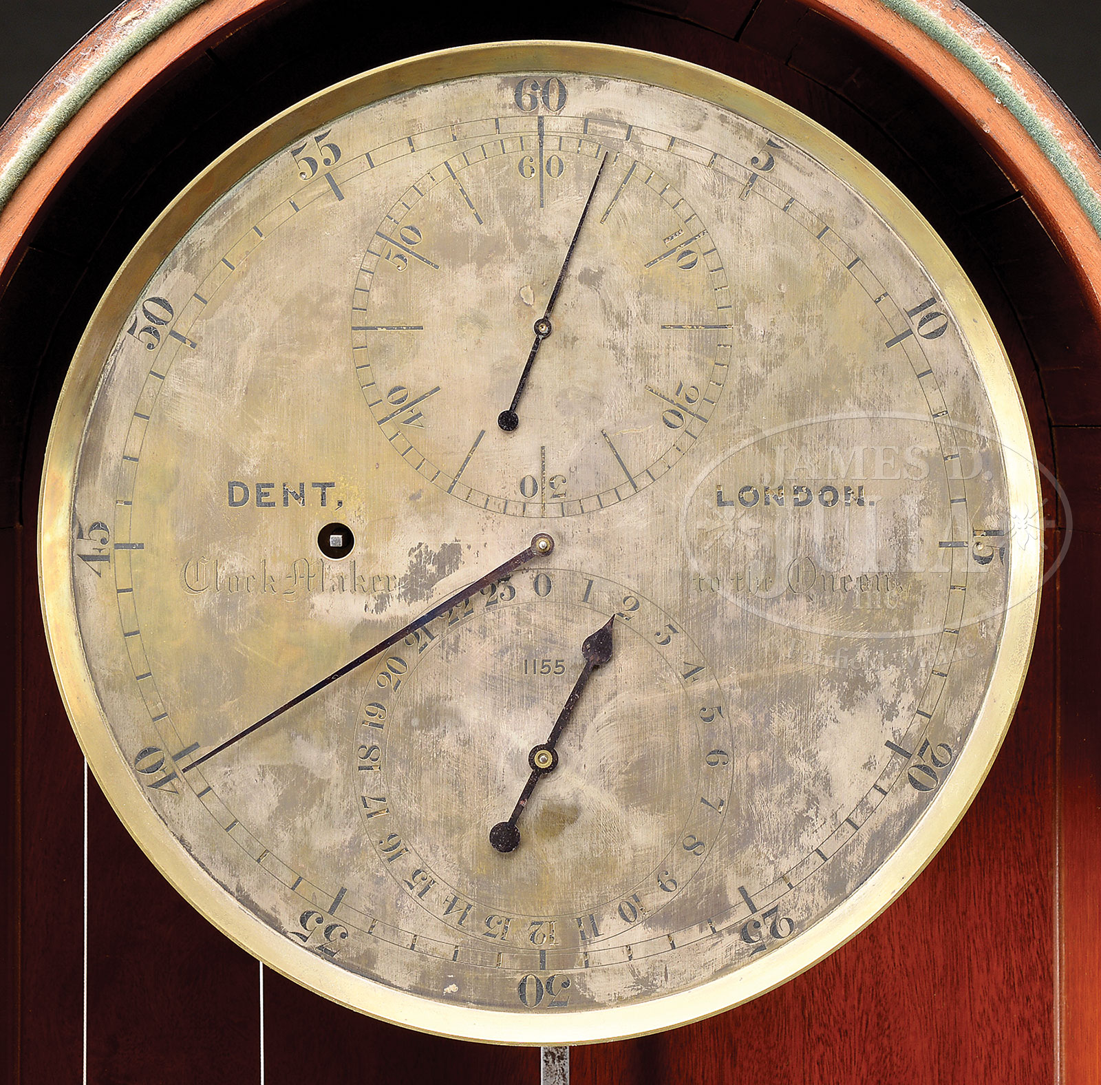 Please Note: Description of the pendulum in this lot should read: The original Dent steel jar mercury pendulum with brass slider and blued steel hand for minute timing adjustments, swinging against a scale. The images online are correct. IMPORTANT MAHOGANY ASTRONOMICAL REGULATOR, SIGNED DENT OF LONDON.Second quarter 19th century, London, England, Edward John Dent (1790-1853). The mahogany arched case fitted with two doors, the outermost door with circular glass plate within a molded surround, a rectangular pendulum viewing aperture below. The second door with full length glass plate drilled to gain access to the winding aperture. Door hinged and fitted precisely to the mahogany case which lines up to a half-round baize covered molded fitter. The case designed to stand either on a shelf and bolted to a wall or to equally stand on floor or platform. The 11″ silvered dial, signed “DENT. London / Clock Makers to the Queen” centering a subsidiary seconds dial with blued steel hand above a 24 hour subsidiary dial. The winding aperture is to the left facing. The main chapter ring with Arabic numerals denoting the 60 minute cycle. The serial number “1155” located beneath the “0” of the 24 hour subsidiary dial. The brass movement with 4 pillars, the brass plates with burnished snailed decoration, the wheel train with maintaining power and with deadbeat escapement. The heavy brass, cased, adjustable pendulum with glass cylinder for mercury, swinging against a scale. The movement driven by a single brass cased weight. SIZE: 59-1/2″ h x 16-1/2″ w x 9″ d. CONDITION: The mahogany case with original undisturbed surface and rich dark patina. The baise seal to the inner door intact and functional. The two door locks absent. The outer door retains original surface and latches remain in alignment. The molded surround with wear to original surface. Case is structurally very good with normal and expected wear and abrasions. The movement appears clean an operational. Hands appear original. Silvered dial overly polished resulting in uneven silvering with areas of brass showing through. Brass frame for dial in place and secure. Scale for English inches intact and original, as is horizontal beat scale. Pendulum and weight original and intact. The liquid mercury in pendulum now absent. Very good overall. 52973-1 (8,000-12,000) – Lot 2197