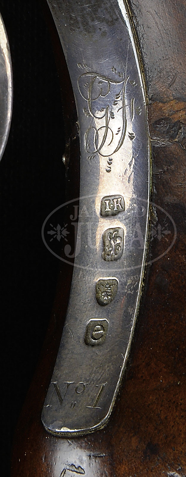 HIGH QUALITY SILVER MOUNTED OFFICER’S OR DUELING PISTOL BY WOGDON.NSN. (ca 1780) Cal. 50 bore. 9-1/2″ Ovate swamped skelp iron bbl is engraved “Wogdon London” on top flat. Touch hole is gold lined. Relief scroll engraved breech iron has integral U-notch rear sight. Chamfered lock with rebated tail is fitted with early type non-waterproof pan with bridled friction frizzen and serpentine cock. Relief scroll engraving is on face of cock and rebated tail. “Wogdon” is on gold oval within draped device on lockplate under pan. Dense European walnut stock with slab sided bag grip extends to muzzle. Furniture is of hallmarked silver by John Kidder (?) (“IK”) with date mark of 1780/81. Trigger guard with raised finely detailed acorn finial has finger spur added to bow. Tang is engraved with owners initials “GF” and “No 1”. Butt has relief cast embellishment of Brittania. Pierced sideplate is of scrolled acanthus and armorial motif with sword. Horn tipped greenheart ramrod is in beaded silver pipes. CONDITION: Good. Bbl refinished, engraving softened. Lock cleaned to gray brown patina with some pitting. Stock has many marks in its orig finish with repair to pin knot at grip and a small sliver missing in front of lock near frizzen. Silver is toned to a shiny blue black. and still retains its fine detail. Mechanically good. Trigger will set. An unusual high end pistol by a great maker. 52995-2 (5,000-7,000) – Lot 3129