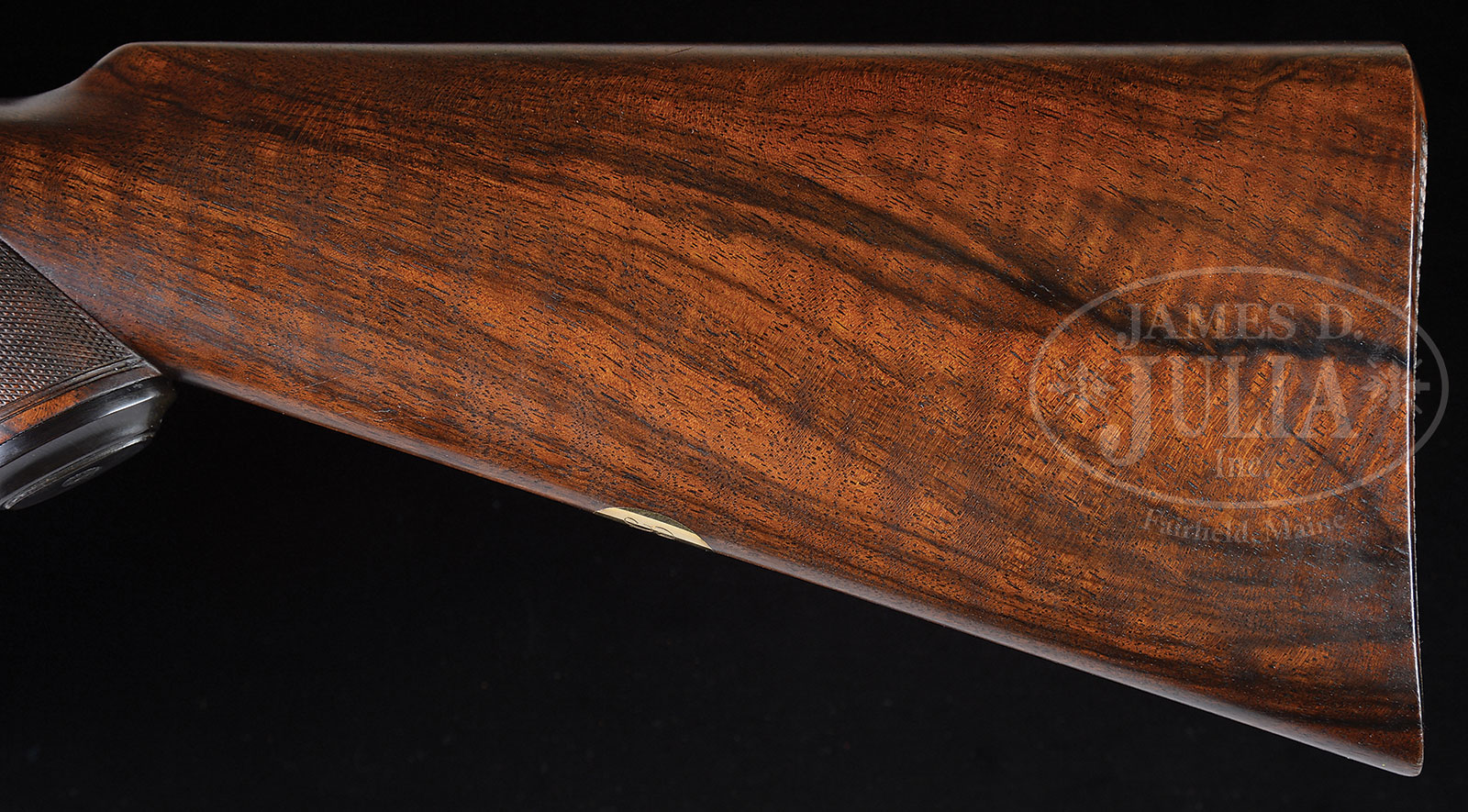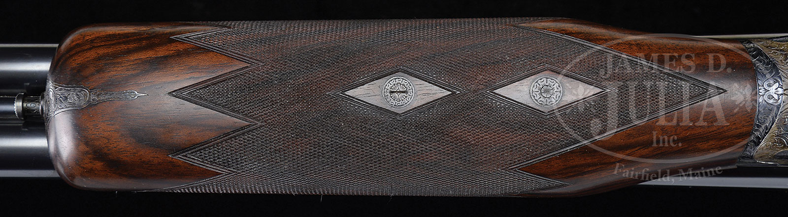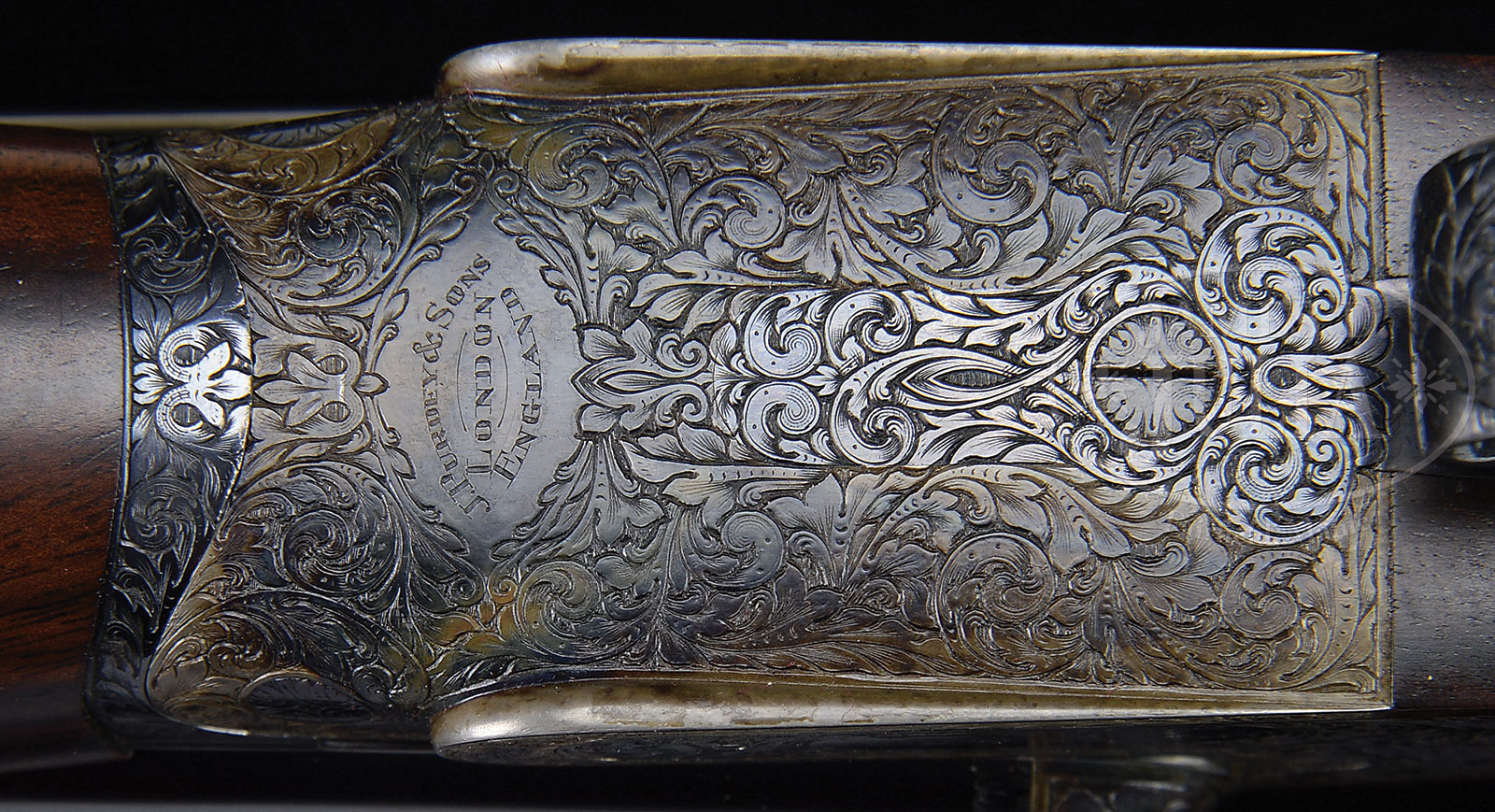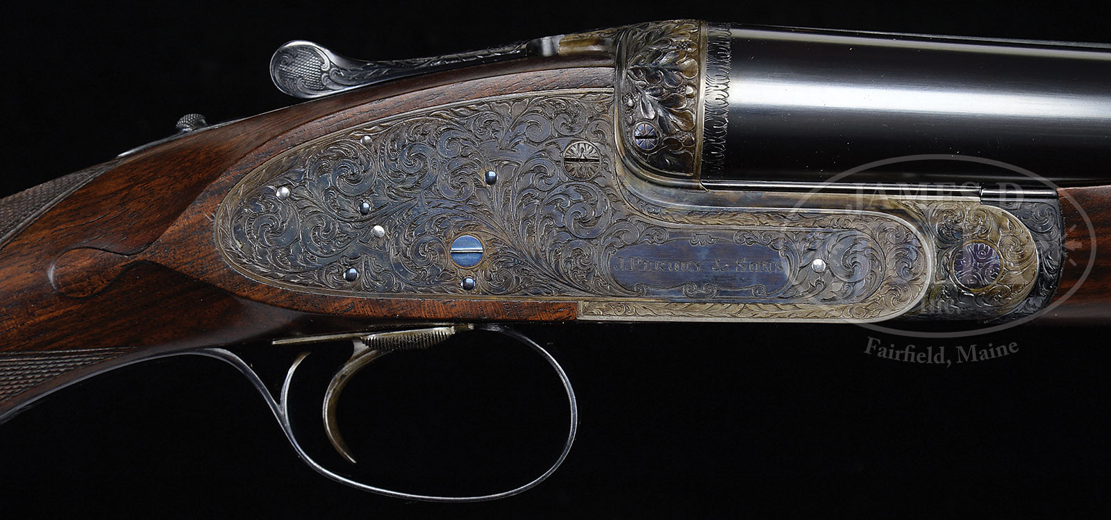 *SUPERB CONDITION JAMES PURDEY EXTRA FINISH SIDELOCK EJECTOR GAME SHOTGUN WITH SELECTIVE SINGLE TRIGGER AND BEAVERTAIL FOREND, WITH MOTOR CASE AND ACCESSORIES.SN 27846. (1973) Cal. 12 ga. 2-3/4″ Chambers. 28″ Chopper lump bbls with matted narrow flat rib are engraved “J. Purdey & Sons” “Audley House South Audley Street, London. England” on tops. Bbl flats are stamped with London nitro proofs for 2-3/4″ chambers. Bottoms of bbls are stamped with SNs, and bbl makers initials “BF” (Brian Frost) on bottom of left bbl. Tube numbers “72243” and “72244” are on loop. Beesley patent self-opening sidelock action features non-automatic safety (SAFE inlaid in gold), bushed strikers, raised rib tumbler end cocking indicators, and unusual single selective trigger (It is not known what trigger was used by Purdey’s at this time, but it appears to be of Laird Pat. Westley Richards type with selector on left side of trigger plate.). Action is engraved in traditional extra finish style with near full coverage large shaded acanthus scroll with strapwork highlights. “J. Purdey & Sons” is in parchment scroll flanked device on each lockplate, as well as on bottom of action over “London” and “England”. Fences are relief carved in oak leaf and acorn motif. Engraving of this style was often done by outworker, at the time, Ken Hunt. No signature is found. Small bow trigger guard has matching scroll on bow. SN is on tang, which extends to horn pistol grip cap. Strikingly fiddle figured and marbled dark European walnut capped pistol grip buttstock measures 14-1/8″ over checkered wood butt, and features standard drop points and point pattern grip checkering. Gold oval on toe line is engraved “RG”. Often woodwork on guns of this vintage is of indifferent quality, but this stock was obviously done by one of the long term Purdey masters, such as Bill O’Brien or Harold Delay. Full beavertail ejector forend has Anson release; unknown actioners initials “T.B” are on iron. Bore diameter: left -.730, right – .731. Bore restrictions: left – .025 (Imod), right – .009 (IC). Wall thickness: left – .033, right – .029. Drop at heel: 2-1/4″, drop at comb: 1-5/8″. Cast: approx 1/8 off. Weight: 7 lbs. 3 oz. LOP: 14-1/8″. Brown leather motor case with stitched leather corners is lined in burgundy cloth, and has gold embossed black leather Purdey label in lid, along with charge card for this particular gun. Case contains 2-pc beech and brass cleaning rod, pull through cleaning kit, red leather wallet containing cleaning brushes and broken case extractor, another with action cleaning brushes, plated round oil bottle, plated brass striker bottle with spare strikers, and two keys. CONDITION: Excellent, very close to new, with only some high edge wear visible on sharp edges, and a few light marks in wood. There are a number of fairly deep scratches in bottom central portion of bbls, most likely caused by removing action from case before removing bbls. These could easily be toned down a bit. There are also two or three small dings on left side of forend toward front. Bores are excellent. Action is tight. Mechanically excellent. Case leather is excellent with a few scuffs. Straps and handle are good. Interior cloth is fine with some rubs. Accessories are excellent. A great handling Purdey with some unusual features. 53022-1 MGM (17,500-25,000) – Lot 1200