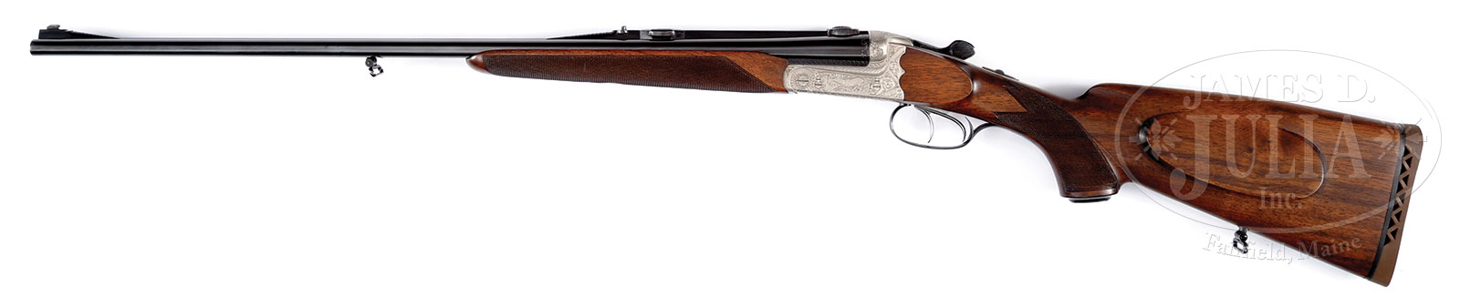 *FINE QUALITY, NEAR NEW, BOXLOCK EJECTOR DOUBLE RIFLE BY JOSEF WINKLER OF FERLACH RETAILED BY GRECO SPORT IN LUGANO.SN 423145. Cal. 9.3 x 74R. 25-1/2″ Chopper lump bbls fitted with matted quarter rib which supports claw scope bases and one standing leaf rear sight, and matching front base with silver bead, are marked with retailers name and address on mid rib, and with caliber on unmatted portion of quarter rib. Bbl flats are stamped with 1969 Ferlach nitro proofs. Bottoms of bbls are stamped with steel type (Bohler Antinit), and caliber. Josef Winkler’s mark is on bottom of right bbl. A sling loop is screwed to bottom rib. Coin finished scallop-backed boxlock action features automatic safety, crossbolt third fastener, disc set strikers, reinforced frame, and dbl triggers (front set). Action is engraved with well cut scroll and some geometric borders which surround semi-relief game scenes, suitable quarry for this caliber; running stag on left side, charging wild boar on right. A European elk (moose) is on trigger plate. Top lever and trigger guard are blued, and have matching scroll. Relatively plain European walnut slightly hog-backed capped pistol grip buttstock measures 14-1/2″ over open sided brown pad, and features right hand shadow line cheekpiece, chin strap transition to grip, which is checkered in point pattern, as well as a sling loop matching that on bbl. Matching beavertail ejector forend with Deeley release, has engine turned iron. Drop at heel: approx 3-1/4″, drop at comb: approx 1-13/16″. Cast: slightly off . Weight: 7 lbs. 12 oz. LOP: 14-1/2″. CONDITION: Excellent, essentially as new, appears unfired since proof, with only a few faint handling and assembly marks on wood and metal. Mechanically excellent. 53022-6 MGM (7,000-10,000) C&R – Lot 1272