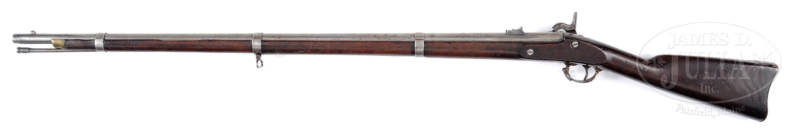 1863 DATED CONFEDERATE RICHMOND RIFLED MUSKET.NSN. Cal. 58. This is a pleasing example of the popular Richmond rifle musket. Standard configuration 40″ rnd bbl, brass buttplate and nosecap. Lock is nicely marked forward of hammer “C.S. / RICHMOND, VA” and rear of hammer “1863”. No bbl date, but Springfield “VP” proof is visible. Stock is sound showing good color and patina. CONDITION: Very good overall. Gun is mechanically sound with clear smooth bore where either shot out or reamed for use as shotgun after the war which now measures about 60 Cal. Ramrod appears orig from time of use and is from an Enfield musket. Rear sight is replaced. 53023-1 JS (4,000-6,000) – Lot 3059