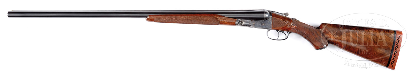*CUSTOM PARKER VH GRADE 12 GAUGE SHOTGUN.SN 175209. Cal. 12 gauge. 30″ Vulcan steel bbls. 3″ chambers. Chokes CYL/MOD. Full length matted top rib with steel front bead. No. 2 frame. Dbl triggers, extractors, non-automatic safety. Custom modern full pistol grip buttstock checkered in BHE grade pattern is of flame grained American walnut with 14-1/2″ LOP over Hawkins brand pad. Custom replacement beavertail forearm with Fleur-de-lis checkered pattern with Deeley release. Frame marked “Parker Bros” on sides and zig-zag border pattern engraved. All visible SN’s match. WEIGHT: 7 lbs, 15 ozs. PROVENANCE: The Forrest G. Rhodes collection. CONDITION: Very good, as refurbished. Bbls retain approximately 95% restored blue finish. Custom stocks retain virtually all their custom finish. Receiver retains approximately 90% of its restored case hardened finish. Replacement trigger guard retains virtually all of it’s custom finish. Bores good with minor orange peel. Mechanics are functional. 53025-1 JSL (750-1,250) C&R – Lot 3213