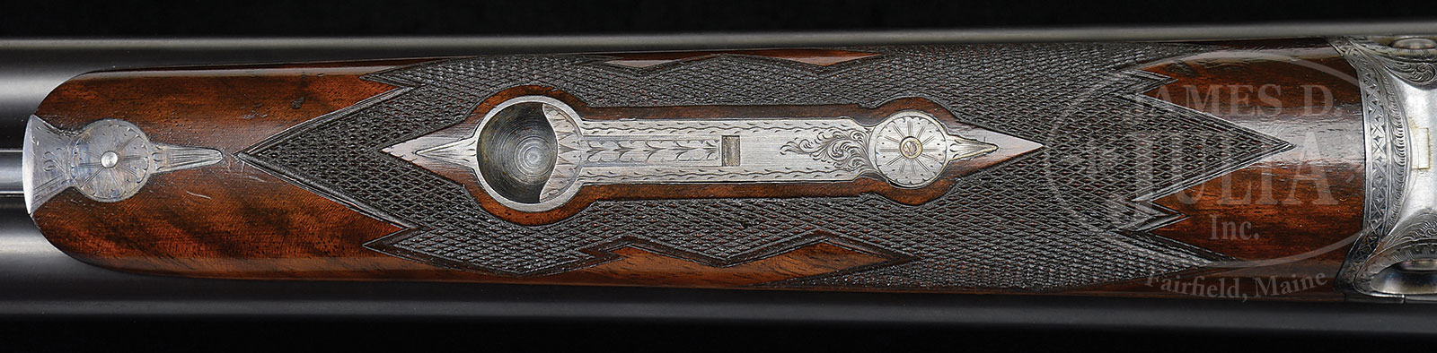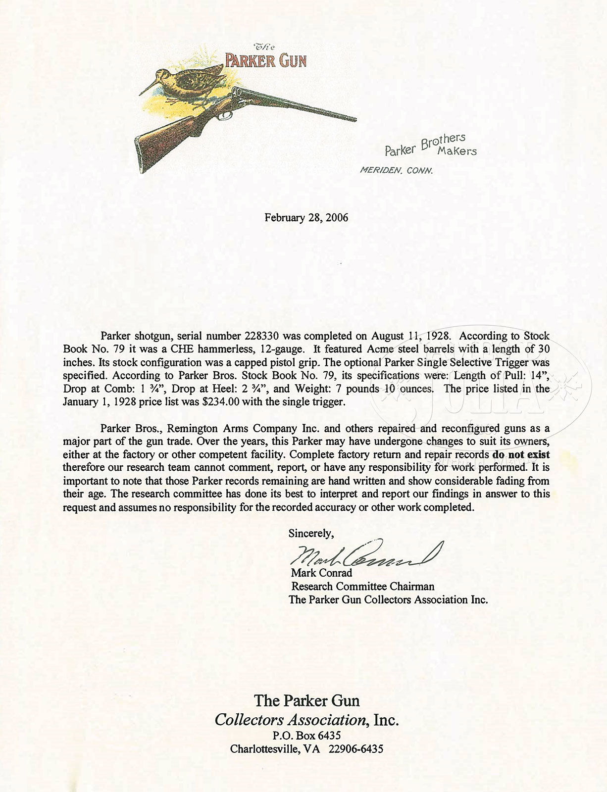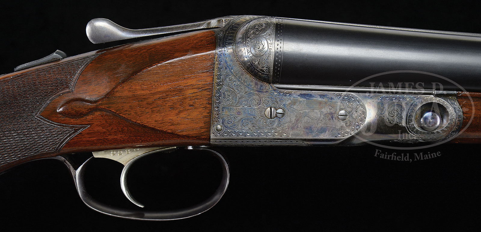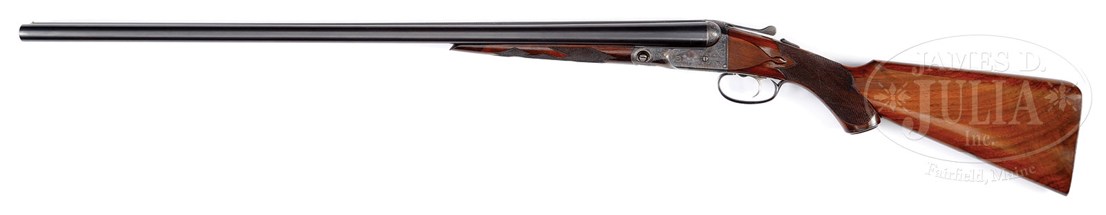 *SUPERB, HIGH ORIGINAL CONDITION, SCARCE PARKER “CHE” SINGLE TRIGGER SHOTGUN WITH FACTORY LETTER.SN 228330. (ca 1928) Cal. 12 ga. 2-3/4″ Chambers. 1-1/2 Frame. 30″ Bbls are marked “PARKER BROS. MAKERS. MERIDEN. CT. U.S.A. ACME STEEL” on matted game rib. Bbl flats and lumps are stamped with all correct markings along with Parker Overload proofs, and Remington repair code CNN3 (April 1951). Action has all correct patent and grade markings on water table, and features automatic safety and nickel-plated single selective Parker trigger. Action is engraved in “C” style with near full coverage scroll within geometric borders surrounding single dogs on sides. “PARKER BROS” is behind dog scenes. Trigger plate has vignette of a duck flying over a marsh. Nicely figured American walnut Parker capped pistol grip buttstock measures 13-3/4″ over skeleton buttplate. Stock is finished in “C” fashion with side panels, drop points, and fancy pattern checkering at grip. Matching splinter ejector forend has typical release and patent date on iron. Bore diameter: left -.730, right – .731. Bore restrictions: left – .035 (full), right – .037 (full). Wall thickness: left – .034, right – .031. Drop at heel: 2-11/16″, drop at comb: 1-3/4″. Cast: neutral. Weight: 7 lbs. 11 oz. LOP: 13-3/4″. Gun matches PARKER GUN SERIALIZATION AND IDENTIFICATION ledger. PROVENANCE: Factory letter stating gun was completed in 1928, and confirming specifications. CONDITION: Excellent, partially and lightly refinished, most likely by factory. Bbls retain essentially all of a correct re-blue, which may have been done when gun was returned to factory in 1951. Action retains 95%+ orig case hardening color, only slightly silvered on high edges of beads and fences. Forend latch retains about half of its orig color, but thinned. Trigger guard re-blued, engraving slightly softened. Stocks retain over 90% what appears to be orig varnish, perhaps with a bit of oil rubbed in as maintenance, with some light marks. Checkering is beginning to darken. Bores are excellent. Mechanically excellent. A very clean high grade Parker, All “C” grade Parkers are fairly scarce, with about 1700 hammerless guns being made, with an estimated 184 in twelve gauge with 30″ bbls. 53050-4 MGM (15,000-25,000) C&R – Lot 1305
