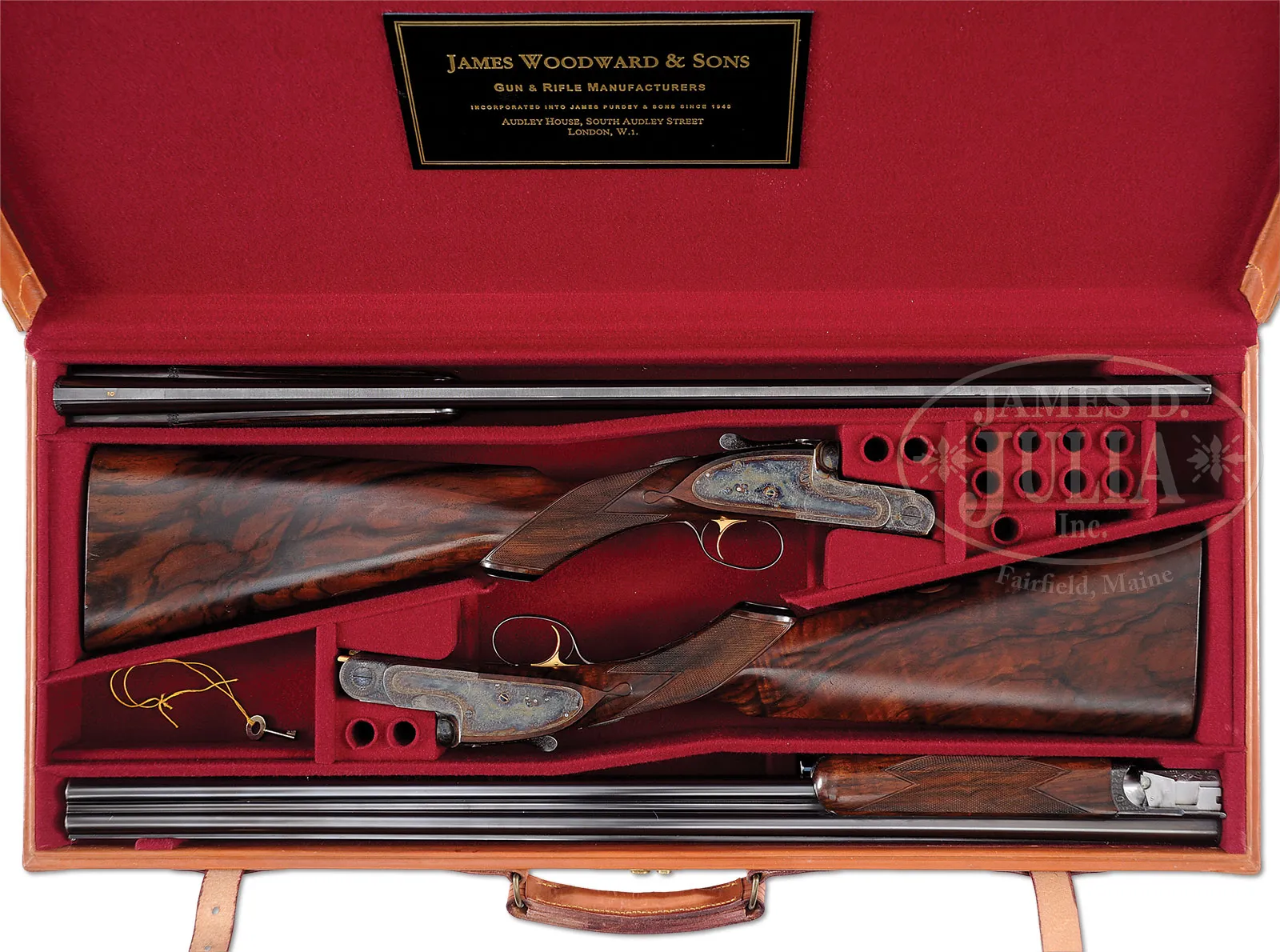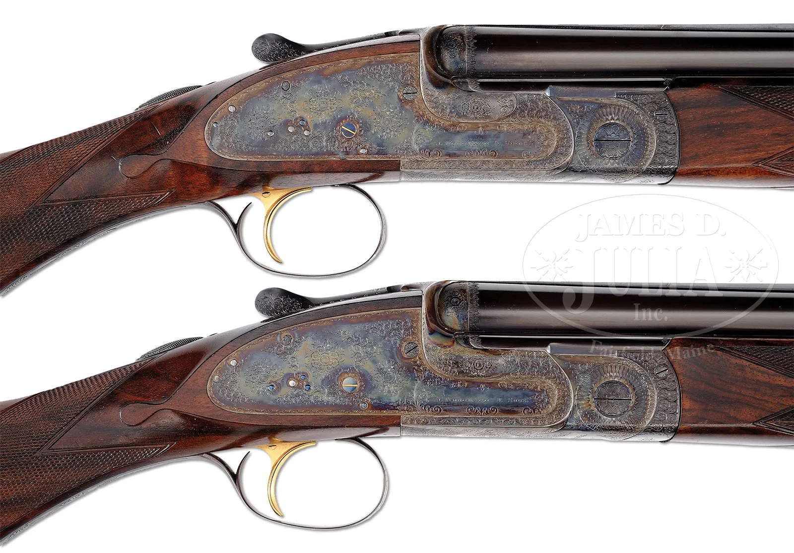 *AN INCREDIBLE FIND, THE FIRST WOODWARDS MADE AFTER PURDEY’S RESURRECTED THIS FAMOUS BRAND; A PAIR OF 20 GAUGE SIDELOCK EJECTOR SINGLE TRIGGER OVER-UNDER GAME SHOTGUNS WITH CASE.SN 7185/7186. Cal. 20 ga. 2-3/4″ Chambers. Purdey’s bought the Woodward name and patents in June 1948 and builds their OU guns to this patent. No “Woodward’s” were made until 1997 when these two guns were produced. They have 28″ demi-bloc bbls fitted with Teague chokes, and with solid matted ribs gold inlaid “1” and “2” on breech ends denoting a true pair. (“1” and “2” also appear on top levers and forend tips.) Left sides of top bbls are engraved “J. Woodward & Sons” and with Purdey’s famous Audley House South Audley Street London address. Bbl flats are stamped with 1995 London nitro proofs for 2-3/4″ chambers, and with SNs. Case hardened low profile OU actions with automatic safeties (made in classic Woodward T-shape) and gold-plated single triggers, follow traditional Woodward styling with slight reinforce to action bars, and usual house style Woodward engraving consisting of 80% coverage sprays of well cut scroll around circular rose bouquets on lockplates which are also engraved “J. Woodward & Sons” in classic Woodward parchment scroll flanked devices. Bottoms of actions are engraved “Woodward’s” “PATENT” “Under & Over”. Blued trigger guards with scroll on bows have SNs in shaded fields on tangs which extend to horn grip caps. Stocks also recreate Woodward style with long sweeping “Prince of Wales” grips and sloping rise to combs. Stocks are of nicely matched, well veined and somewhat fiddle figured European walnut, and measure 15-3/4″ over checkered wood butts. Matching small one piece forends have Anson releases. Ejector work is gold-plated. Gun “1”: Bore diameter: top -.613, bottom – .613. Bore restrictions: Teague screw chokes. Wall thickness: top – .031, bottom – .032. Drop at heel: 2-1/8″, drop at comb: 1-1/2″. Cast: approx 1/2 off. Weight: 6 lbs. 9 oz. LOP: 15-3/4″. Gun “2”: Bore diameter: top -.613, bottom – .613. Bore restrictions: Teague screw chokes. Wall thickness: top – .032, bottom – .029. Drop at heel: 2-3/16″, drop at comb: 1-1/2″. Cast: approx 1/2 off. Weight: 6 lbs. 9 oz. LOP: 15-3/4″. High quality leather case with stitched leather corners is lined in burgundy cloth, and has gold embossed black leather Woodward Audley House label in lid. CONDITION: Excellent with evidence of some field use. Bbls have silvering at muzzles and sharp edges, with a few light dings along edges of ribs, consistent with being run in and out of full length field carrying cases. Actions are somewhat silvered on beads with color thinning a bit around bottoms. Trigger guards silvered on edges. Stocks show scattered light marks and scratches in their orig finishes, with considerable ring marks and other scratches on forends, with finish wearing thin. This is most evident on gun “2”. Bores are excellent. Mechanically excellent. Case leather shows only a scattering of light marks, and a few rubs. Straps and handle remain strong. Interior cloth is excellent, as is label. 53052-5 MGM (60,000-80,000) C&R – Lot 1193