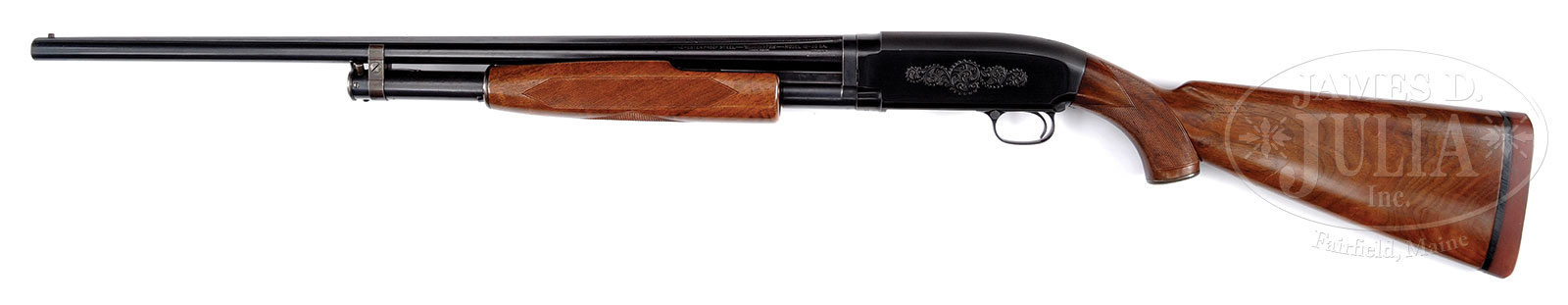 *WINCHESTER MODEL 12 20 GAUGE SHOTGUN WITH CUSTOM SCROLL ENGRAVING.SN 701295. Cal. 20 ga. 26″ solid rib bbl with steel mid and red plastic front bead. 2-3/4″ chambers. Choke marked WS-1. Buttstock with capped pistol grip checkered in 2-point pattern with 14-3/8″ LOP over modern Silver’s type red pad. Forearm with elongated diamond pattern checkered at sides and diamond in center. Bottom of magazine tube with SN. Bottom of frame with SN and marked “SKEET”. Receiver has been custom scroll engraved on sides in about 30% coverage. All visible SN match. WEIGHT 6 lbs 14 oz. CONDITION: Very good as customized and partially refinished. Bbl retains approximately 90% of what appears to be its orig blued finish. Receiver retains nearly all of its custom blued finish. Buttstock has been restored. Checkering re-cut long ago and now shows some handling marks with light scratches and some minor staining behind grip cap and on top of comb. Forend with approximately 3″ triangular shaped piece broken out and repaired near frame which is now stable and hardly noticeable, otherwise retains approximately 90% of its restored finish. Mechanics are fine. Bore is very good with some minor staining noted. 53056-4 JSL (1,000-1,500) C&R – Lot 3237