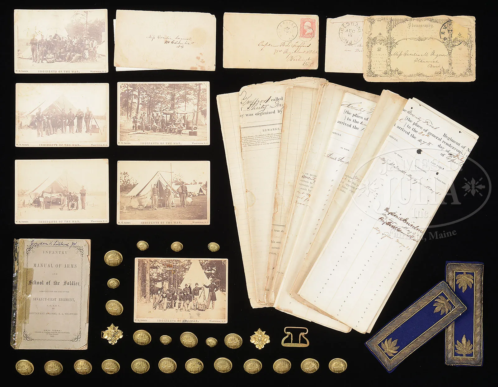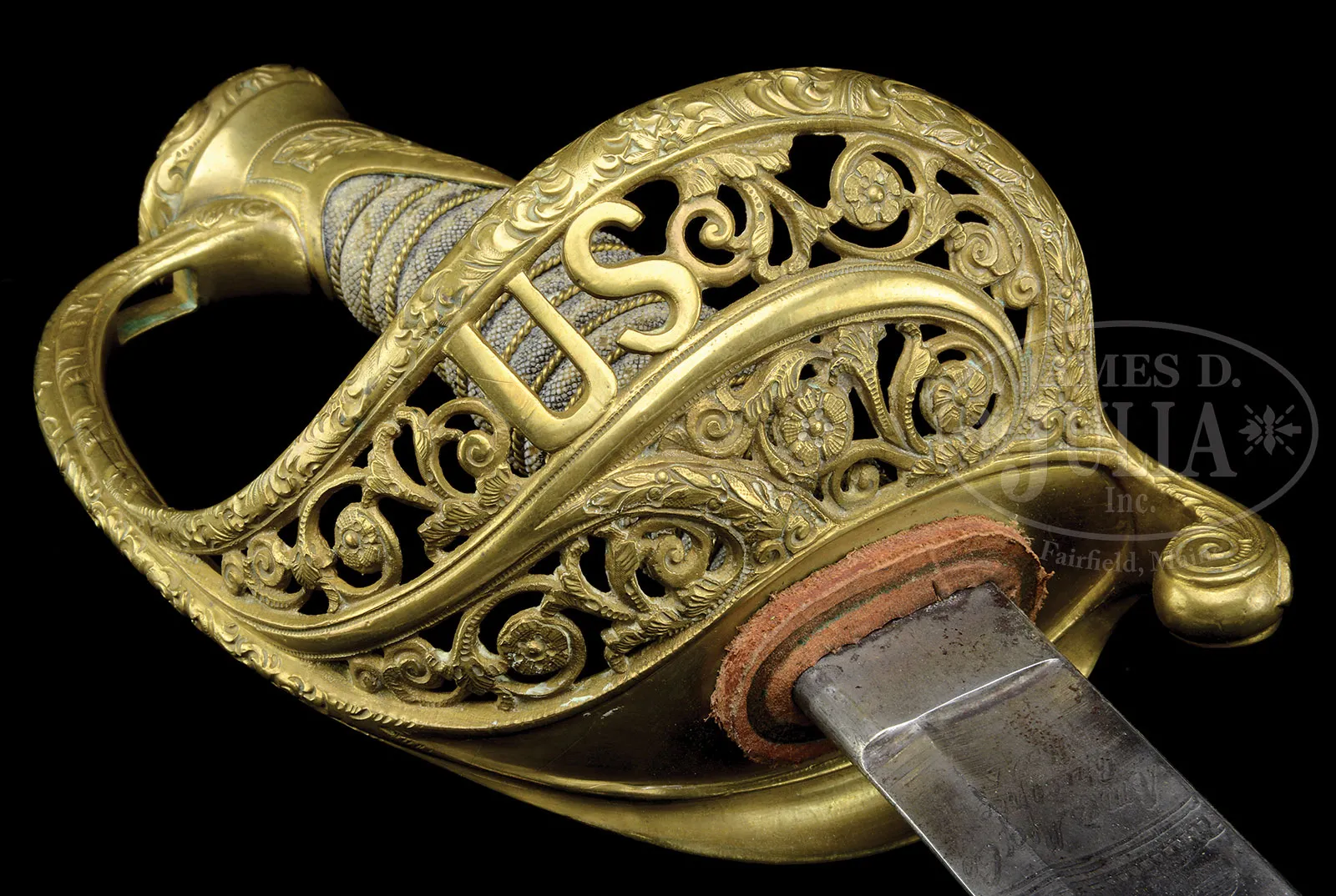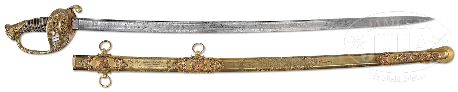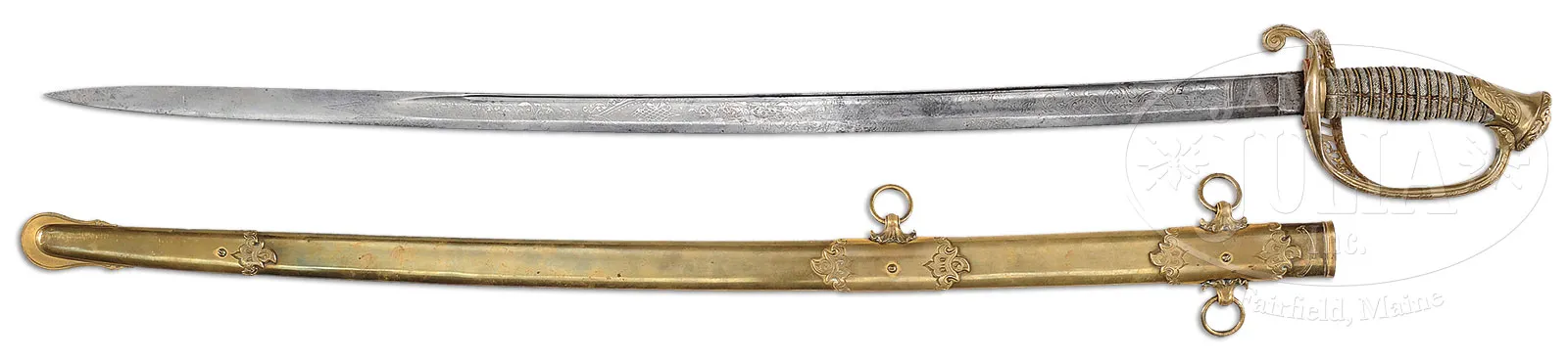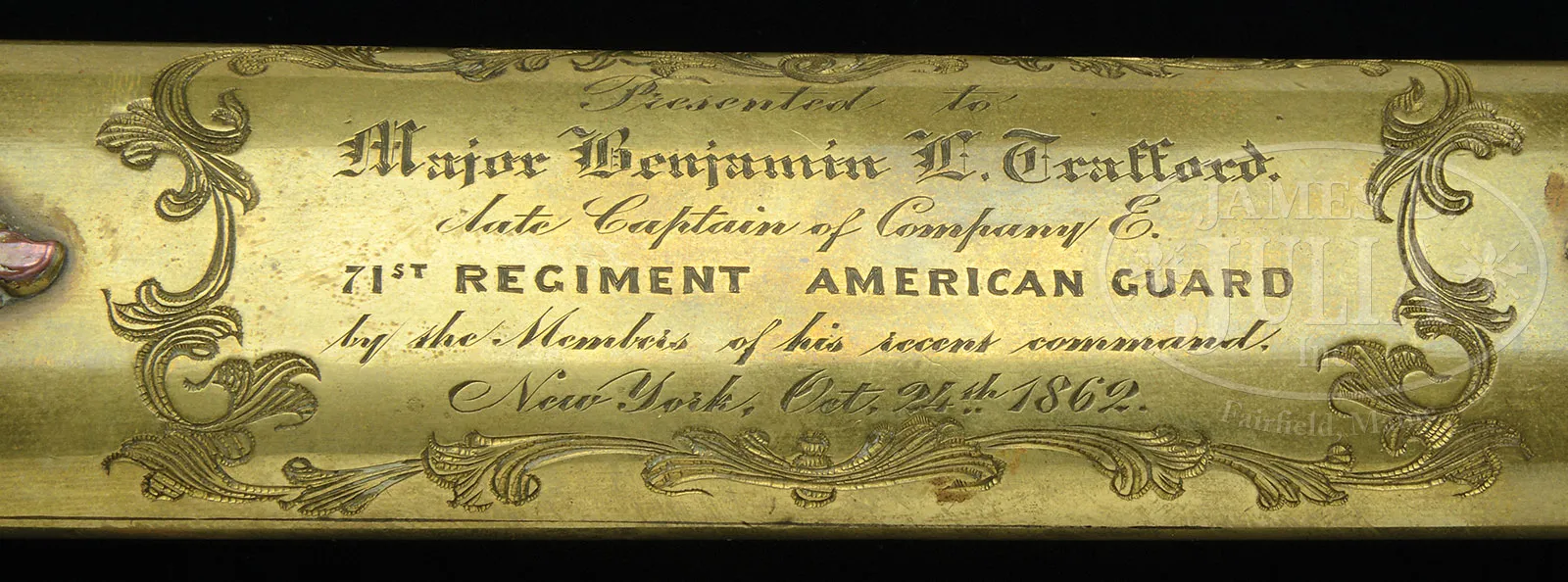 AMES HIGH GRADE PRESENTATION MODEL 1850 STAFF AND FIELD OFFICER’S SWORD, MAJOR BENJAMIN TRAFFORD, 71ST NEW YORK “THE AMERICAN GUARD” WITH WARTIME ARCHIVE.This is among the highest grade Ames staff officer’s sword with engraved brass scabbard with applied relief decoration to scabbard mounts, sharkskin grip with extra engraving on hilt and pommel. 32″ blade has Ames finer “spiderweb” etching with military motifs. Blade and scabbard are both marked with full firm address, “AMES MFG CO, CHICOPEE, MASS”. The scabbard has engraved presentation between the top mounts: “PRESENTED TO / MAJOR BENJAMIN L. TRAFFORD / LATE CAPTAIN OF COMPANY E / 71ST REGIMENT AMERICAN GUARD / BY THE MEMBERS OF HIS RECENT COMMAND / NEW YORK OCT. 24TH 1862. Colonel Trafford was born in New York City in 1836. At the age of 18 he entered the 71st NYNG as Private, and was soon after promoted Corporal. When the war began, Trafford was commissioned Captain April 19, 1861, with final rank of Colonel May 13, 1863. Trafford and the 71st participated in the Battle of Bull Run, where he behaved with great gallantry. He served also in the campaign of 1862. When the rebel invasion of Pennsylvania was made in 1863, Colonel Trafford was in command of the regiment. On the arrival of the regiment at Harrisburg, it was brigaded with the 8th N.Y. Regiment. General J. M. Varian was the Colonel command the 8th at the time, and being senior officer he was placed in command of the provisional brigade. The brigade was engaged in the defense of railroads and bridges. On the night of June 21, the two regiments were to take the cars at Chambersburg for Carlisle. It was divided into two wings with one company as skirmishers. Colonel Trafford remained with the skirmishers, that being the most dangerous position. When the troops took the cars, Colonel Trafford missed the left wing of his command, and although Colonel Varian assured him that, excepting the company of skirmishers, the 71st was aboard the cars, Colonel Trafford was not satisfied. The rain was falling heavily and the roads were very muddy; nevertheless Colonel Trafford rode off in the darkness in search of his missing soldiers. Eventually he found them, wet and fatigued after a march of twenty miles. He secured a train of cars and sent them on to join the remainder of his regiment. He returned with his command soon after to assist in quelling the New York draft riots. Colonel Trafford resigned his command of the 71st in 1866, and about this time published a monograph on military tactics, which had a wide circulation. This sword is accompanied by a small archive of Colonel Trafford’s including several war time muster rolls signed by Trafford, name plate from his saddle, Infantry Manual of Arms written by Trafford and published in 1863 for the 71st Regiment, 80 pgs in wraps missing back cover with tape repair to spine, Major and Lieut. Colonel shoulder straps, cased epaulets, straight razor, swatch of his hair with old tag, several copies of his obituaries and many wartime letters and photographs, a few post-war photos of Trafford, 23 Civil War New York state seal buttons that were once on Colonel Trafford’s coat along with gilded sterling sash buckle and 1855 patent coat tightening buckle. PROVENANCE: The esteemed collection of Rafael Cruz. CONDITION: Sword is very good overall. Grey blade with some luster and discernible etching. Brass scabbard mounts and hilt are cleaned with light mustard patina with strong traces of gilt in protected areas. Inscription and engraving all crisp and discernible. Protective washer has been replaced. Sharkskin has typical longitudinal separation but intact, including twisted brass wire wrap with wear through at high spots and loss of much of its black dye. Several muster rolls are broken at folds. Infantry manual is missing back cover and has tape repairs as noted. Buttons, letters, photographs and shoulder straps are all very good. 53073-20 JS (8,000-12,000) – Lot 1371