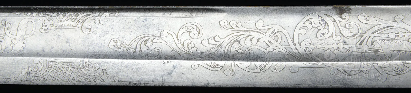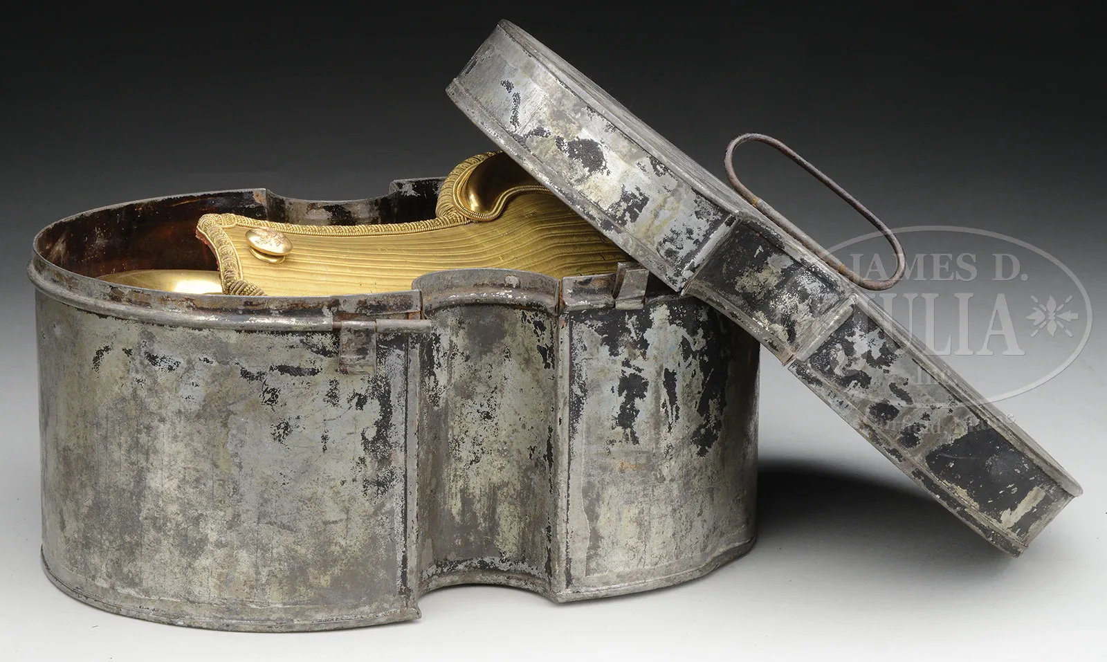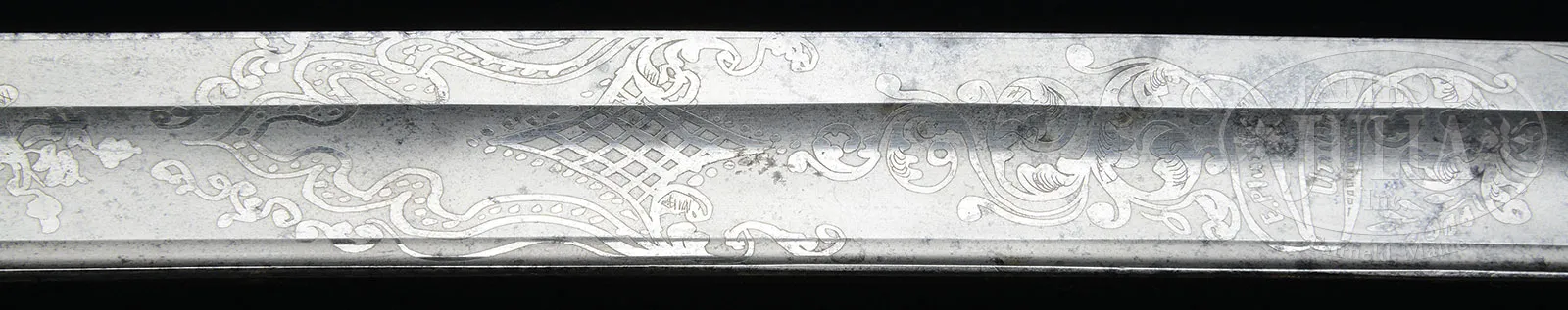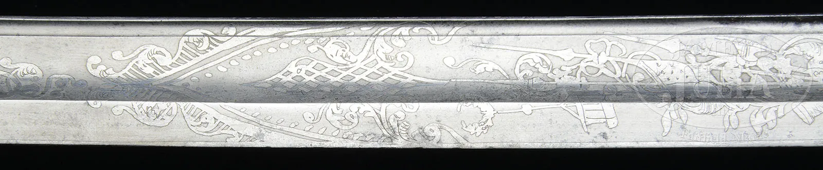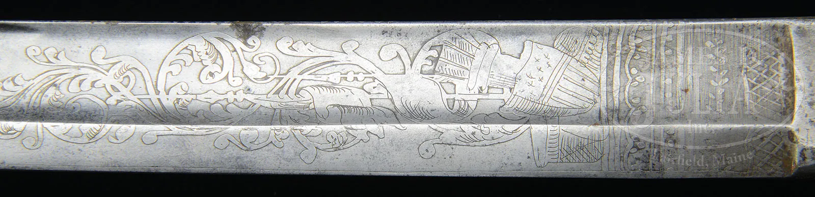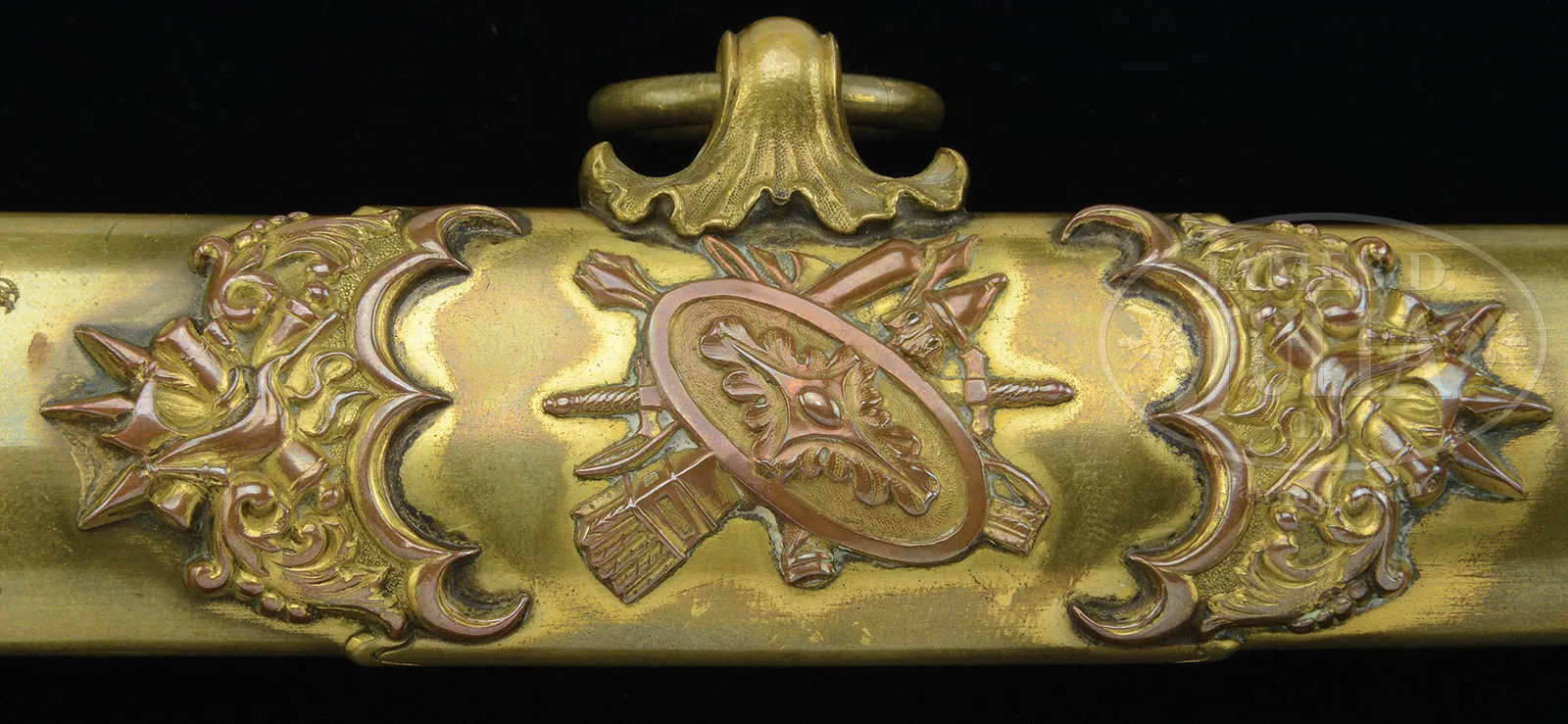 AMES HIGH GRADE PRESENTATION MODEL 1850 STAFF AND FIELD OFFICER’S SWORD, MAJOR BENJAMIN TRAFFORD, 71ST NEW YORK “THE AMERICAN GUARD” WITH WARTIME ARCHIVE.This is among the highest grade Ames staff officer’s sword with engraved brass scabbard with applied relief decoration to scabbard mounts, sharkskin grip with extra engraving on hilt and pommel. 32″ blade has Ames finer “spiderweb” etching with military motifs. Blade and scabbard are both marked with full firm address, “AMES MFG CO, CHICOPEE, MASS”. The scabbard has engraved presentation between the top mounts: “PRESENTED TO / MAJOR BENJAMIN L. TRAFFORD / LATE CAPTAIN OF COMPANY E / 71ST REGIMENT AMERICAN GUARD / BY THE MEMBERS OF HIS RECENT COMMAND / NEW YORK OCT. 24TH 1862. Colonel Trafford was born in New York City in 1836. At the age of 18 he entered the 71st NYNG as Private, and was soon after promoted Corporal. When the war began, Trafford was commissioned Captain April 19, 1861, with final rank of Colonel May 13, 1863. Trafford and the 71st participated in the Battle of Bull Run, where he behaved with great gallantry. He served also in the campaign of 1862. When the rebel invasion of Pennsylvania was made in 1863, Colonel Trafford was in command of the regiment. On the arrival of the regiment at Harrisburg, it was brigaded with the 8th N.Y. Regiment. General J. M. Varian was the Colonel command the 8th at the time, and being senior officer he was placed in command of the provisional brigade. The brigade was engaged in the defense of railroads and bridges. On the night of June 21, the two regiments were to take the cars at Chambersburg for Carlisle. It was divided into two wings with one company as skirmishers. Colonel Trafford remained with the skirmishers, that being the most dangerous position. When the troops took the cars, Colonel Trafford missed the left wing of his command, and although Colonel Varian assured him that, excepting the company of skirmishers, the 71st was aboard the cars, Colonel Trafford was not satisfied. The rain was falling heavily and the roads were very muddy; nevertheless Colonel Trafford rode off in the darkness in search of his missing soldiers. Eventually he found them, wet and fatigued after a march of twenty miles. He secured a train of cars and sent them on to join the remainder of his regiment. He returned with his command soon after to assist in quelling the New York draft riots. Colonel Trafford resigned his command of the 71st in 1866, and about this time published a monograph on military tactics, which had a wide circulation. This sword is accompanied by a small archive of Colonel Trafford’s including several war time muster rolls signed by Trafford, name plate from his saddle, Infantry Manual of Arms written by Trafford and published in 1863 for the 71st Regiment, 80 pgs in wraps missing back cover with tape repair to spine, Major and Lieut. Colonel shoulder straps, cased epaulets, straight razor, swatch of his hair with old tag, several copies of his obituaries and many wartime letters and photographs, a few post-war photos of Trafford, 23 Civil War New York state seal buttons that were once on Colonel Trafford’s coat along with gilded sterling sash buckle and 1855 patent coat tightening buckle. PROVENANCE: The esteemed collection of Rafael Cruz. CONDITION: Sword is very good overall. Grey blade with some luster and discernible etching. Brass scabbard mounts and hilt are cleaned with light mustard patina with strong traces of gilt in protected areas. Inscription and engraving all crisp and discernible. Protective washer has been replaced. Sharkskin has typical longitudinal separation but intact, including twisted brass wire wrap with wear through at high spots and loss of much of its black dye. Several muster rolls are broken at folds. Infantry manual is missing back cover and has tape repairs as noted. Buttons, letters, photographs and shoulder straps are all very good. 53073-20 JS (8,000-12,000) – Lot 1371
