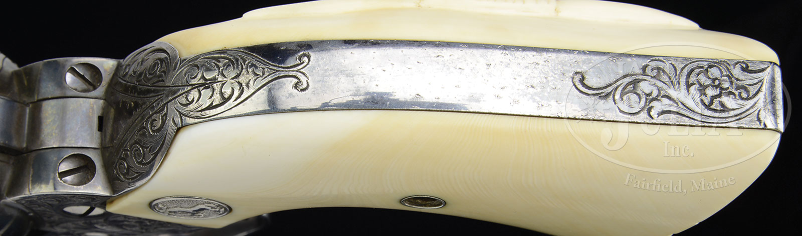 *VERY RARE & DESIRABLE FACTORY ENGRAVED FULL SILVER-PLATED COLT SINGLE ACTION ARMY REVOLVER 4-3/4″ BBL MARKED COLT FRONTIER SIX-SHOOTER 44-40, W/FACTORY LETTER.SN 350181. Cal. .44 WCF. 4-3/4″ bbl. Full factory silver plating is one of the scarcest finishes for the Colt SAA. No. 350181 is ultra-rare. The characteristic Wilbur Glahn engraving decorates the bbl, frame, cyl, backstrap and trigger guard in his usual rose and scroll style. Revolver features Colt factory medallion steer head ivory grips with five notches carved out at the base of left grip; significance is unknown. Silver plating has assumed a most attractive deep blue-black color and has not been polished. .44-40 at 4-3/4″ SAA’s of this period are rarely encountered. Accompanied by a Colt Factory Letter confirming configuration and Silver finish, Steer head carved ivory grips, Factory “Level 2” Engr, Shipped Oct 18,1926 to Richards & Conover Hardware Co in a shipment of 2 guns. PROVENANCE: The esteemed collection of Rafael Cruz. CONDITION: This beautiful revolver retains most of its orig factory silver plating, engraving is as crisp as the day it left the factory with very little wear. Bore is mint and front of cyl shows only factory test firing. Action is crisp as new. Carved steer head grips fit perfectly. All together a fantastic revolver in the extremely desirable .44-40 cal. Special Note: This item(s) contains plant or animal properties that may be covered by the Endangered Species Act (ESA). Please read the Conditions of Sale, section 15, for more information regarding the Endangered Species Act, and your responsibilities as a buyer. 53073-7 (40,000-60,000) C&R; ESA – Lot 1412