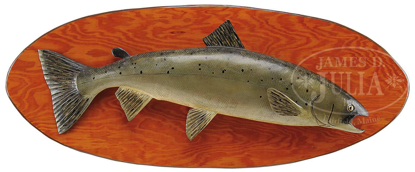 CARVED AND PAINTED 33″ LEAPING SALMON BY LAWRENCE C. IRVINE, WINTHROP, MAINE.Third quarter 20th century. Mounted on a natural oval back board. Signed on reverse. SIZE: Plaque: 16″ h x 40″ l. CONDITION: Very good. 53076-18 WAG (1,750-2,750) – Lot 1456