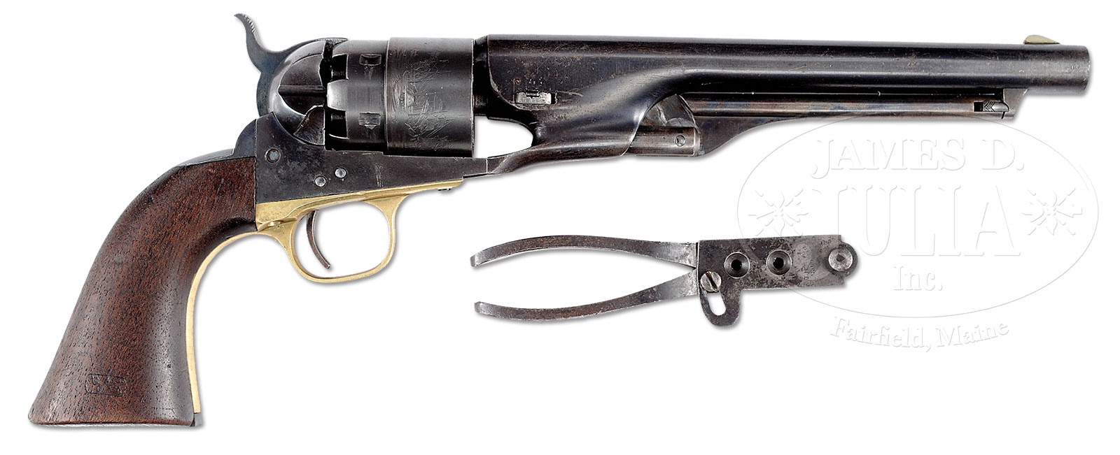 EXTREMELY FINE CIVIL WAR MARTIALLY MARKED COLT MODEL 1860 ARMY PERCUSSION REVOLVER.SN 8099C. Cal. 44. This is an extremely fine example of a martial late-1862 US cavalry purchased Colt Army revolver. Blue and color case hardened with 8″ rnd bbl, German silver front sight and 1-line U.S. America address. Frame has “COLT’S PATENT” stamped on left side and is 3-screw style. Cyl is usual rebated style with 6-chambers and Ormsby Naval battle scene roll marking. All of the safety pins are serviceable. The brass trigger guard and iron backstrap contain a 1-pc walnut grip with last four digits of SN found in grip channel. Both sides of grip have inspector cartouches “JT” (John Taylor) and possibly “GDS”; most of the metal parts have inspector initials. According to Flayderman’s Guide to Antique American Firearms about 127,000 Model 1860 revolvers were purchased by the Federal Government for use in the Civil War. The vast majority of these revolvers were issued to front line troops and was the most extensively used handgun throughout the Civil War. This particular example is totally original and matching in every regard and has identical condition from muzzle to butt, you can not find a more honest Civil War example in such extremely fine functional condition with a scarce matching accompanying inspected “COLT’S PATENT” 2-cavity bullet mold. PROVENANCE: The collection of Robert Roughton. CONDITION: Fine to very fine overall, all matching and orig. Bbl retains about 70-80% orig blue though thinning with dings and dents around wedge slot. “Feathering” in finish is easily discerned around sight and loading arm catch. Frame, hammer, and loading arm retain strong traces of their bright case colors with balance muted and grey/silver. Cylinder finish has turned rather plum with only traces of its bright blue finish in protected areas. Shows virtually all of its crisp and well discerned Ormsby Naval battle scene. Trigger guard exhibits a smooth yellow brass patina. Backstrap and buttstrap retain about 50% of their thinning orig blue finish with the balance gray. Grip is sound, solid, well fit with very good discernible inspector cartouches with edge wear as can be seen in photos. Mechanics are excellent and bore is crisp, shiny and well discerned. Wedge retaining spring is present, however has become detached and can be removed when wedge is pulled from revolver. Frame screws show evidence of having been disassembled with an ill fitting screwdriver at a much earlier period. Accompanying mold is very good to fine overall, retaining traces of finish with staining and pitting, well marked “44H” above inspection initials “AHK” (Albert H. Kirkham). 53079-15 (4,000-6,000) – Lot 3008