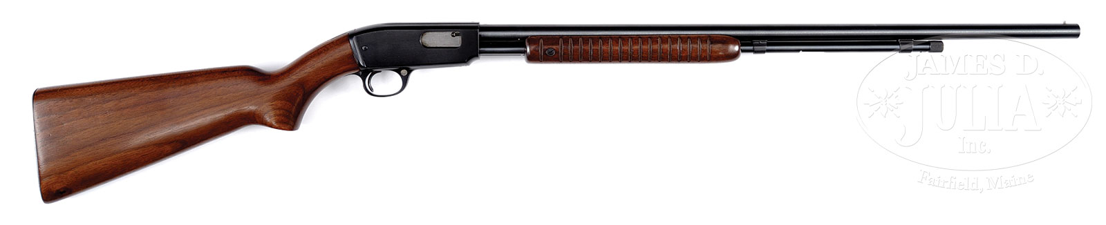 *RARE AND DESIRABLE WINCHESTER MODEL 61 SHOT-ONLY WITH UNCOMMON WINCHESTER COUNTER-BORED BBL.SN 247730. Cal. .22L RIFLE. Shot-only. 24″ rnd bbl with bead front sight and no provision for rear sight. Grooved receiver with blue finish on all metal components with exception of polished bolt. 2pc walnut stocks with 17-groove forearm and checkered steel buttplate. This desirable variation is known as the Type II smooth bore with a muzzle bore diameter of .265 and is counter-bored for approx 7″ from muzzle. Mfg in 1959. CONDITION: Prime overall condition with virtually no indication of actual use. Slight operational wear is evident on mag tube and bbl from only a modest amount of operation. The grooved receiver shows no indication of ever having a scope installed and the late 1950s Winchester polish is near perfect overall. The 2pc walnut stocks are equally fine making this a truly remarkable example and would exceedingly difficult to improve upon and would be a great addition to any collection. 53080-18 TDW (2,000-2,500) C&R – Lot 3253