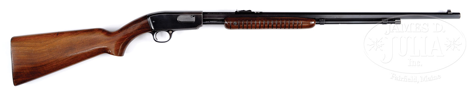*SCARCE AND DESIRABLE EARLY WINCHESTER MODEL 61 SLIDE ACTION RIFLE WITH OCTAGON BARREL.SN 75616. Cal. 22 SHORT. 24″ oct bbl, 3/4 magazine, full blue finish, straight grain American walnut stocks with pistol grip, grooved forearm and checkered steel shotgun buttplate. Bbl is mounted with standard sights. Left flat of bbl shows Winchester trademark, model and Cal. designation rolled. Right side of bbl shows Winchester address. “WP” proof is struck at bbl breech and on top of receiver. SN appears on bottom of frame on trigger guard. CONDITION: Very good to fine. Bbl retains 90% orig bright blue finish with some thinning toward the muzzle and high-point wear. Sights are very good. Markings are sharp. Bore is bright with strong rifling. Receiver retains 80% bright blue finish that has thinned at the carry point. Action bar shows some wear. Markings are sharp. There is a small stain in front of trigger guard. Stocks are very good, full sized and retain most of the varnish finish. Stocks show slight handling marks overall with some staining at the wrist. Buttplate shows most of the blue finish with some high-point wear. Mechanics are crisp. A nice example of an early Model 1861 Winchester Slide Action rifle with a rare octagon bbl. 53080-24 TEP (1,500-2,000) C&R – Lot 3261