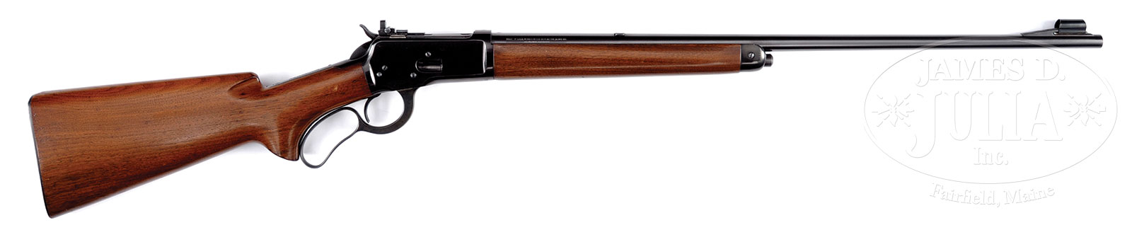 *RARE WINCHESTER MODEL 65 RIFLE WITH BOLT MOUNTED PEEP SIGHT.SN 1004895. Cal. 218 BEE. 24″ rnd bbl, half magazine, full blue finish. Straight grain American walnut stocks with plain pistol grip and checkered steel shotgun buttplate. Bbl shows Winchester Model and Cal. designation at the left breech. Right side shows Winchester address. Front sight is hooded and mounted on a ramp. Rear sight mortise is plugged with no evidence of a rear sight having been mounted. “WP” proofs are struck at the bbl breech and on receiver ring. SN is stamped on forward bottom part of receiver. Upper tang is marked “WINCHESTER / TRADEMARK / MADE IN U.S.A.”. CONDITION: Very fine. Bbl retains 95% orig blue finish that is drifting to a plum patina toward the muzzle with some slight muzzle wear. Front sight is very good. Markings are sharp. Bore is bright with strong rifling. Receiver also retains 95% orig blue with only minuscule handling marks and little carry wear. Hammer and lever retain considerable blue finish that has flaked partially from the lever. Mechanics are crisp. Stocks are fine, retaining most of the varnish finish with only minuscule handling marks overall. Buttplate retains considerable blue with wear at the heel and toe. Forend cap retains 98% blue finish. Here’s your chance to obtain a rare Model 64 rifle in fine condition, one of only 5,704 made. 53080-42 TEP (3,000-4,000) C&R – Lot 2444