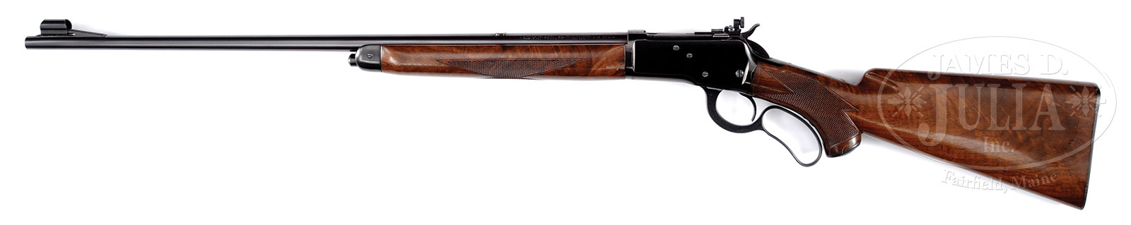 Please Note: This Winchester Model 65 has been upgraded to deluxe with fancy deluxe-style checkered stock and forend. It is not a factory Winchester Model 65 Deluxe. *RARE WINCHESTER MODEL 65 DELUXE RIFLE WITH BOLT PEEP SIGHT.SN 1005611. Cal. 218 BEE. 24″ rnd bbl, half magazine, full blue finish. Nicely figured American walnut stocks with checkered pistol grip and forearm. Pistol grip is capped. Checkered steel shotgun buttplate. Bbl shows Winchester Model and Cal. designation marked at the left breech with the Winchester address on the right. Front sight is hooded and mounted on a ramp. Rear sight mortise has been plugged with no evidence of a rear sight having been mounted. “WP” proofs are struck on bbl breech and receiver ring. SN is stamped on froward bottom of receiver. Upper tang is marked “WINCHESTER / TRADEMARK”/ MADE IN USA”. CONDITION: Very fine. Bbl retains 95% orig blue finish that has drifted to a plum patina toward the muzzle. Markings are sharp. Front sight is very good. Bore is bright with strong rifling. Receiver also retains 95% orig blue with only a few handling marks and no carry wear. Hammer and lever both retain most of the blue finish. Loading gate also retains most of the fire blue. Stocks are fine, full sized, retaining most of the orig varnish finish and only minuscule handling marks. Buttplate retains most of the blue finish, as does the forend cap. Mechanics are crisp. This is an opportunity to obtain an extremely rare, deluxe Model 64 Winchester rifle, one of only 5704 made. 53080-45 TEP (4,500-6,500) C&R – Lot 2443