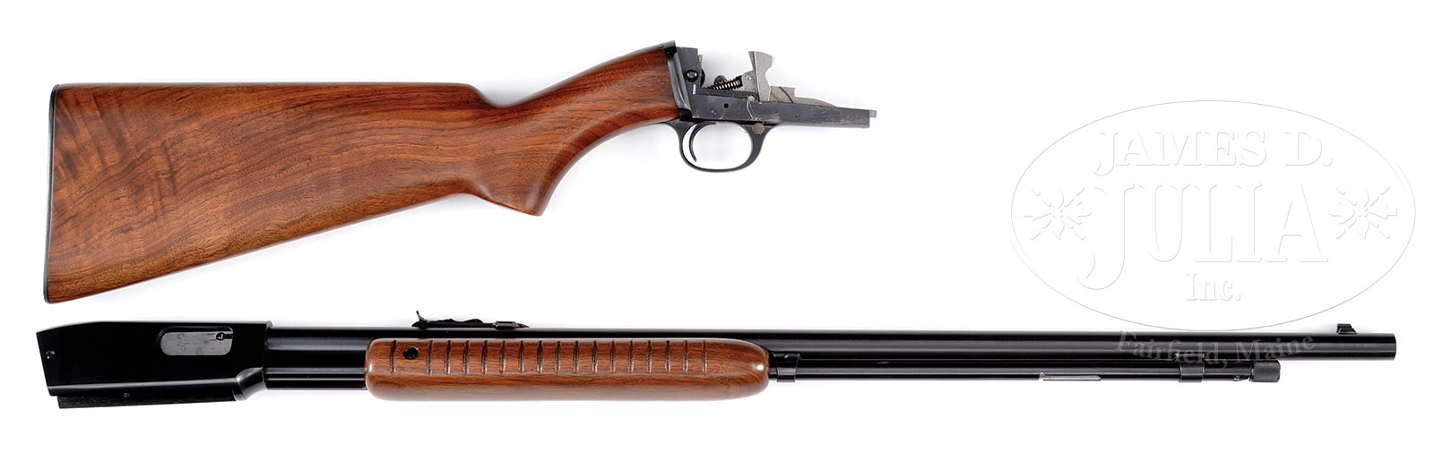 *EXTRAORDINARY WINCHESTER MODEL 61 SLIDE ACTION RIFLE IN ORIGINAL WINCHESTER SHIPPING BOX.SN 67883. Cal. 22 WRF. 24″ rnd bbl, 7/8 magazine, full blue finish, nicely figured American walnut stocks with plain pistol grip and grooved forearm. Bbl has Winchester address, trademark, model and Cal. designation rolled on left side in front of rear sight. “WP” proof is struck on top of bbl and receiver. SN appears on bottom front of receiver with same number struck on trigger guard. Accompanying box has orig craft paper. End label of box is numbered to this rifle. CONDITION: Extremely fine, nearly new in box. Rifle retains 99.9% of orig finish. Receiver has a light scratch on left side and two minuscule dings on bottom left corner under takedown screw. There are two small scratches on magazine tube. All markings are sharp. Stocks are extremely fine with no evidence of handling. Box is very good, intact with some staining overall. Label is clear. Mechanics were not tested. A rare opportunity to purchase a nearly new Winchester Model 61 rifle in a rare Cal. 53080-52 TEP (2,500-3,500) C&R – Lot 3249 Click here to view provenance