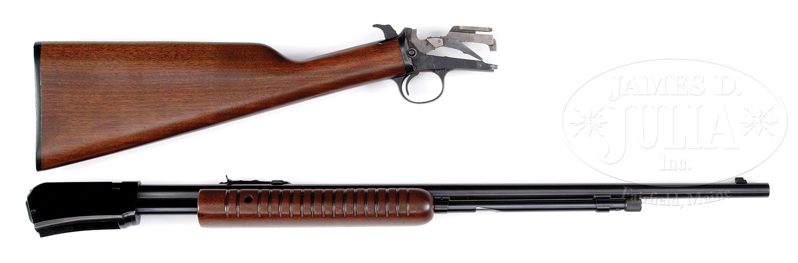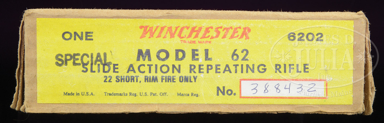 Please Note: Additional Information from Consignor: This is a Gallery Firearm and has a Pyramid Loading Port. *HIGHLY DESIRABLE WINCHESTER MODEL 62 “SPECIAL” SLIDE ACTION RIFLE IN ORIGINAL WINCHESTER CARDBOARD SHIPPING BOX.SN 388432. Cal. 22 SHORT. 23″ rnd bbl, 3/4 magazine, full blue finish, straight grain American walnut stocks with grooved forearm and hard rubber Winchester buttplate. Bbl shows Winchester address, trademark, model and Cal. designation rolled on left side by rear sight. “WP” proof is struck on top of bbl and receiver. Receiver is marked “WINCHESTER / TRADEMARK” in red letters on right side. SN is struck on forward bottom part of receiver and on lower tang. Numbers match. Box contains instruction sheet and Winchester hang tag. End label is numbered to this gun and is marked “SPECIAL”. CONDITION: Extremely fine. Rifle retains 99.999% of orig blue finish. Operating arm shows a slight scratch. Receiver still has packing grease. All markings are sharp and clear. Rifle was not assembled. Stocks show no apparent handling marks. Box is very good, intact. End label is clean and intact. Your chance to purchase a Model 62A Winchester “Special” in a condition that is nearly impossible to improve upon. 53080-56 TEP (2,250-3,250) C&R – Lot 3270