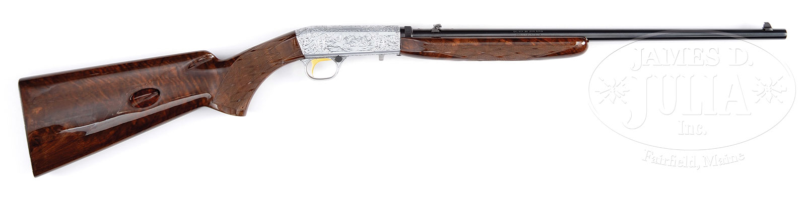 *BROWNING SEMI-AUTOMATIC 22 GRADE III RIFLE WITH CASE.SN 7IT56329. Cal. 22LR. 19-1/2″ bbl with flip-up rear sight. Full knob pistol grip, buttstock is skip line checkered in 3-point pattern with lined steel buttplate. Receiver is fabulously engraved with setter and pheasants on left, setter with duck in portrait on top and setter with ducks in marsh scene on right surrounded by well executed floral scroll engraving by “G. Cargnel”. Forearm is skip line checkered in 3-point pattern. Housed in a full length Enmebbi maroon leather and maroon velvet interior case. All visible SN match. PROVENANCE: Ex-Larry Kelley estate collection. CONDITION: Good. Likely test fired only. Retains virtually all orig finish to metal surfaces. Highly figured skip line checkered stocks are excellent with the exception of a wood repair on buttstock at confluence of right rear receiver and wrist. Bore is brilliant and shiny. Mechanics are crisp. Case is fine with only minor rub marks. Simply put, a gorgeous Browning. 53081-1 (2,000-3,000) C&R – Lot 3288