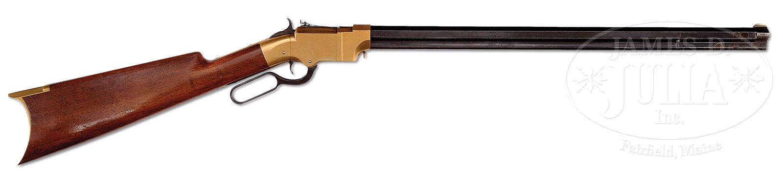 RARE AND DESIRABLE BRASS FRAME VOLCANIC RIFLE WITH SCARCE 21 INCH BARREL.SN 225. Cal. 41. 21″ bbl is one of the rarer bbl lengths that was offered at that time. Sgl line address with some chemical spill on front portion of bbl that has turned a dark patina. Brass has a light mustard color look with sharp edges on both sides. All numbers match with SN on inside of lower tang. Lovely colored brass frame with untouched appearance. Stock is straight grained American walnut. PROVENANCE: The spectacular collections of Ray Bentley featuring the finest and rarest deluxe antique Winchesters in the world. CONDITION: Very fine. Brass frame is extremely fine on both left and right sides of receiver. Retains its sharp edges. Brass looks like it has never been cleaned or polished. A fine example of what the brass should look like after 150 years of being cared for. Wood fit is extremely fine with one chip in stock next to receiver on right side. Gun cycles properly. Lever and hammer are muted with some dark blue on trigger. Follower retains nearly all of its original nitre bluing. Mint bore with very strong rifling. Mechanics are fine. Not many Volcanic rifles can match the condition of number 255’s frame. Obviously, this lovely rifle saw very little use and was tucked away in a drawer to keep it in such very fine condition. 53091-12 MS (40,000-60,000) – Lot 2001