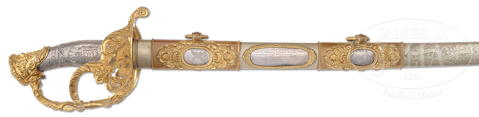 SPECTACULAR SILVER GRIPPED, GOLD BLADE HIGH GRADE STAFF OFFICER’S SWORD WITH BATTLE HONORS PRESENTED TO LT. COL. WILLIAM HENRY, 1ST NEW JERSEY.This is a magnificent high grade Horstmann, Philadelphia presentation sword with rare engraved sheet silver grip and sheet silver engraved insets on scabbard. “PRESENTED TO / LIEUT COLONEL WILLIAM HENRY, JR. / BY THE OFFICER’S OF THE FIRST REGIMENT NEW JERSEY / VOLUNTEERS, AS A PROOF OF AFFECTION AND A TRIBUTE TO / FIDELITY, GALLANTRY AND PATRIOTISM MOST NOBLY / ILLUSTRATED IN THE CAMPAIGNS OF THE / ARMY OF THE POTOMAC”. The scabbard is engraved with battle honors “BULL RUN”, “WEST POINT”, “GAINES MILLS”, “CHARLES CITY-ROADS”, “MALVERN HILL”, “MANASSAS PLAINS”, “CRAMPTON’S PASS”, “ANTIETAM”, “FREDERICKSBURG 1ST & 2ND BATTLES”, “SALEM CHURCH”. Opposite side of scabbard is engraved “COMMISSIONED ADJUTANT, 1ST N.J.V. / MAY 31 1861; MAJOR, AUGUST 12 1862; LIEU’T COL. NOVEMBER 29 1862”. The sheet silver grip is beautifully engraved with the state seal of New Jersey on one side and monogram of Adjutant Henry on the other side. The blade is the highest grade that Horstmann offered, being full Damascus with gold etched patriotic panels. Hilt displays drooped wing American eagle as central panel with a serpent shaped additional branch of guard terminating above eagles head into a serpent’s head. The German silver scabbard has relief mounts with 1-1/2″ engraved silver insets in each mount, patriotic American eagle surrounded by a sea of stars, Lady Liberty and Justice. Hilt and scabbard mounts are all heavily gilded and raised relief. William Henry, Jr (1830-1889) rose from Adjutant to Lieutenant Colonel and commander of the 1st New Jersey Volunteer Infantry during his Civil War service. Commissioned 1st Lieutenant and Adjutant on May 31, 1861, he served in this capacity in the Battle of First Bull Run and the Peninsular Campaign. Promoted to Major of the regiment on August 12, 1862 to replace Major David Hatfield, who had succumbed to wounds received at the June 27, 1862 Battle of Glendale, he then participated in the Battles of Second Bull Run, South Mountain and Antietam at this rank. When Lieutenant Colonel Mark Wilkes Collet was promoted Colonel of the 1st New Jersey, Major Henry was advanced to Lieutenant Colonel on November 29, 1862. Serving as second in command at the Battles of Fredericksburg and Chancellorsville, he assumed command of the 1st New Jersey, which was part of the famed First New Jersey Brigade, when Colonel Collet was killed at the Battle of Salem Church during the Chancellorsville Campaign (May 3, 1863).He led the regiment at the successive battles of Gettysburg, Mine Run, Wilderness and Spotsylvania. At the last battle he bravely led the unit as it assaulted the “Mule Shoe” salient. After jumping up on the Confederate works and waving his sword in defiance of the rebels, he remained at the front to conduct the retreat of the regiment when its Corps was ordered to pull back. Lieutenant Colonel Henry was the last man of the regiment to leave the battlefield. He was mustered out on June 23, 1864 when his term expired, receiving no brevet promotions despite a brave combat record. His younger brother was Captain Joseph Henry of the 9th New Jersey Volunteer Infantry, who was the first New Jersey officer to die in combat during the Civil War. PROVENANCE: The spectacular collections of Ray Bentley featuring the finest and rarest deluxe antique Winchesters in the world. CONDITION: Extremely fine overall, this sword was well cared for. Hilt retains 90% plus orig bright gold gilt. Scabbard mounts on obverse retain much of their gold gilt, especially in protected areas and relief engraved areas. Silver insets and silver grip have grey/silver patina. German silver scabbard body is smooth with silver patina with crisp engraving. 34″ blade is overall grey with dull luster showing Damascene patterns, retaining virtually all its orig gold with areas of staining and pitting, especially at tip and one central panel with eagle. A portion of the orig red velvet washer is retained. 53091-131 JS (7,000-9,000) – Lot 2139