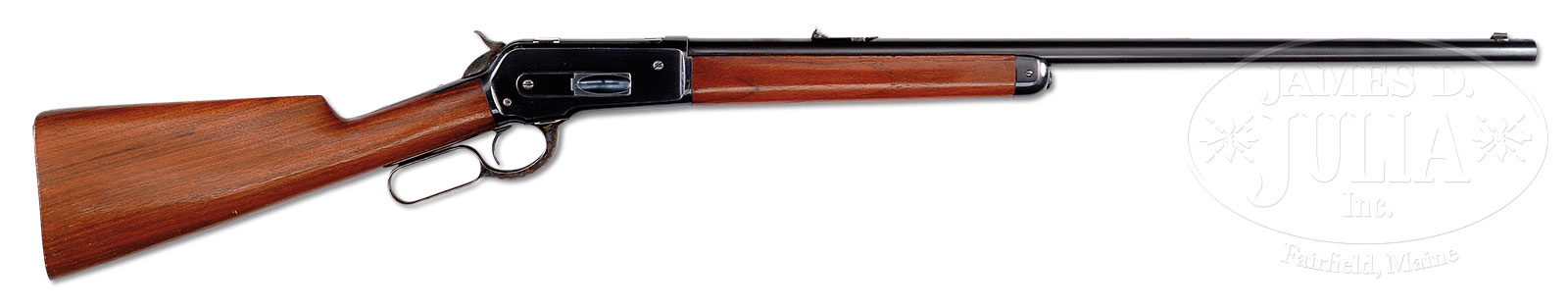 OUTSTANDING ANTIQUE “BIG FIFTY” WINCHESTER MODEL 1886 RIFLE IN 50 CAL EXPRESS.SN 108776. Cal. .50 EX. 26″ bbl. Rnd bbl with address reading “MANUFACTURED BY THE / WINCHESTER REPEATING ARMS CO. NEW HAVEN CONN. U.S.A.” with Express rear bbl sight with beaded front sight (bead missing). Left and right side blued receiver with nitre blue loading gate. Lower tang does not have any assembly line numbers attached to it, upper channel of stock and buttplate have a stamp “20”. Forend cap is blued and comes equipped with half-mag. Shotgun buttplate is metal and marked with assembly line number. Hammer and lever are case colored and all screws appear to be case colored as well. PROVENANCE: The spectacular collections of Ray Bentley featuring the finest and rarest deluxe antique Winchesters in the world. CONDITION: Excellent. Rnd bbl retains 95% blue with a few scattered surface rust spots near rear sight; may clean up. Both sides of receiver retains a good 98% blue. Top of receiver has one minute spot that has patinated. Case colored hammer retains 98% of case color with no dragged lines. Lever also retains 95-96% case color with no fading. Buttplate is blue and retains a good 90-05% blue, only wear is evident on heel of buttplate. Finish on stock has very few impressions and retains 98% of its orig finish overall. Forearm has several compression marks, very few impressions or scratches are evident on either side of forearm near forearm cap. Wood to metal fit on stock is very fine with no chips or splinters of wood missing. There are no cracks evident on the upper or lower tang. Screw heads are very fine with most of case color finish remaining. Rifle cycles properly. Brilliant shiny bore. Difficult to find these “Big Fifty’s” to begin with, with many being made after 1898. 53091-178 MS (30,000-40,000) – Lot 2050