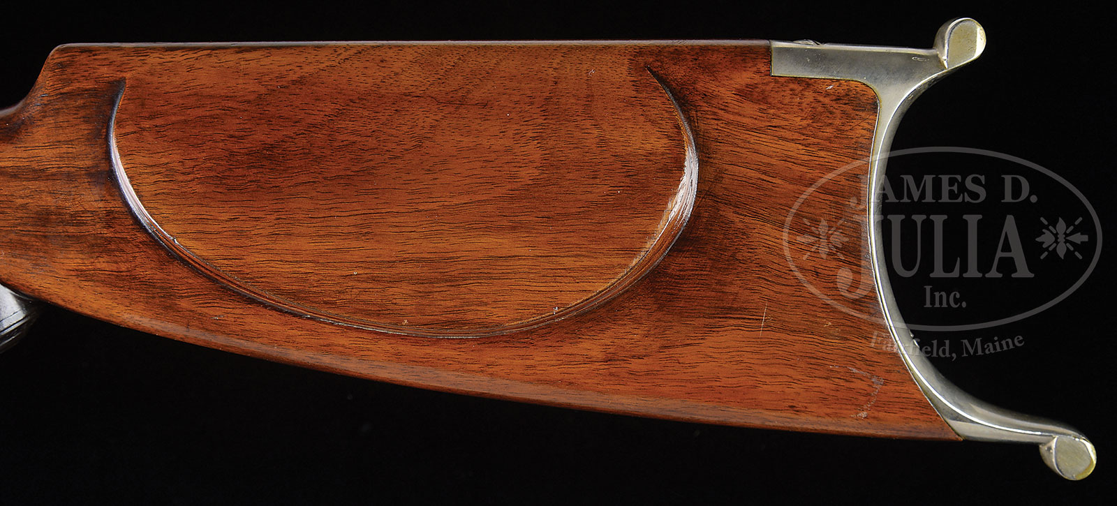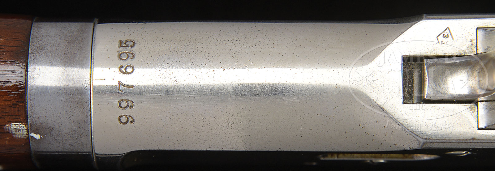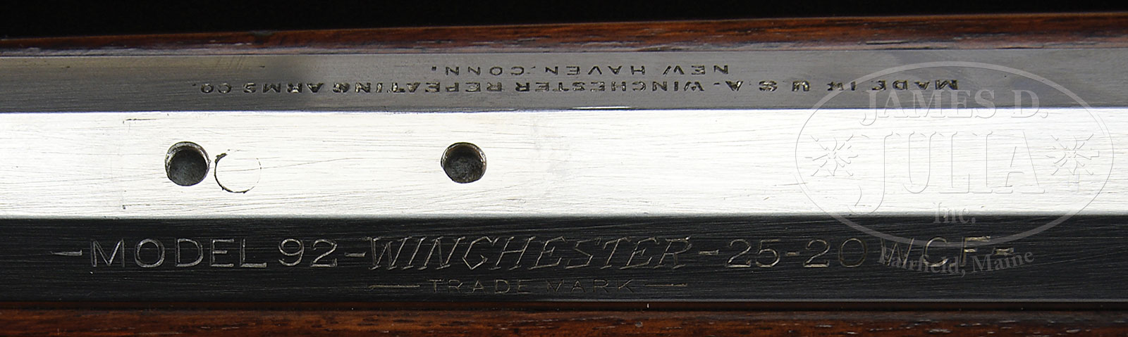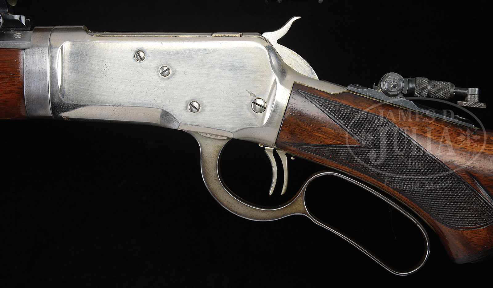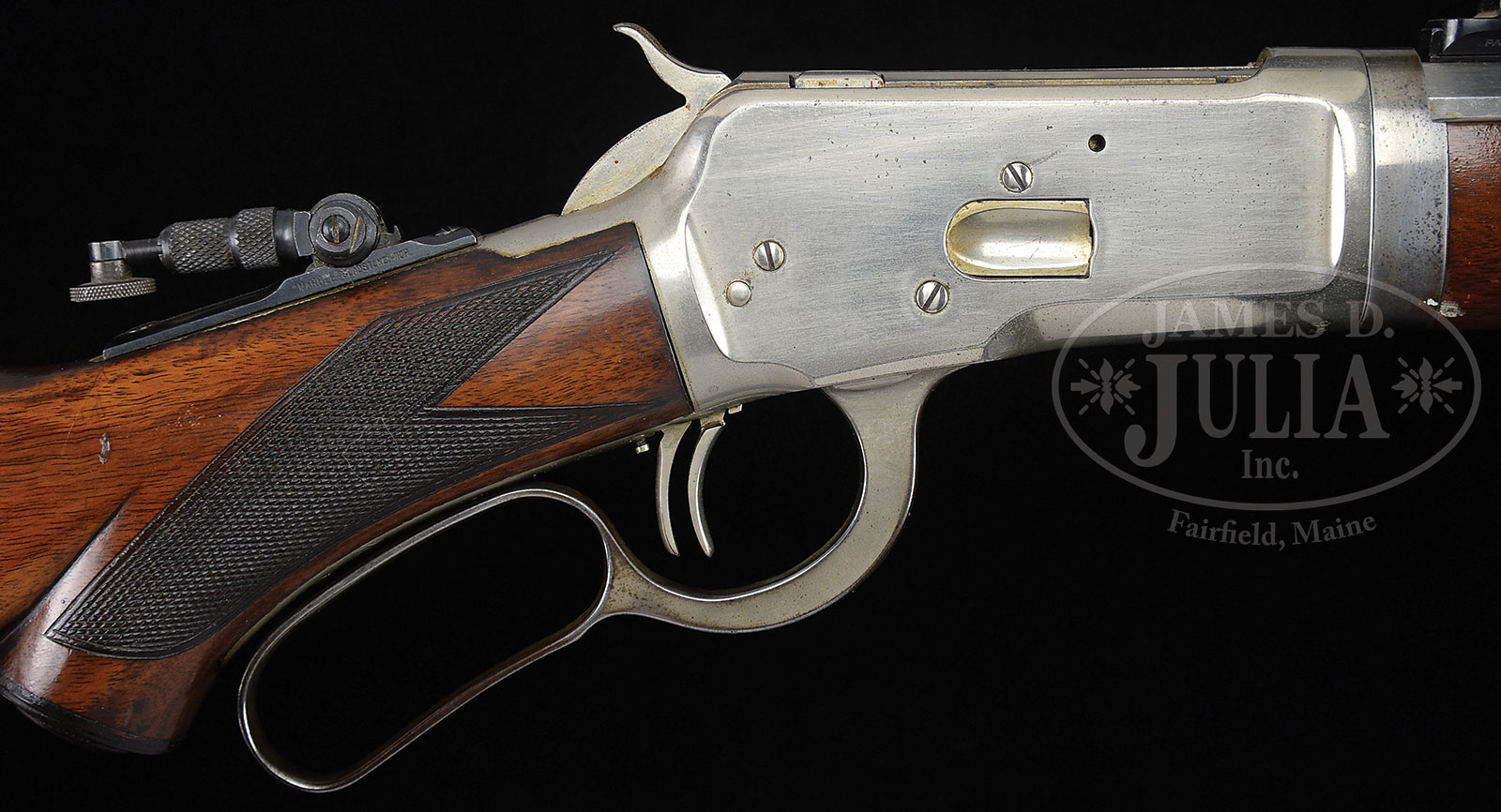 *SCARCE STAINLESS STEEL BARREL WINCHESTER MODEL 1892 NICKEL PLATED TAKEDOWN RIFLE WITH SWISS BUTTPLATE.SN 997695. Cal. 25-20 WCF. 24-3/8″ Stainless Steel octagon bbl marked on left side “MODEL 92 WINCHESTER 25-20 WCF” is also marked with “STAINLESS STEEL”. Mounted with period Winchester A5 telescopic sight and mounts that were later added. Extra holes in the bbl. Original proof mark on top flat of bbl was drilled and tapped for threads for a scope mount and another proof mark added on left flat next to takedown collar. Combination Lyman globe front sight and Winchester Express rear sight. Also so mounted on upper tang is a Marbles tang sight. Nickel mag tube with forearm cap. Nickel receiver. Takedown collar is absent of any nickel. It is polished to make it look like nickel. Swiss-style buttplate is also nickel as is hammer and lever with close coupled double set triggers. Stock fitted with cheekpiece. Pistol grip “I” pattern checkering. PROVENANCE: The spectacular collections of Ray Bentley featuring the finest and rarest deluxe antique Winchesters in the world. CONDITION: Very good. Oct. bbl has no Japanned finish remaining having been polished bright. Markings are sharp. Mag tube retains 96% nickel. Forearm cap 98% nickel and receiver with 94-95% nickel. Nickel appears of the period and is Winchester factory quality and correct to gun. Stock of American straight grain walnut as the lower tang is not marked with any “X” of grade. Some surfaces scratches and small amount of splinters of wood next to left side of receiver. No cracks are visible on top or lower tang. Cheekpiece is late Winchester style that sets off the rifle handsomely. Forearm with light impressions on bottom and sides. No splinters are visible or gouges indicated. Forearm cap fits well and forearm fits well into takedown collar. Double set triggers function correctly. Bright bore. Crisp mechanics. This rare rifle is in the “no records” serial range but is very likely factory original with issues as noted. 53091-186 MS (10,000-15,000) C&R – Lot 2066