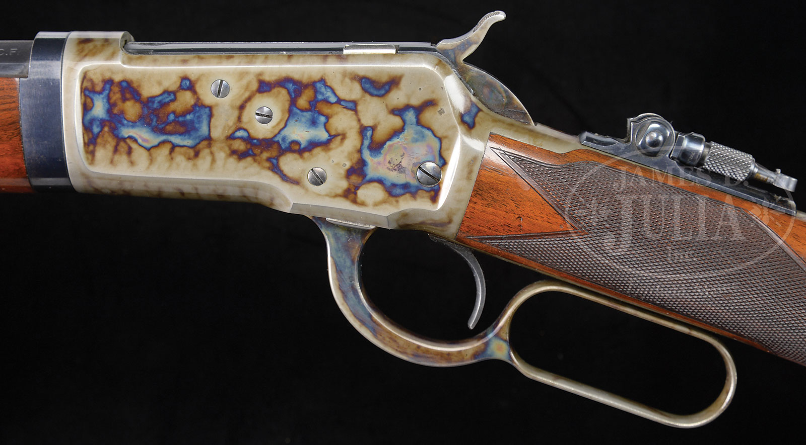MAGNIFICENT WINCHESTER MODEL 1892 DELUXE RIFLE WITH MATTED BARREL AND FACTORY LETTER.SN 39617. Cal. 32 WCF. 24-3/8″ full oct bbl. Fully matted top flat, even over standard 2-line bbl address. Full length mag tube with takedown lever and collar. Mounted with Lyman tang sight, Rear combination folding leaf sight and Lyman ivory bead 5-1 front sight. Case hardened take-down receiver with hardened hammer, lever and crescent buttplate. Rifle equipped with deluxe fancy American walnut pistol grip stock and forearm that will grade XXX with very fine checkering. Accompanied by Winchester Factory Letter confirming all special order features and ship date of March 12, 1895. PROVENANCE: The spectacular collections of Ray Bentley featuring the finest and rarest deluxe antique Winchesters in the world. CONDITION: Extremely fine overall. Hammer and lever match the same condition, with nose cap and buttplate the same extremely fine. 99% blue on breech bolt, with 99% bright nitre blue on extractor. 99% nitre remains on loading gate. 98% blue on trigger. All screws heads are in correct alignment. 99% finish remain on wood stock and forend and has a warm orange patina from proper storage over time. Wood to metal fit is superb with no gaps, splits or chips. Only a few small compressions on bottom of stock. Bright shiny bore. Mechanics are fine. This rifle is about as perfect as one can find. It is in superb excellent plus condition throughout and would be difficult if not impossible to upgrade. Special Note: This item(s) contains plant or animal properties that may be covered by the Endangered Species Act (ESA). Please read the Conditions of Sale, section 15, for more information regarding the Endangered Species Act, and your responsibilities as a buyer. 53091-188 MS (35,000-45,000) ESA – Lot 2061