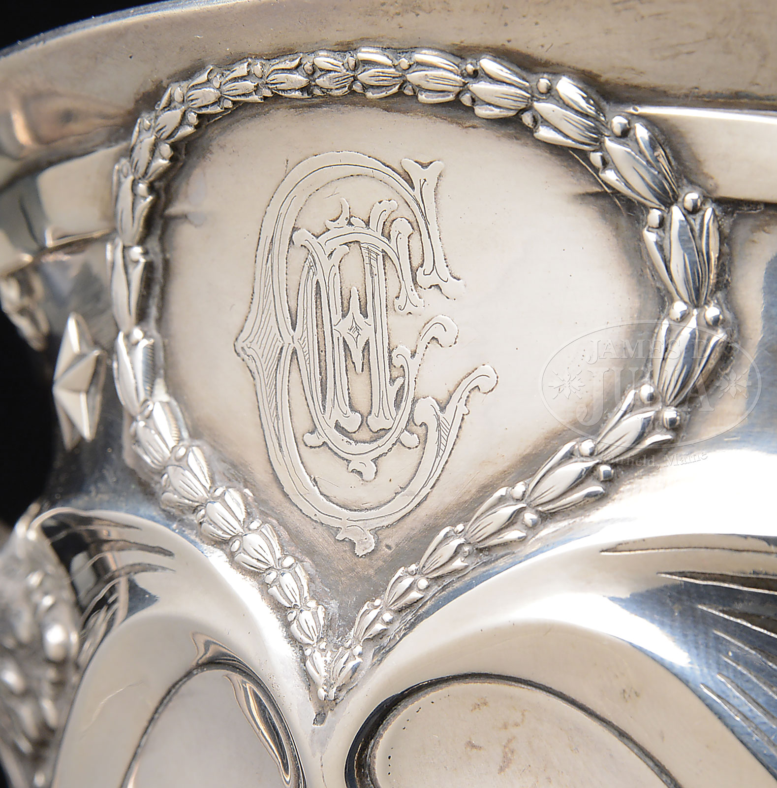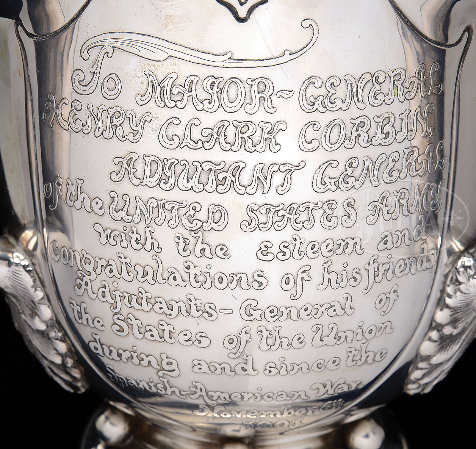 FANTASTIC TIFFANY PRESENTATION SPANISH-AMERICAN WAR TROPHY TO MAJOR GENERAL HENRY CLARK CORBIN, ADJUTANT GENERAL OF THE UNITED STATES ARMY.Beautiful Tiffany 3-handled cup, 10-1/2″ tall, weighing 50 troy ounces, with three large panels. First, large vignette engraved in relief of General Corbin. Second, new rendition of the newly adopted 1902 Great Seal of the United States. And lastly, 12-line relief presentation: “TO MAJOR GENERAL / HENRY CLARK CORBIN / ADJUTANT GENERAL / OF THE UNITED STATES ARMY / WITH THE ESTEEM AND CONGRATULATIONS / OF HIS FRIENDS / ADJUTANTS – GENERAL OF / THE STATES OF THE UNION / DURING AND SINCE THE / SPANISH AMERICAN WAR / NOVEMBER 6, 1901”. Base is engraved with three patriotic shields and three panoply of arms representing each branch of service: Cavalry, Artillery and Infantry. PROVENANCE: Dr. Richard Zeschke, Phoenix, Arizona, 1979; The spectacular collections of Ray Bentley featuring the finest and rarest deluxe antique Winchesters in the world. CONDITION: Very good to fine. Still retaining about half its gilt in bowl. 53091-237 JS (7,000-9,000) – Lot 2147 Click here to view provenance