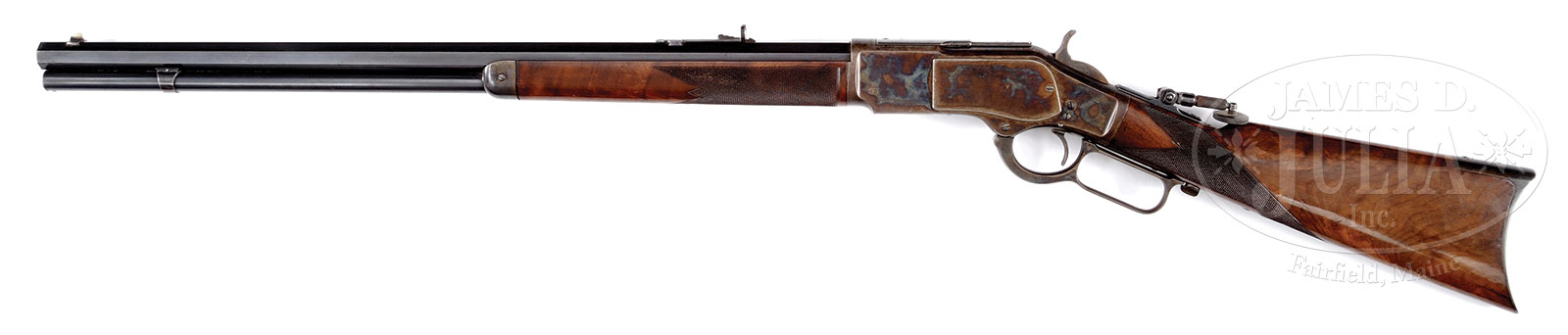 VERY FINE SECOND MODEL 1873 WINCHESTER RIFLE WITH FACTORY DELUXE CHECKERED WALNUT STOCK.SN 50783. Cal. 44-40. 24-3/8″ full oct bbl. Full magazine with standard sights in place. Standard two line address. No cal. marking on top flat of bbl as there are no cal. markings on the carrier lifter. Case colored receiver, blued dust cover along with a case colored hammer and lever. Beautiful straight grip XX deluxe figured American walnut stocks with “H” style checkered pattern. Buttplate is case colored as well. Retains tang sight that may not be the correct type for this model. PROVENANCE: The spectacular collections of Ray Bentley featuring the finest and rarest deluxe antique Winchesters in the world. CONDITION: Very fine. Receiver retains 70% case color with balance turning mottled patina. Nose cap, hammer, lever and buttplate are in similar condition. barrel and mag tube retain 80% blue with some natural toning coming through. Stock retains the majority of what looks to be its orig finish with a few surface scratches and impression that really doesn’t take away from its overall condition. Buttplate fits excellent as the stock fits the receiver as well. Forearm is 90% finish with very few scratches or impressions. Forearm fit to the receiver is excellent with a slight gap in between the nose cap and the forearm. Screw heads retain unturned look with the exception of the side plate screw which is burred. Mechanics are crisp, bore is bright and shiny. A lovely Second Model 1873 Winchester rifle for the connoisseur. 53091-43 MS (15,000-20,000) – Lot 2033