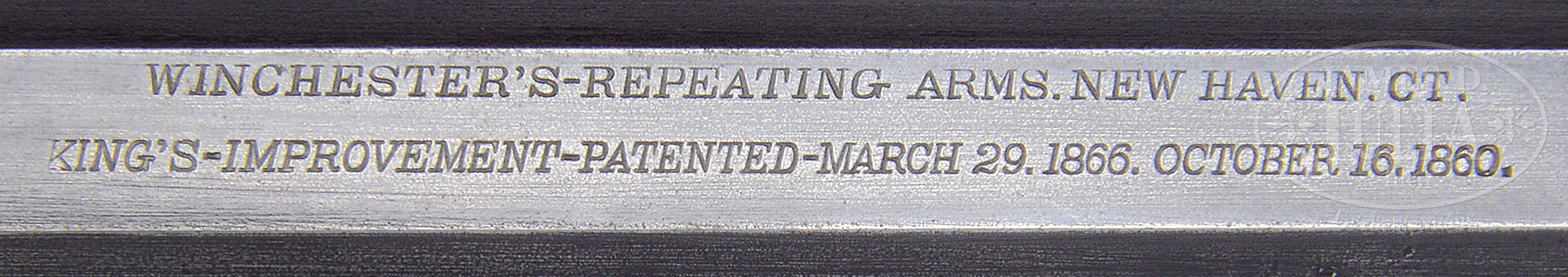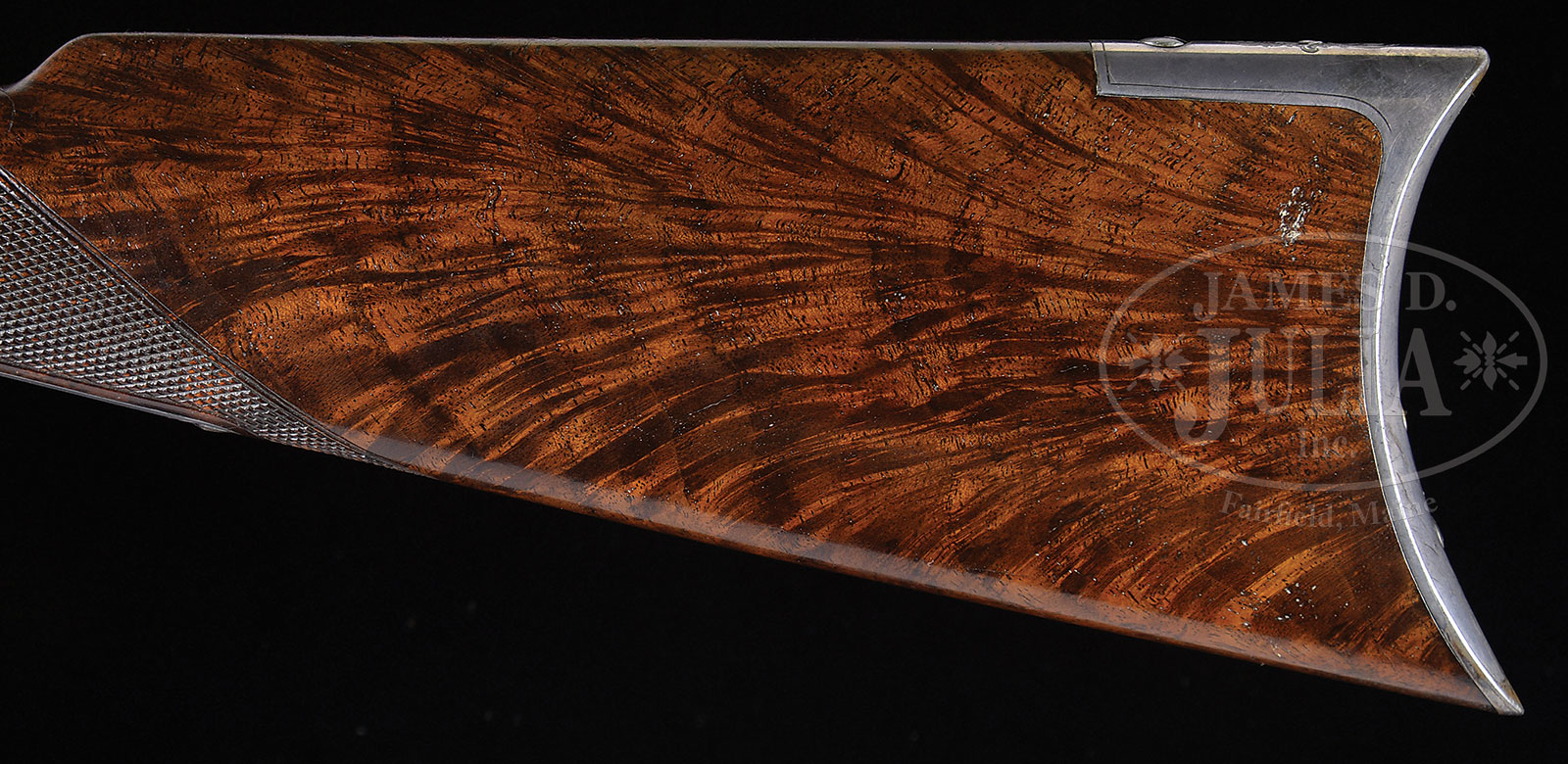 MAGNIFICENT SILVER PLATED WINCHESTER MODEL 1873 FIRST MODEL DELUXE RIFLE FACTORY ENGRAVED WITH PANEL SCENES BY THE MASTER JOHN ULRICH.SN 18362. Cal. 44. 28″ bbl with equal length magazine tube. Equipped with a thick base long range veneer tang sight. Receiver has set trigger. Rare straight stock is deluxe figured 2X American walnut with early style matching checkered forearm and crescent buttplate with trap. Receiver, side plates, dust cover, forend cap and buttplate tang are beautifully engraved with lovely masterful John Ulrich scrolls. All the panels are surrounded by fine intertwined foliate arabesque patterns that have fine pearled background and light shading. The receiver, dust cover and bottom of the receiver are engraved en suite. Checkered stock and forearm in the early style of the first model range. Profusely scroll engraved with wolf heads on left and right side of receiver unusually elaborate for Ulrich. Silver plated receiver engraved with an elk in circle on the left and right side. Comes with thumb print dust cover and set trigger. Accompanied by a Cody Firearms Records Office search document confirming configuration with special order features: Set Trigger, Checkered Stock, Casehardened, Silver Finish, Engraved. Shipped May 6, 1878. PROVENANCE: The spectacular collections of Ray Bentley featuring the finest and rarest deluxe antique Winchesters in the world. CONDITION: Very fine. Bbl retains most of its orig finish to about 95% and 90 to 95% on magazine tube. Finish on left side receiver retains 98% original Winchester factory silver plating with the right side equally excellent. Lever with muted case colors on the side and bottom and strong colors in protected area. Hammer has 90% plus colors remaining indicating this magnificent rifle has seen little or no use and was cared for throughout more than 125 years. Buttplate has 90% original factory silver plating. Stock is with some minor impressions on the left side, more evident on the bottom than on the side. Stock fit is excellent with no chips or pieces missing. Forearm has a very light crack on the upper left side. Silver plating is starting to turn a most attractive bluish color indicating that it has not been cleaned or polished. Action is crisp and bore has strong rifling of the early style five land/groove. Serial number 18362 is a well known example of some of John Ulrich’s best engraving and is suitable for the most advanced Winchester collection or collector of deluxe engraved American firearms. Using the words of the immortal R.L. Wilson this lovely rifle is truly a ‘steel canvas’. 53091-46 MS (60,000-90,000) – Lot 2015 Click here to view provenance