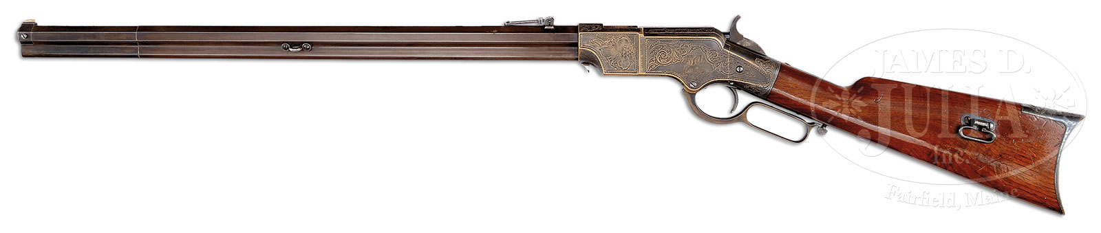 SPECTACULAR HOGGSON ENGRAVED AND SILVER PLATED HENRY RIFLE.SN 7008. Cal. 44RF Henry. Beautiful late Henry rifle with 24-1/4″ oct bbl that has integral magazine tube, late style, square back nickel silver front sight and 900 yard Henry ladder rear sight with slide stop screw. Top flat of the bbl has the later large font 2-line Henry’s Patent date and the New Haven Arms Co address. Mounted with very nicely figured, uncheckered American walnut with fine factory finish. Left side of buttstock has a factory sling swivel with corresponding sling loop in the left gullet of the bbl. Receiver is silver plated and engraved by Samuel Hoggson with his trademark deer leaping a rail fence on the left sideplate surrounded by foliate arabesque patterns that have pearled background. Right side of the receiver and sideplate, both front side panels, rear edges of the receiver, top 3 flats of the receiver and buttplate tang are engraved to match. Number on stock matches buttplate and lower left side tang “7008” same as SN. PROVENANCE: The spectacular collections of Ray Bentley featuring the finest and rarest deluxe antique Winchesters in the world. CONDITION: Very fine. Oct bbl retains 20-30% blue in protected areas with balance being light to dark patina. Edges are sharp, address is clear with minor dings anywhere on bbl. Receiver retains 85% of plating on left side with 85-90% on right side. Lower tang area retains 90-95% of the silver plating. Bottom of stock has multi impressions with a few scratches and no missing wood or chips present. Hammer and lever are dark patina color with dark case colors on back side of hammer with balance being patina; lever has mostly a dark patina color. Rifle cycles correctly. Bore with strong rifling and some minor pitting. Mechanics are crisp. 53091-6 MS (80,000-100,000) – Lot 2006