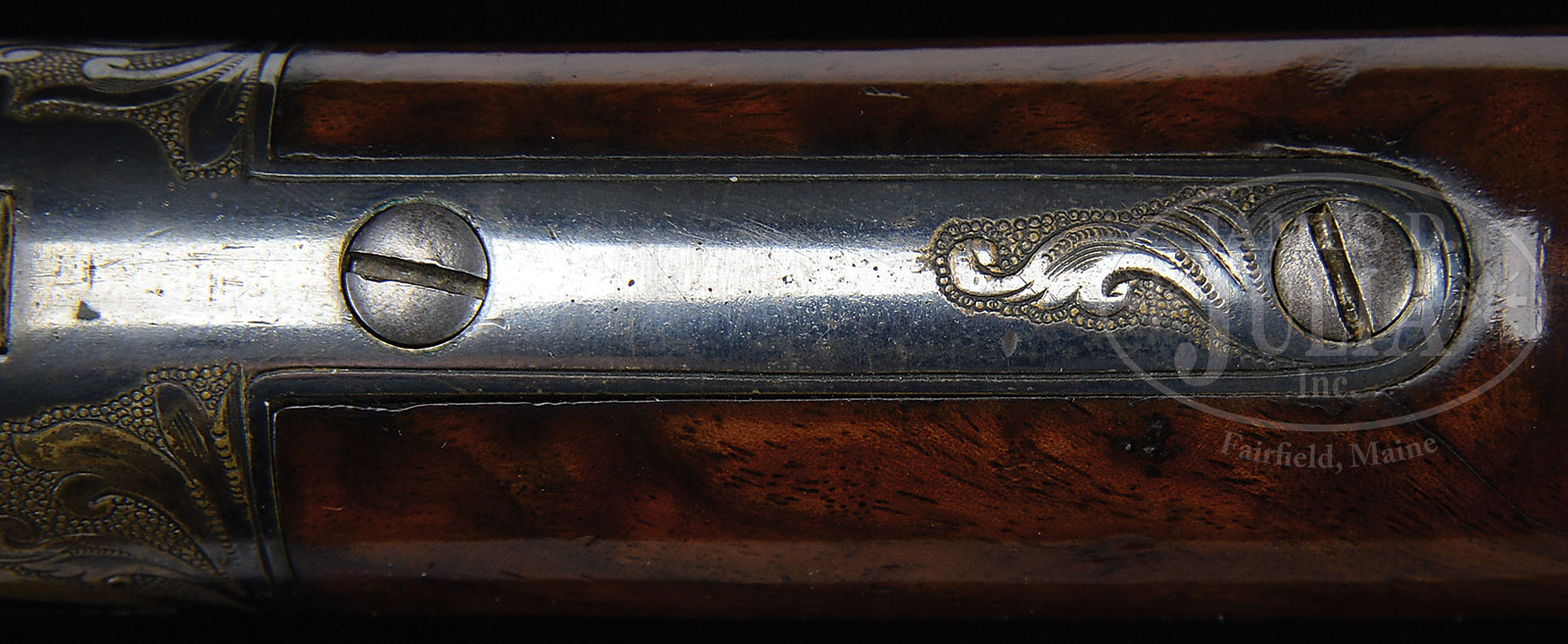 SCARCE AND DESIRABLE HOGGSON FACTORY ENGRAVED HENRY MODEL 1860 LEVER ACTION RIFLE WITH LOVELY DELUXE FIGURED WALNUT STOCK.SN 4522. Cal. 44 RF Henry. 24-1/4″ oct bbl that has integral magazine tube, late style square back German silver front sight and 900 yd. Henry ladder rear sight. It is mounted with exceptional, highly figured, uncheckered, American walnut with 1st type brass buttplate with rnd heel & trap with small hole. Left side of buttstock & left side of bbl have factory sling loops. Buttplate screws are matching numbered while two of the tang screws are properly unnumbered. The bottom tang wood screw is a replacement numbered “1947”. Receiver & buttplate tang are engraved by Samuel J. Hoggson in his typical style consisting of a running buck deer surrounded by foliate arabesque patterns on the left side with line & chip pattern borders. Right side of the receiver is engraved in his beautiful matching foliate arabesque patterns with both front side flats engraved in his very identifiable large flower blossoms. Matching foliate arabesque patterns are engraved on top 3 flats of receiver, around rear edges of receiver, on the top tang and buttplate tang. All matching serial numbers are found on the top bbl flat between rear sight & receiver, left side of lower tang under the wood, inside top tang channel of buttstock and inside toe of buttplate. Round part of bbl underloading sleeve is marked with the assembly number “630”, which number is also found on rear face of loading sleeve. This rifle was produced in 1864 during the height of the Civil War when virtually all Henry rifles were purchased for use in the war. PROVENANCE: Woody Frey Collection; The spectacular collections of Ray Bentley featuring the finest and rarest deluxe antique Winchesters in the world. CONDITION: Very fine, all orig and all matching, except one tang screw as noted. Bbl & magazine tube retain a silver brown patina with a couple of minor nicks & scratches. Receiver retains 70-75% strong orig silver-plating that has turned black with oxidation. Lever screw and breech block spring screw are both marred up quite a bit. Buttplate retains about 20% silver-plating with all the exposed gun metal a dark brass patina. Stock has a hairline back of the top tang, otherwise is sound with light nicks, dings & scratches and retains most of a protective coating of varnish. Mechanics are crisp, strong bright bore with light to moderate pitting. A beautiful quite early factory engraved Henry and not one of the frequently encountered aftermarket embellished rifles. 53091-83 MS (40,000-60,000) – Lot 2005