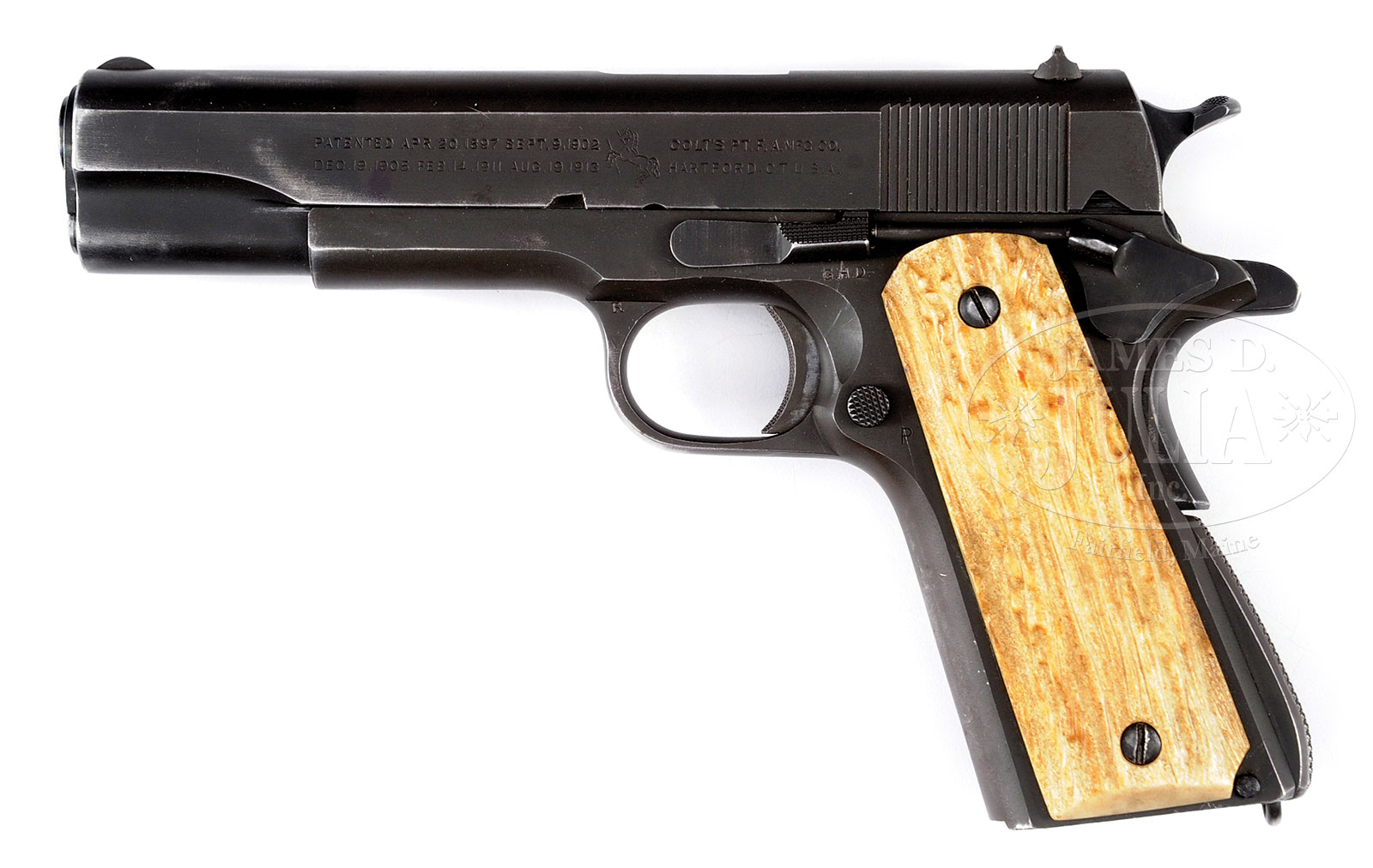 *IMPORTANT COLT 1911A1 ARMY MARKED PISTOL WITH CONNECTION TO GENERAL GEORGE S. PATTON.SN 850750. (1943) Cal. 45 ACP 5″ bbl. Left slide markings has Colt’s standard 1913 last patent date followed by Rampant Colt and Colt’s standard Hartford address. Front sight is thin and rounded, rear sight is flat with rounded notch. “P” marked in front of rear sight. Receiver marked “UNITED STATES PROPERTY/SN”. Ordnance stamp to rear of right side marked “M1911 A1 U.S.ARMY” in front of slide stop hole. Short milled checkered trigger. Slide stop is 1911 type without recess cut under checkering. Hammer is wide spur 1911 A1 type. Thumb safety is late checkered 1911 A1 type. Grip safety has long tang. Main spring housing is checkered with Colt pattern checkering. Stocks appear to be made of some type of antler. Stock screws show some degradation in slots. Number under firing pin stop plate matches SN. Shadow on firing pin stop plate matches SN. Bbl is “COLT .45 AUTO” marked with small “G” ahead of lug. No mag present. Accompanied by a 1974 dated letter from Dr. B.P. Cardon who states that he acquired Colt 1911A1 #850750 from long-time friend Lt Col Alexander C. Stiller who served in Patton’s original Tank Battalion in WWI and later as Patton’s Aide and driver in Europe during WWII. Stiller maintained this pistol along with a special M-1 Garand with 2.5x scope and had these at they ready in Patton’s staff car should he need them. After the war, Cardon and Stiller resumed their friendship and were active in the Army Reserves together in Tucson, AZ. Per Stiller’s request, the Colt was given to Dr. Cardon by Stiller’s wife after his passing in 1962. It was subsequently gifted to Patton admirer, Thomas L. Sezak in 1972, prior to its acquisition by Ray Bentley. PROVENANCE: The spectacular collections of Ray Bentley featuring the finest and rarest deluxe antique Winchesters in the world. CONDITION: Bore is frosted but may clean up some. Receiver bullet ramp shows patina and raw metal. Slide right shows wear on edges. Top of slide shows holster wear at muzzle. Slide left shows moderate holster wear at muzzle and beyond. Receiver right shows typical finish loss on SN from holster stud. Front grip strap and trigger guard shows moderate wear. Main spring housing thinning. Magazine catch lock shows significant damage. Portion of bbl visible through ejection port shows considerable loss of finish. Mechanics are crisp. Overall very good with 90% orig finish remaining. A very attractive gun with connection to General Patton. Correct replacement stocks should be easy to find. 53091-90 KXK (10,000-15,000) C&R – Lot 2123 Click here to view provenance